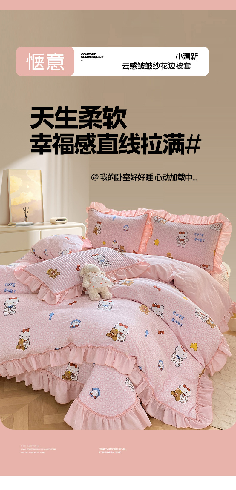 商品名称:眠势力 2026新款韩版双层纱花边被套云感皱皱纱被罩带花边 哈喽猫咪