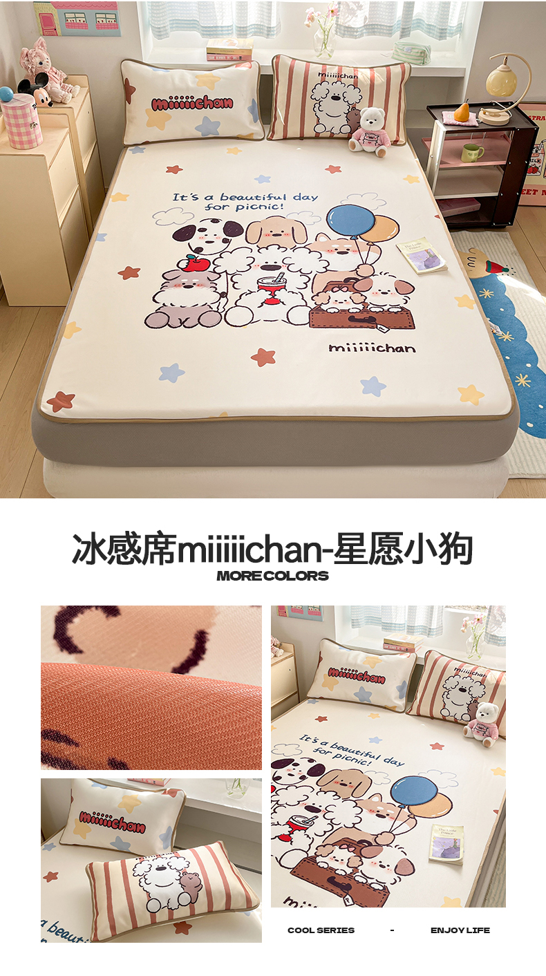 • 91家纺网 家纺一手货源 找家纺 桃子家居 2026新款正版授权miiiiichan大版数码印花1200D凉席三件套平铺床笠 冰感席miiiiichan-星愿小狗