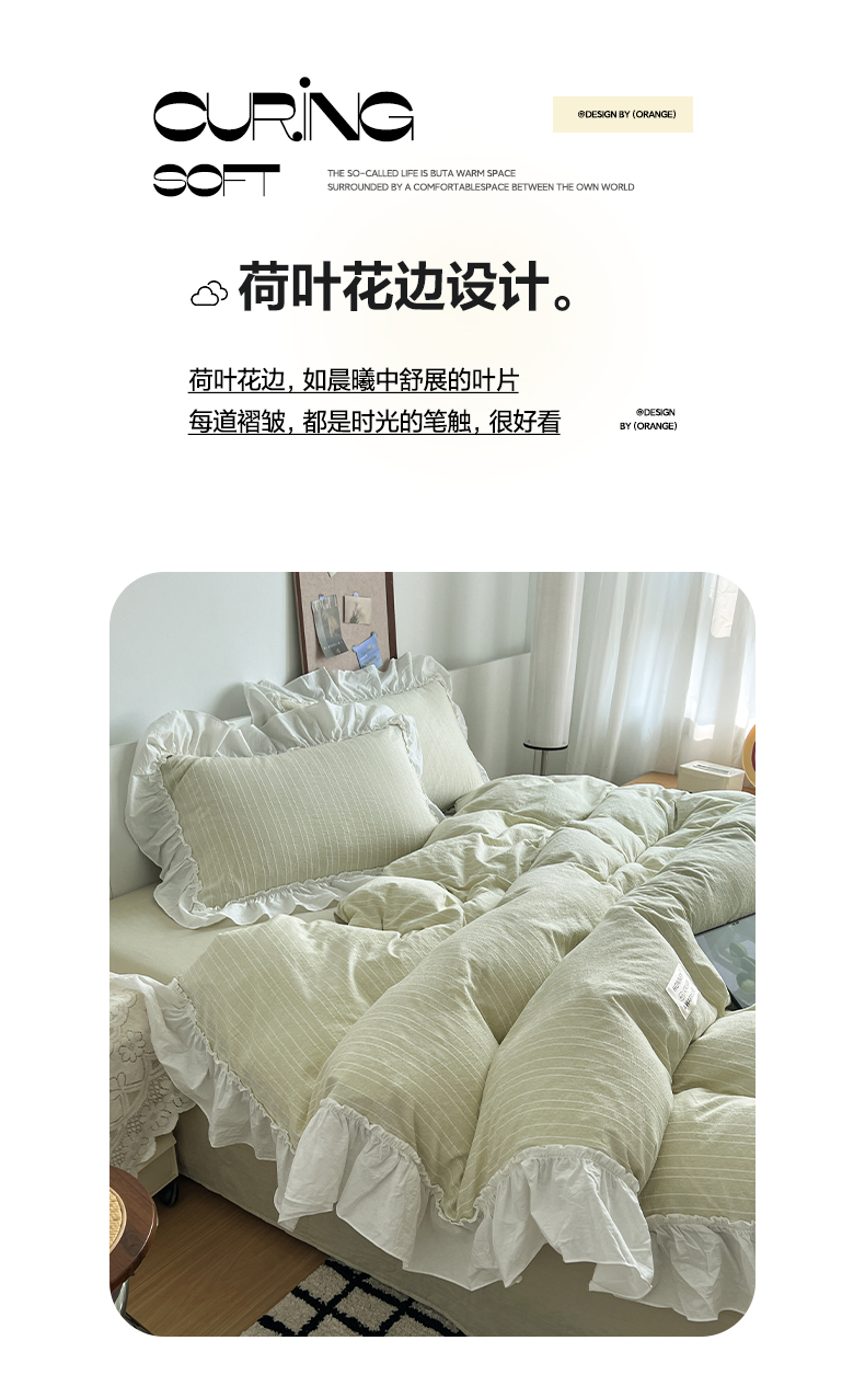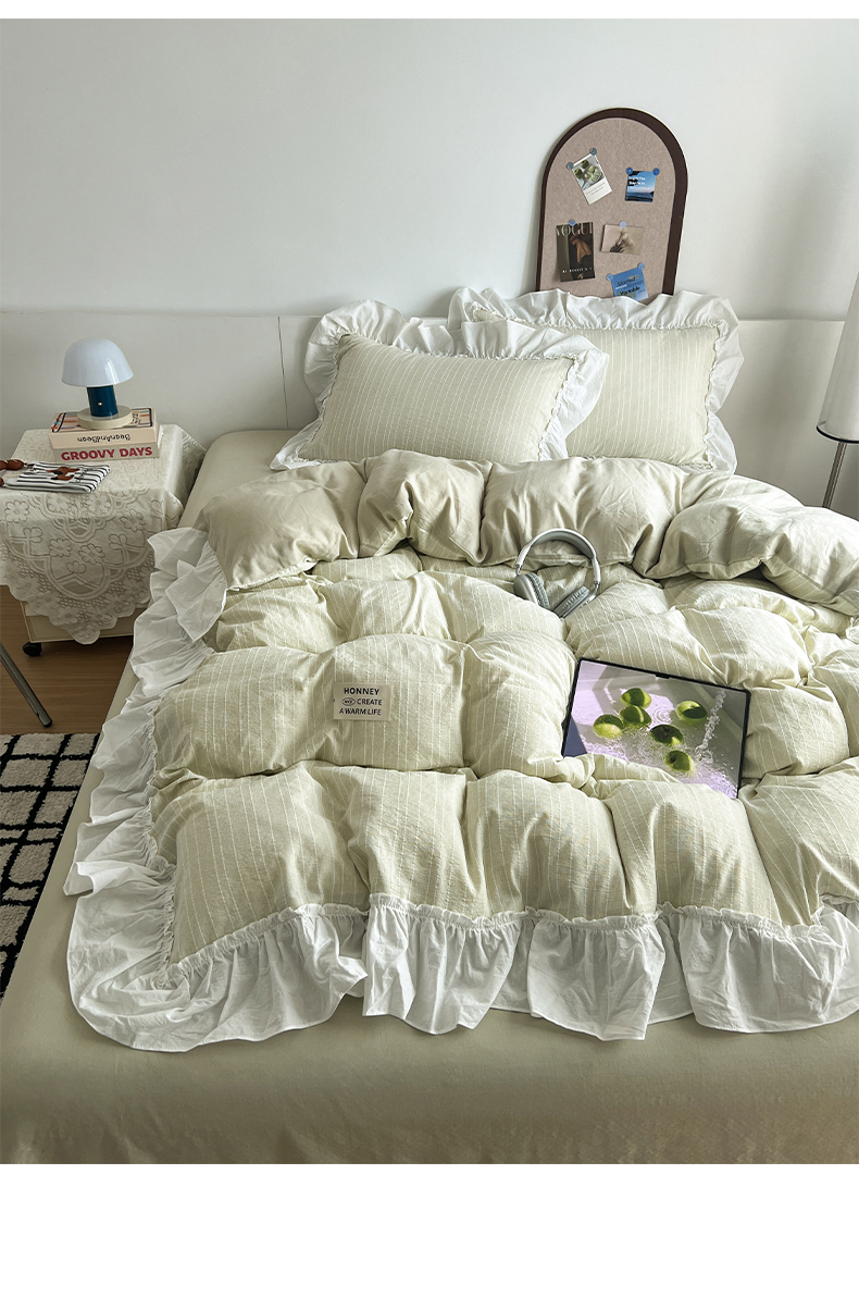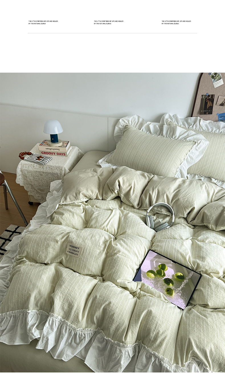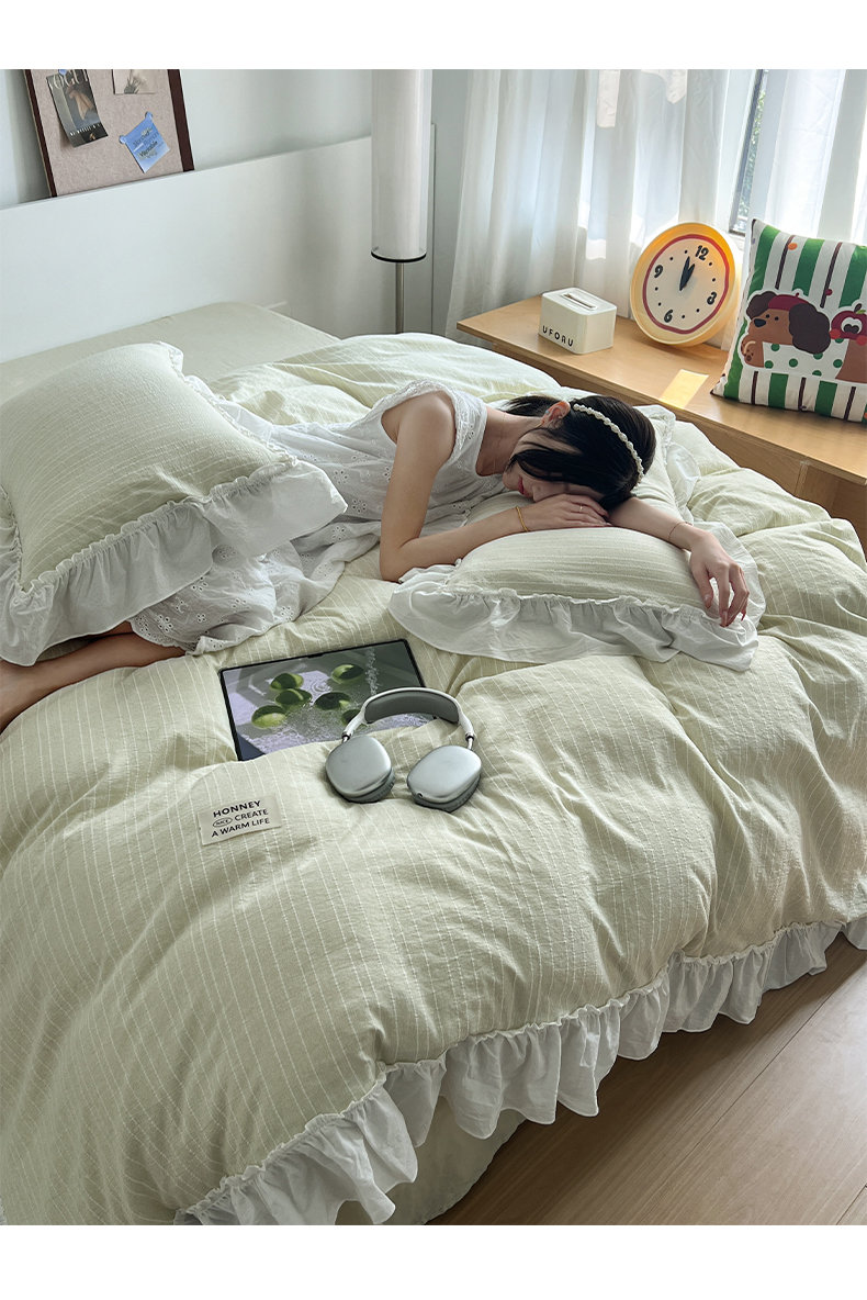 当前位置: 91家纺网 > 商品网购 > 床品套件 > 四件套 > 化纤普通四件套 > 晨曦家纺 2026新款荷叶花边泡芙纱提花四件套可水洗棉四件套少女风 抹茶奶绿