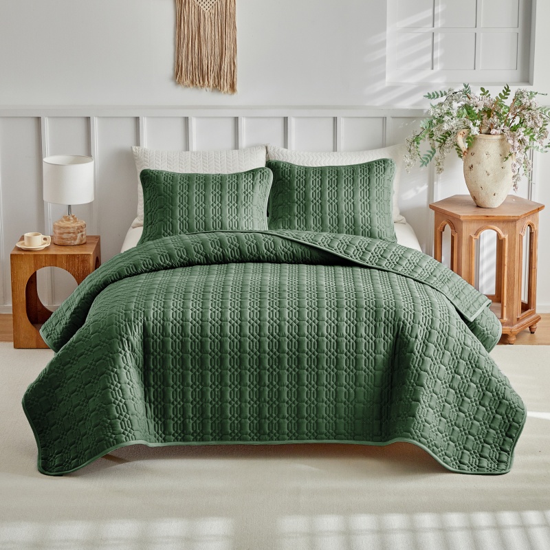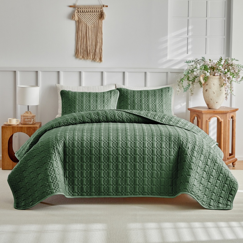 (总)温宁2025新款跨境外贸专供斜方格床盖,绿色,米色,银灰