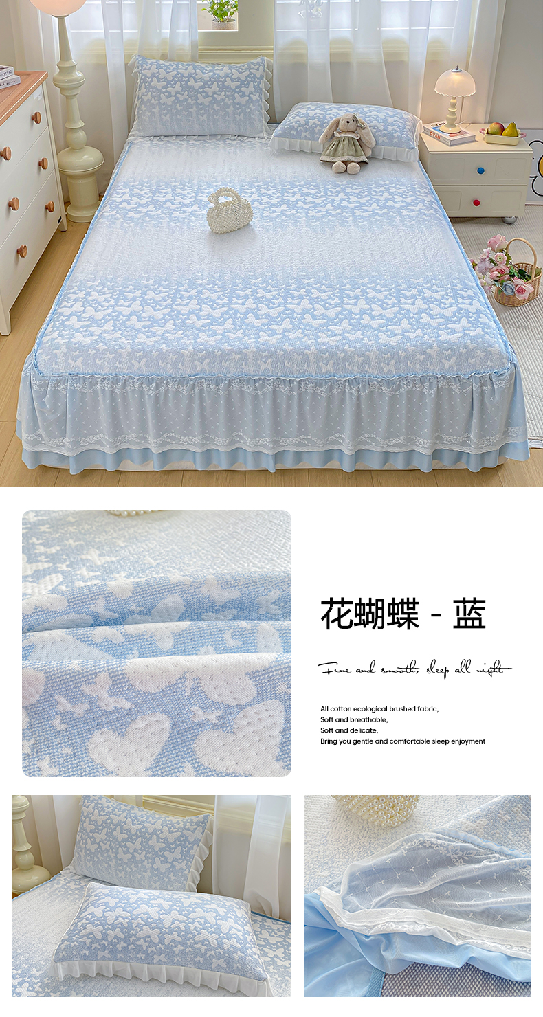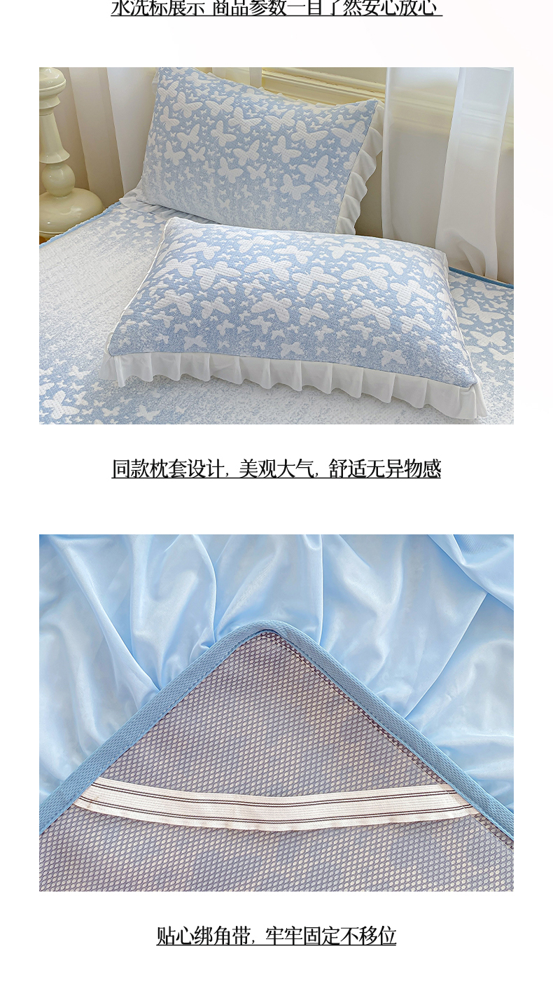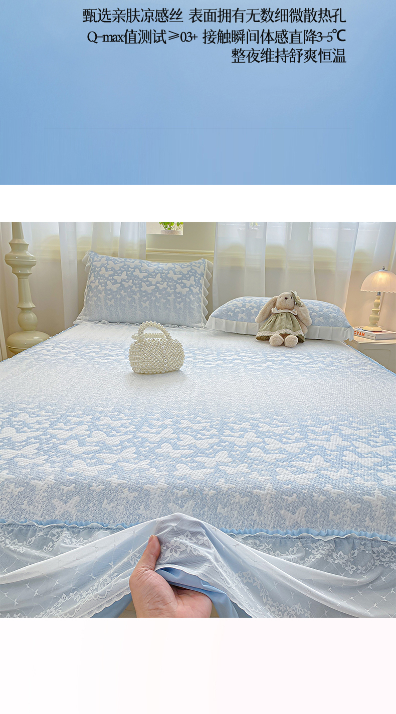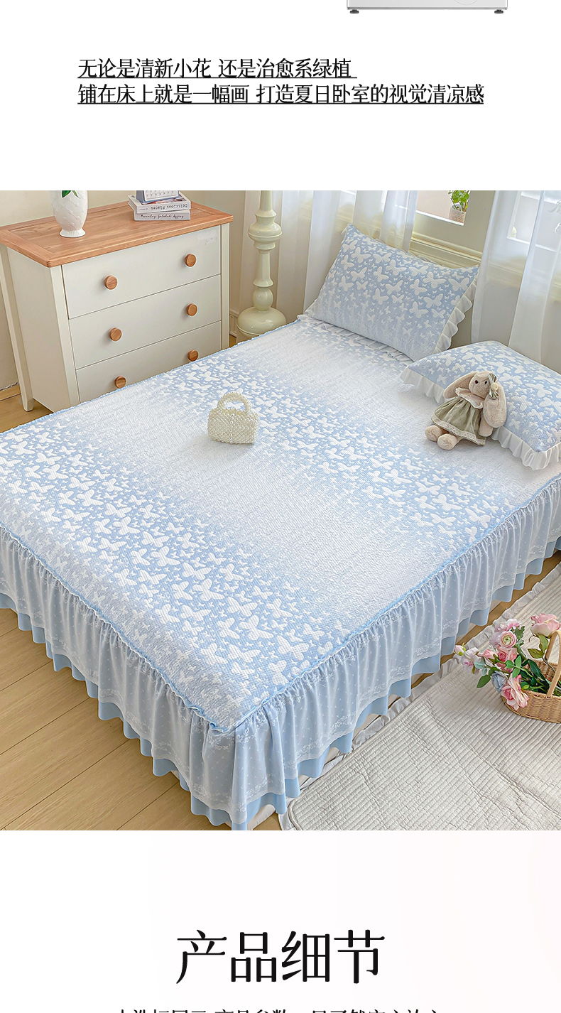 商品名称:伊人坊 2026新款A类550克凉感提花值过0.21冰豆豆家用凉席子三件套夏季-床裙款 花蝴蝶-蓝