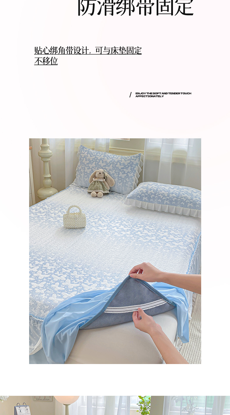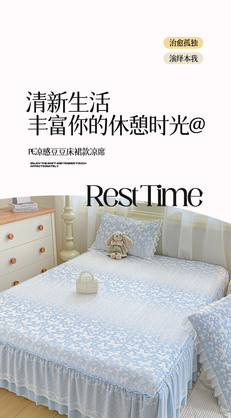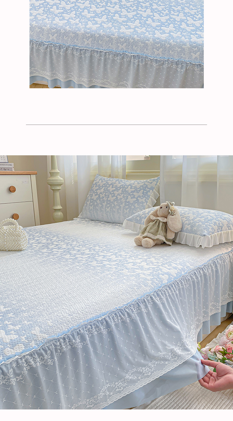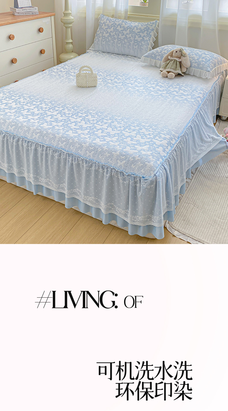 商品名称:伊人坊 2026新款A类550克凉感提花值过0.21冰豆豆家用凉席子三件套夏季-床裙款 花蝴蝶-蓝