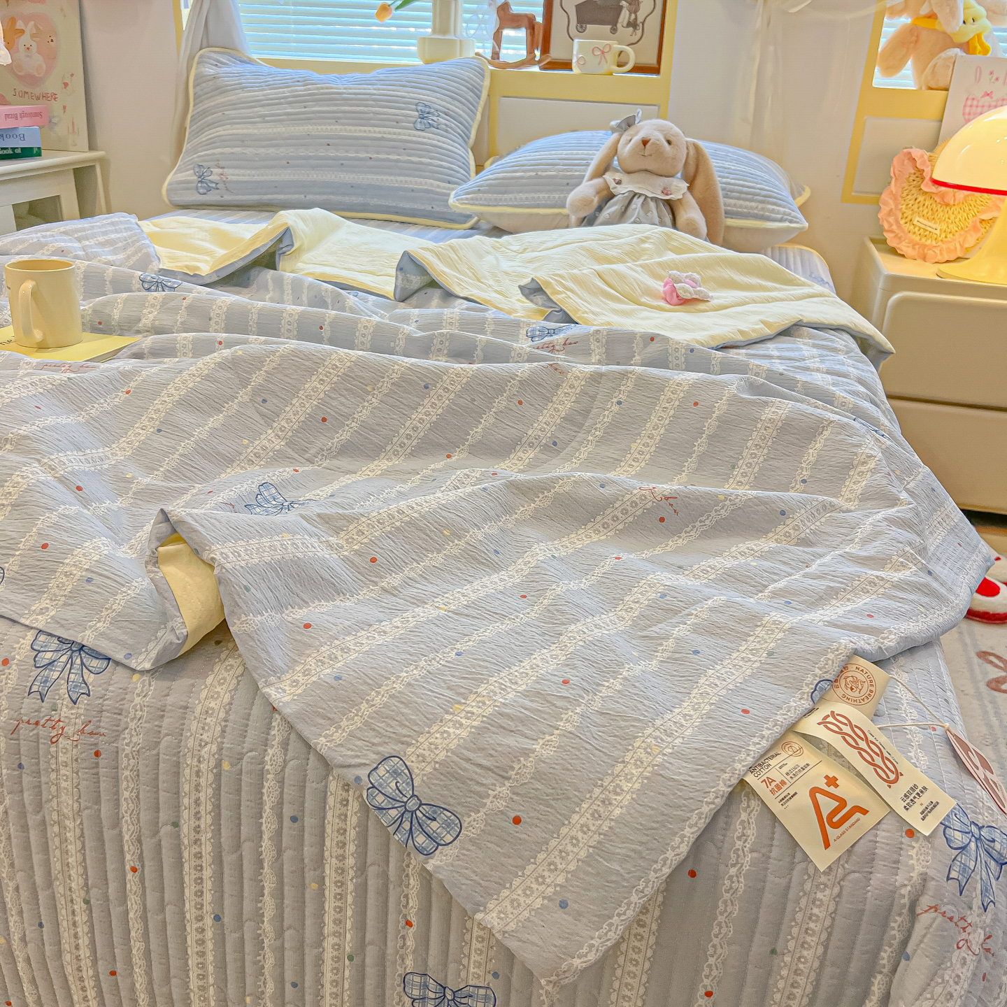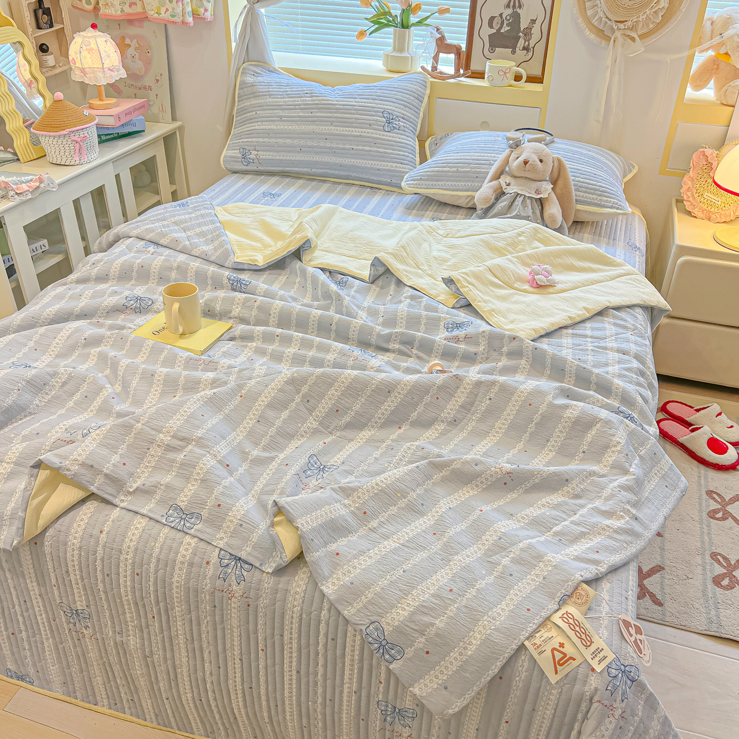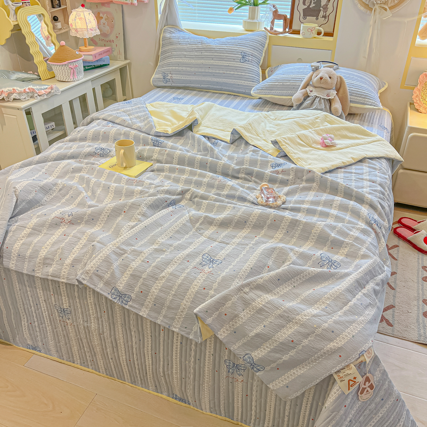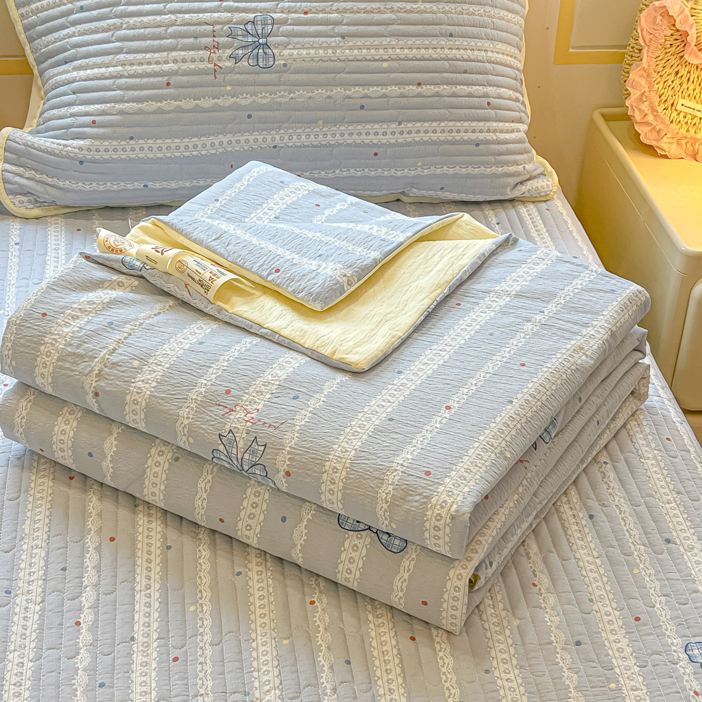 • 91家纺网 家纺一手货源 找家纺 乐逸家纺  2026新款A类云感双层纱夏被床盖四件套 夏日条纹