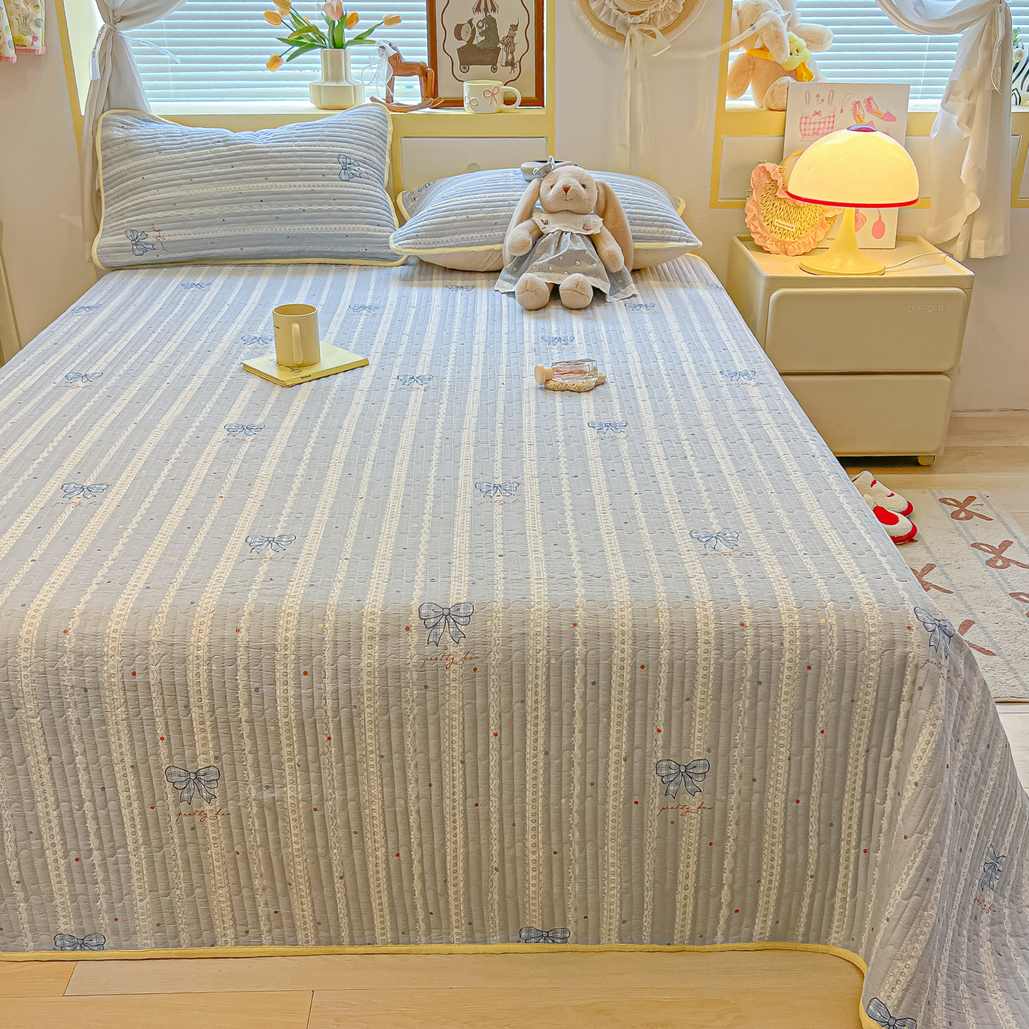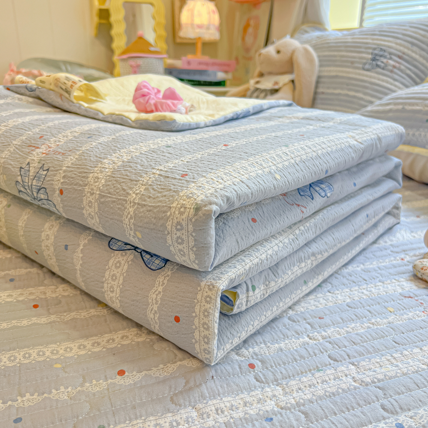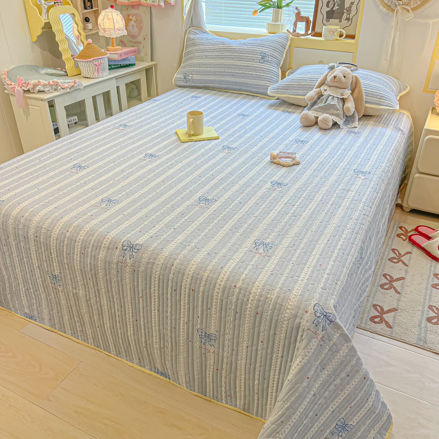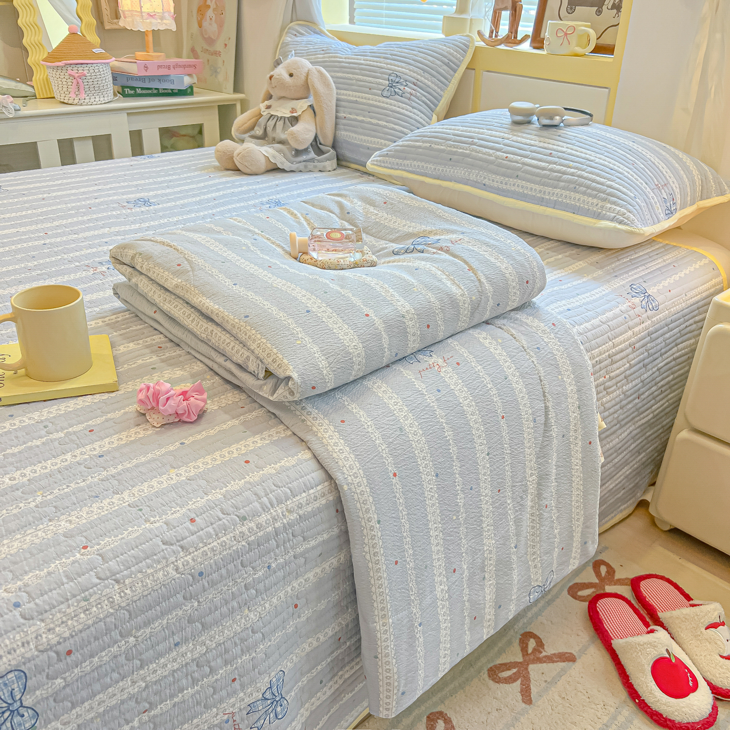 • 91家纺网 家纺一手货源 找家纺 乐逸家纺  2026新款A类云感双层纱夏被床盖四件套 夏日条纹