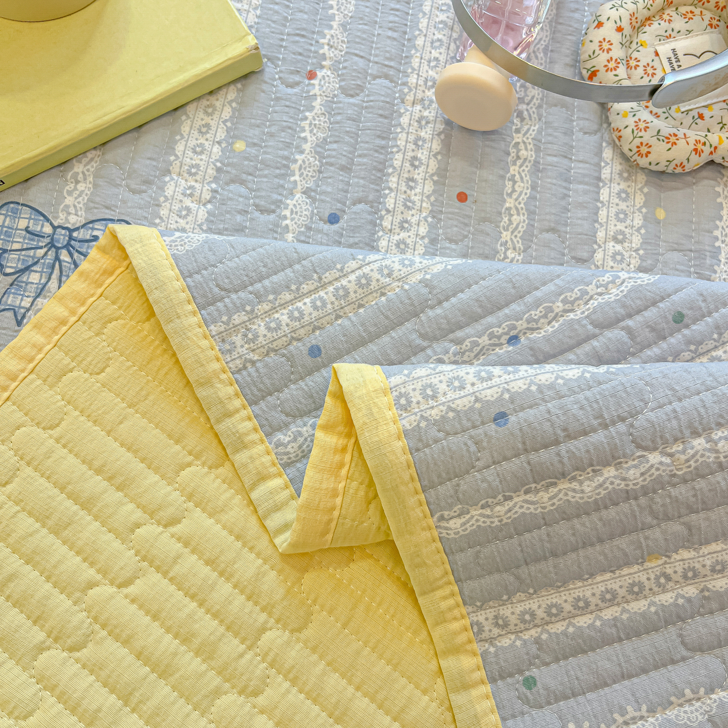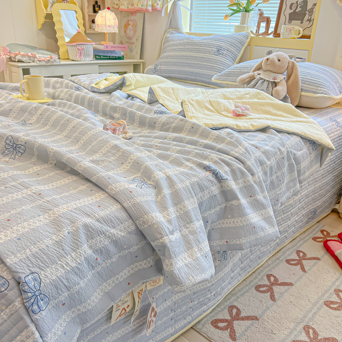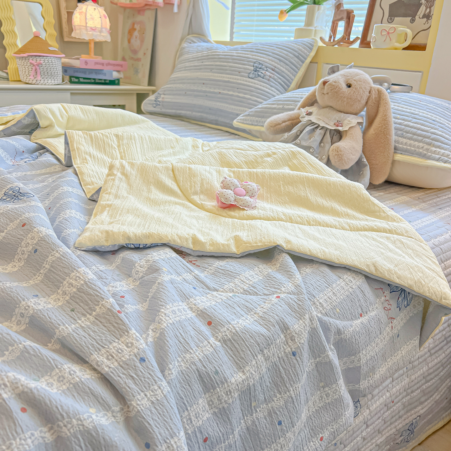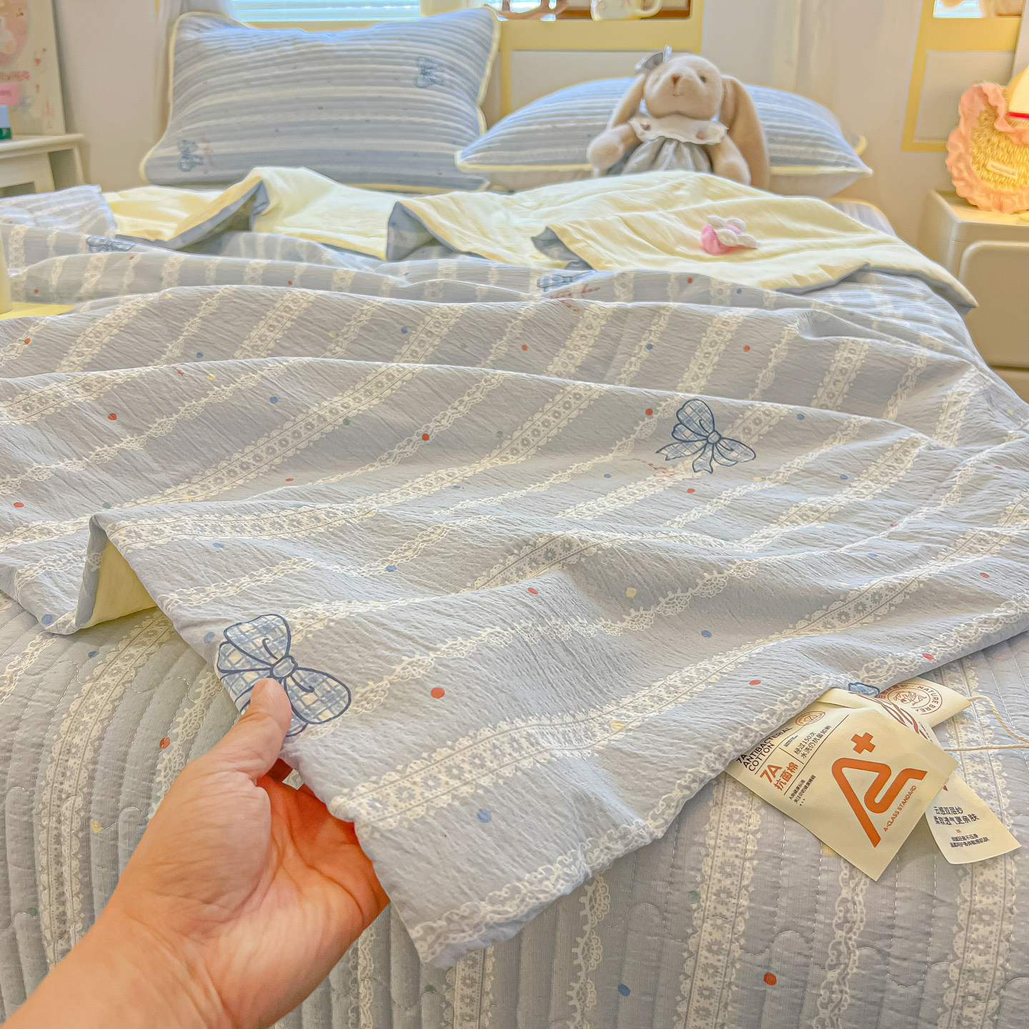 • 91家纺网 家纺一手货源 找家纺 乐逸家纺  2026新款A类云感双层纱夏被床盖四件套 夏日条纹