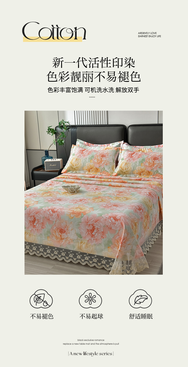 (总)星窝家纺 2025新款水洗棉花边床裙式多功能床盖三件套,经典豆绿,经典粉色,经典灰色,经典橘色,经典蓝色,经典奶白,经典紫色
