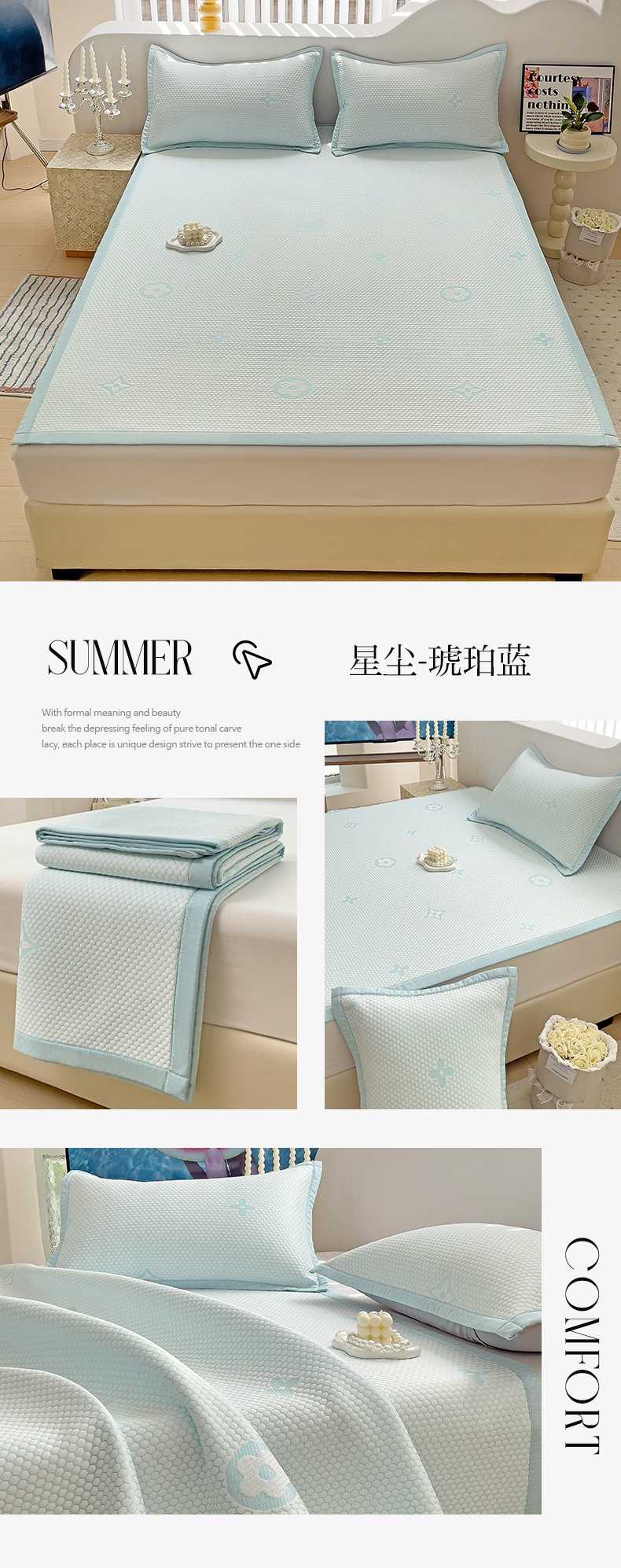 商品名称:逸尚阁 2026新款凉感凉豆豆提花凉席三件套星尘豆豆席 星尘-琥珀蓝