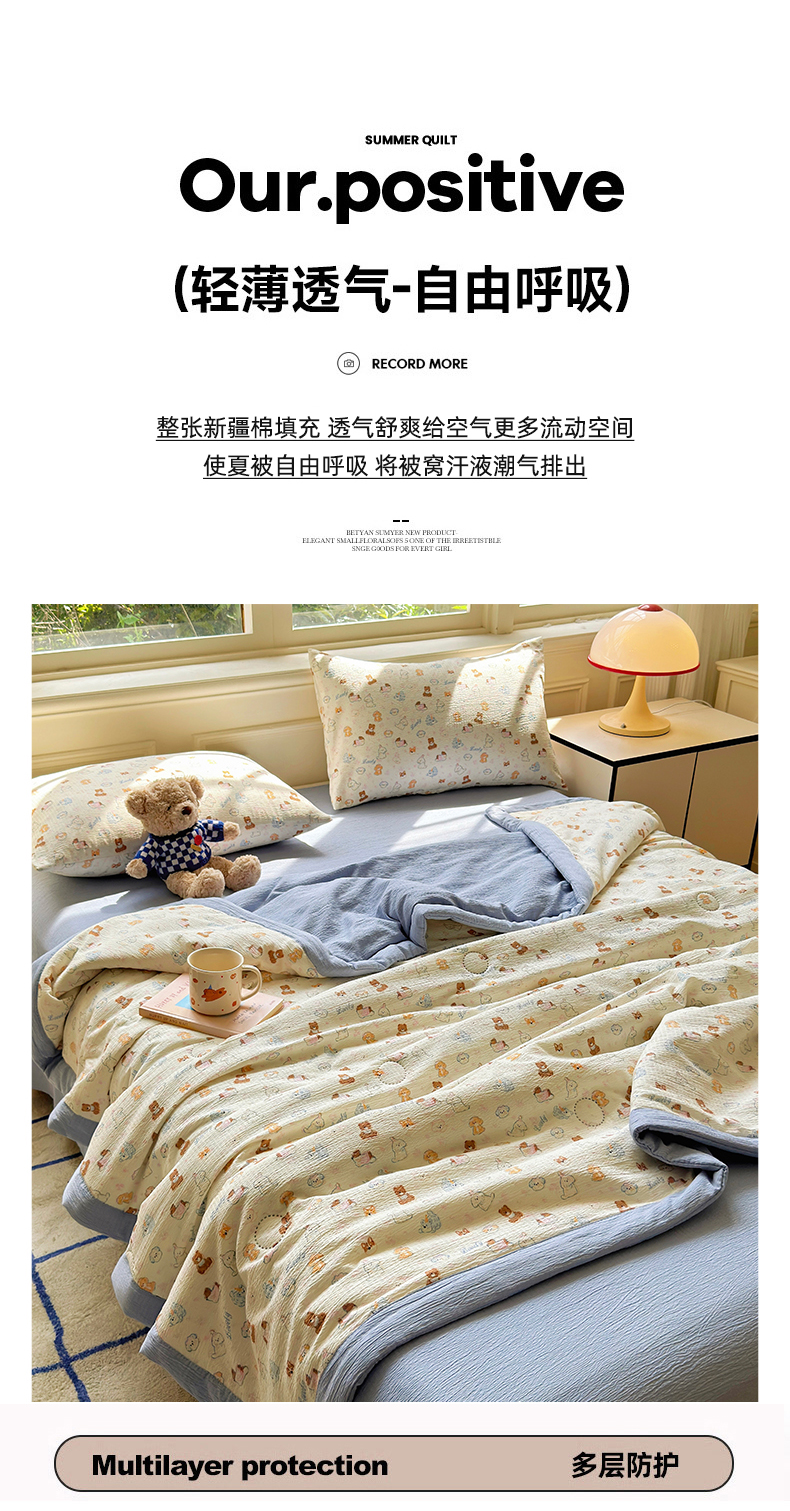 商品名称:几禾 2026新款A类云感双层纱夏被木棉皱皱纱棉花被小清新印花夏被夏凉被费尔岛空调被 顽皮熊蓝