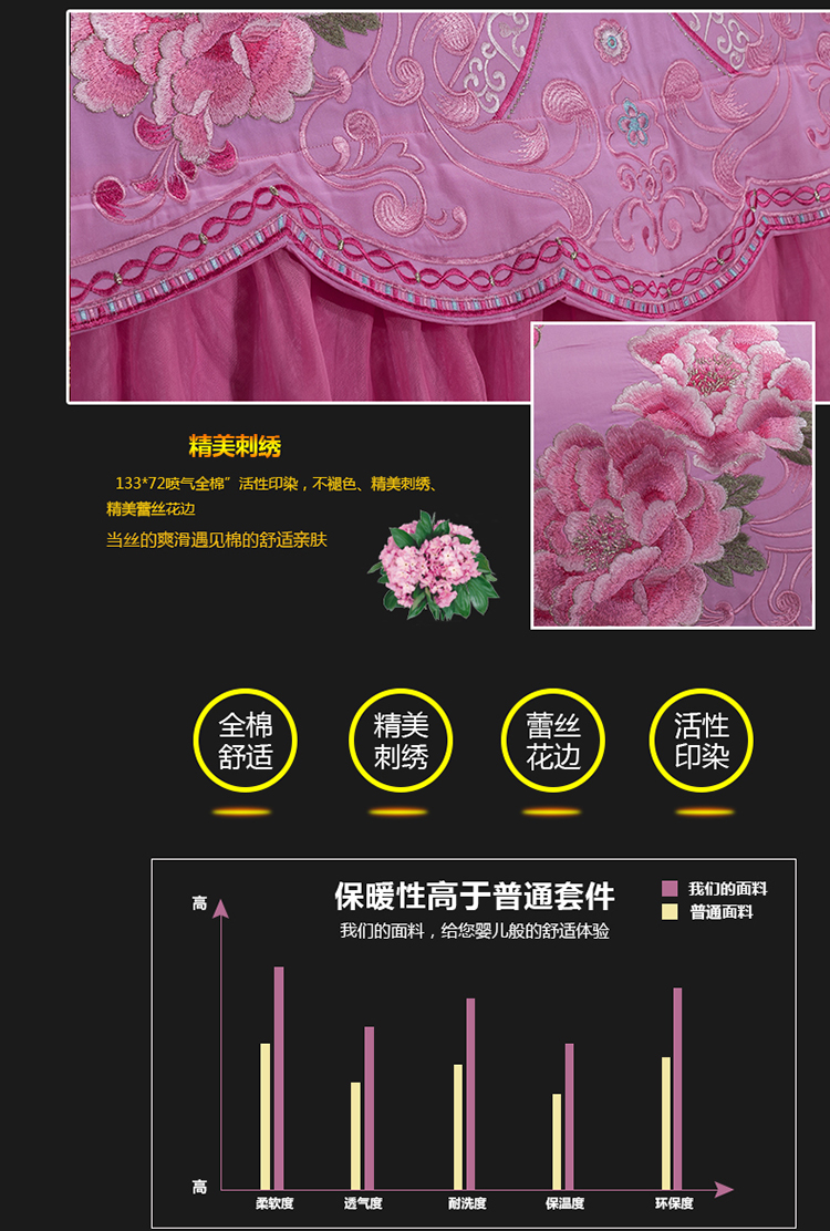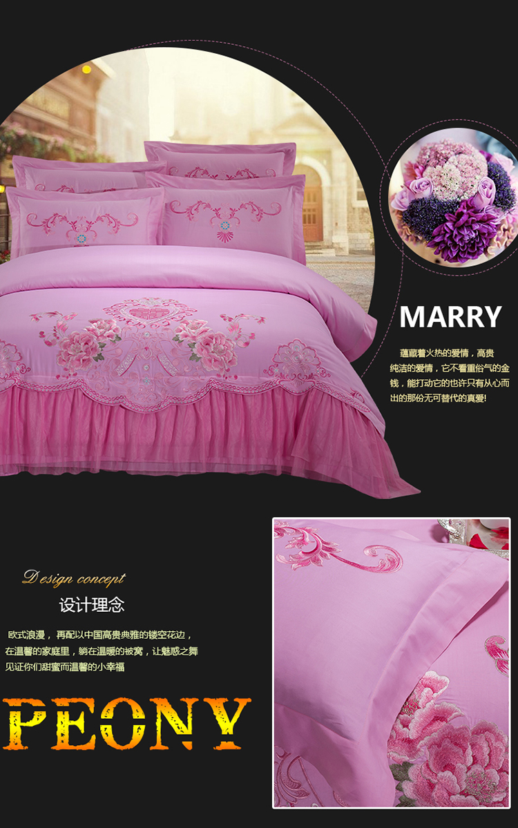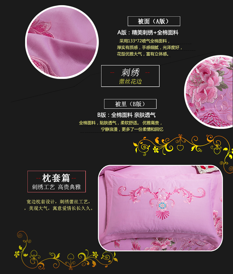 慕她家纺 婚庆四件套大红蕾丝刺绣全棉纯棉花蔓喜多粉红色