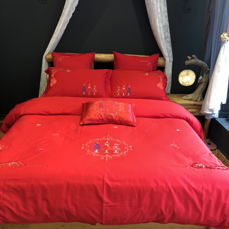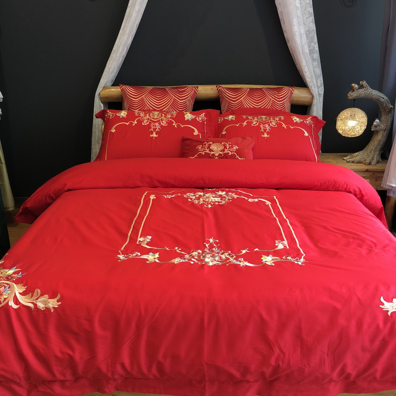 总玖玖爱家纺 新款轻奢风120支贡缎长绒棉高精密刺绣婚嫁系列四件套,欢喜人家,吉祥如意,金色婚典,情定一生,喜迎龙凤