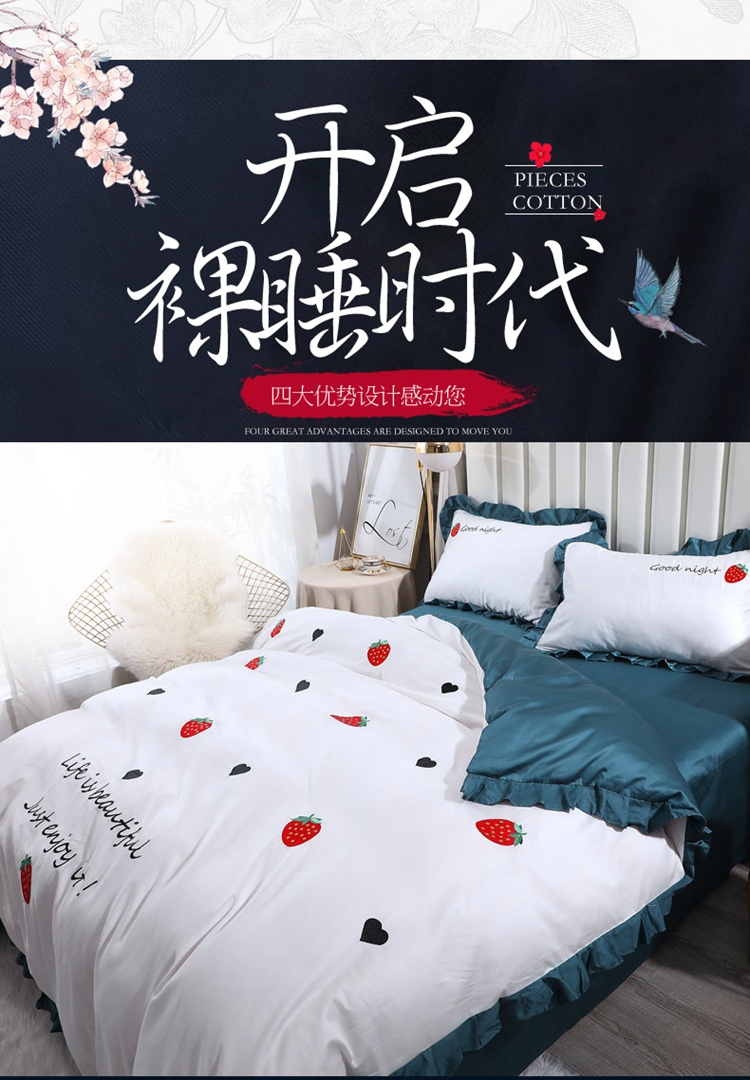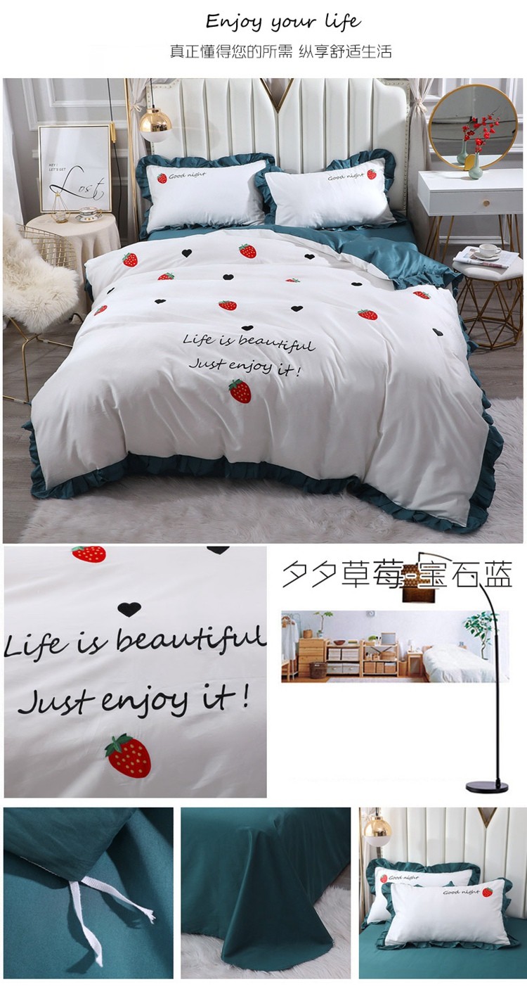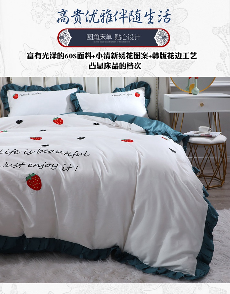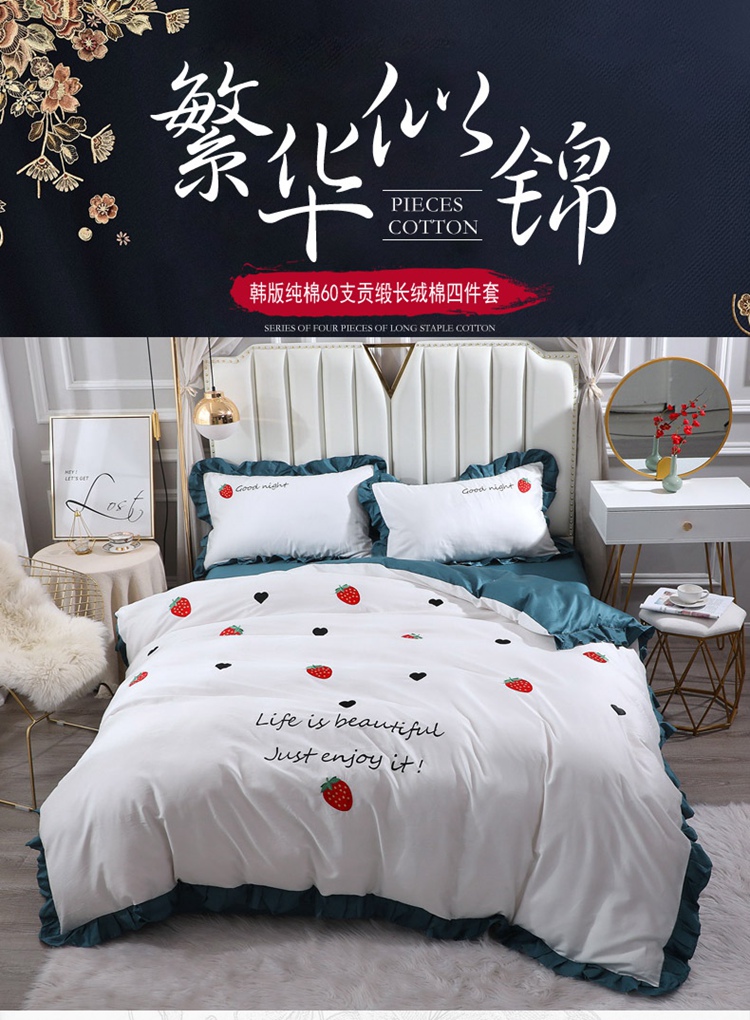 商品名称:全棉60支贡缎长绒棉公主风韩版绣花四件套 夕夕草莓-宝石蓝