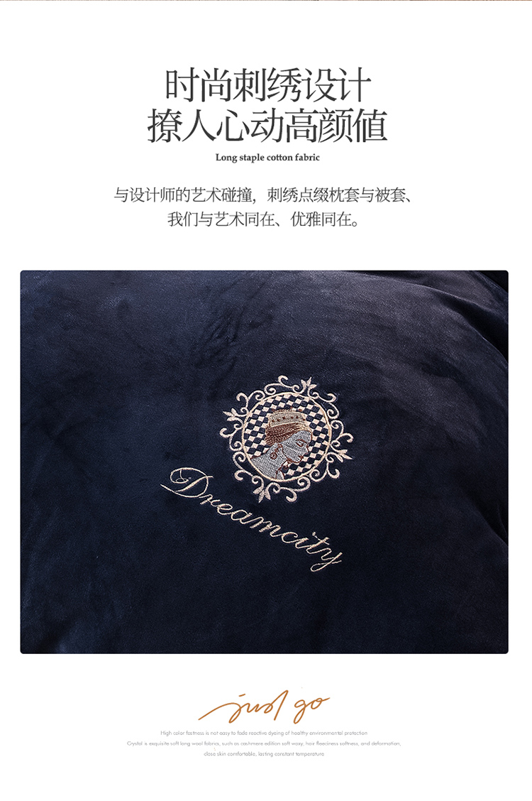 凡客2021秋冬新款水晶绒绣花四件套-居里夫人 雾蓝色