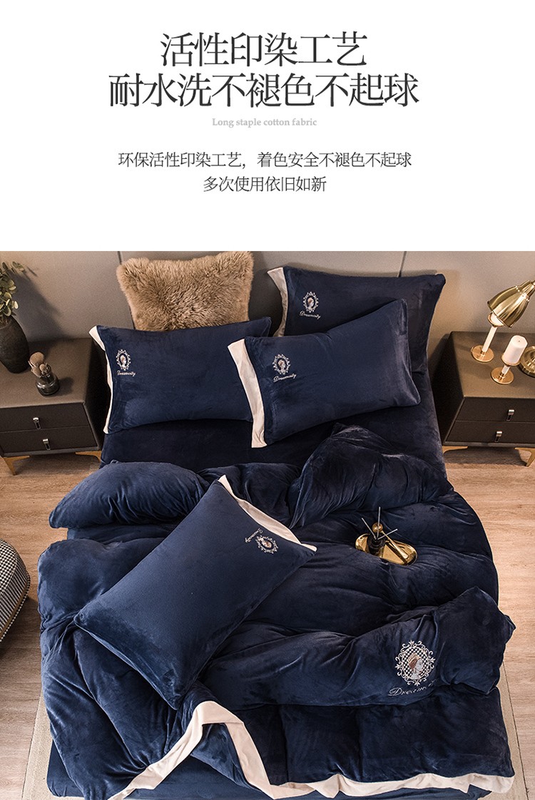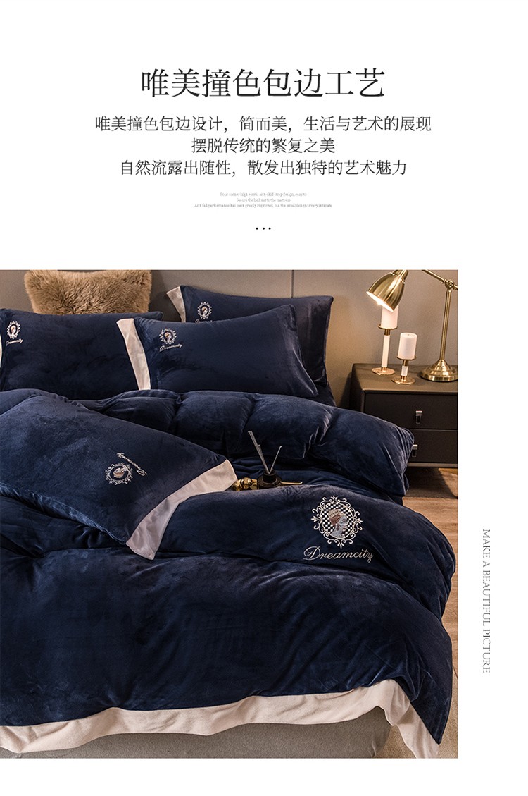 (总)凡客家居 2024新款高克重牛奶绒绣花拼角四件套,海洋蓝,奶油咖,深卡其,樱花粉