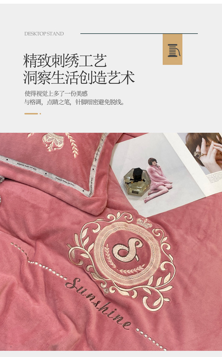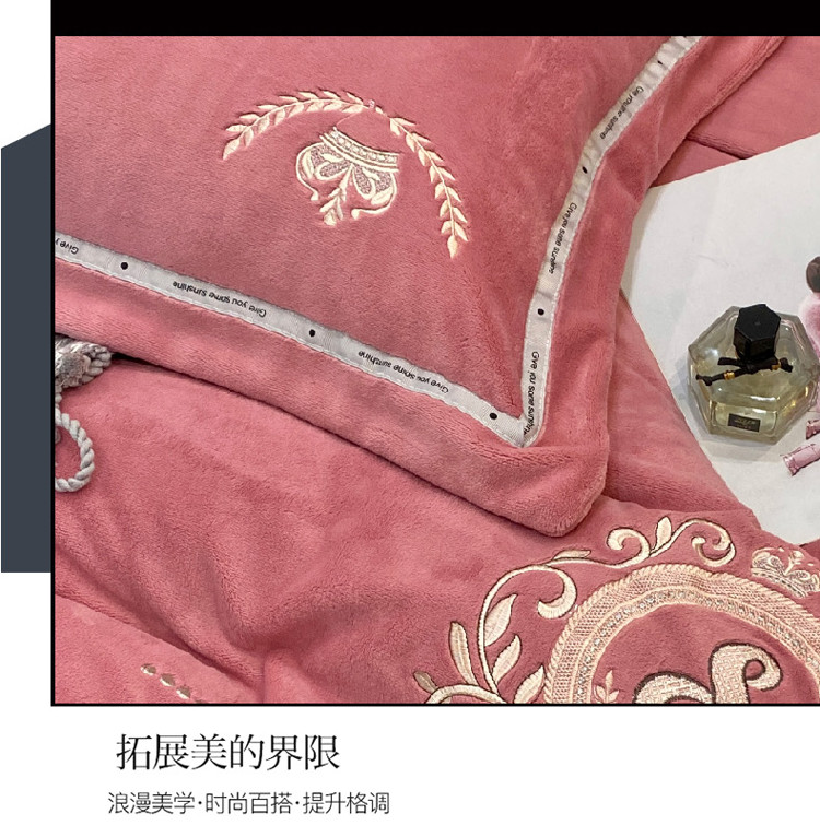 商品名称:星尚新款A类牛奶绒加厚保暖轻氧绒法莱绒水晶绣花四件套 曼享-豆沙粉