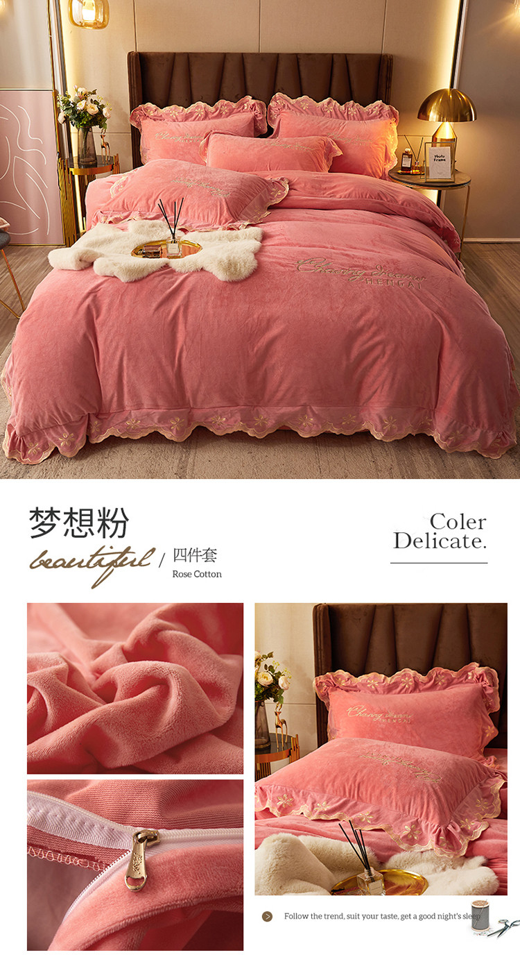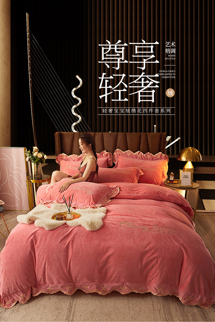 (总)恒爱 2022新款秋冬轻奢宝宝绒刺绣床裙款四件套,爱玛橙,宾利蓝,豆沙红,橄榄绿,高级灰,酒红,梦想粉,浅灰蓝,温馨粉,喜庆红,香妃粉,香芋紫