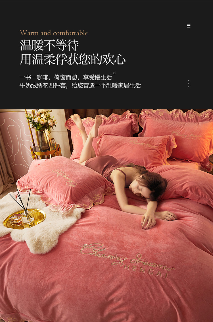 (总)恒爱家纺 2025新款牛奶绒贴布绣夹棉床裙四件套,豆沙红,浪漫紫,天空蓝,温馨粉,象牙白