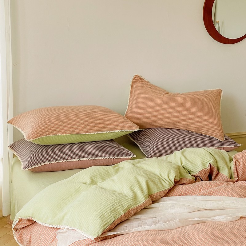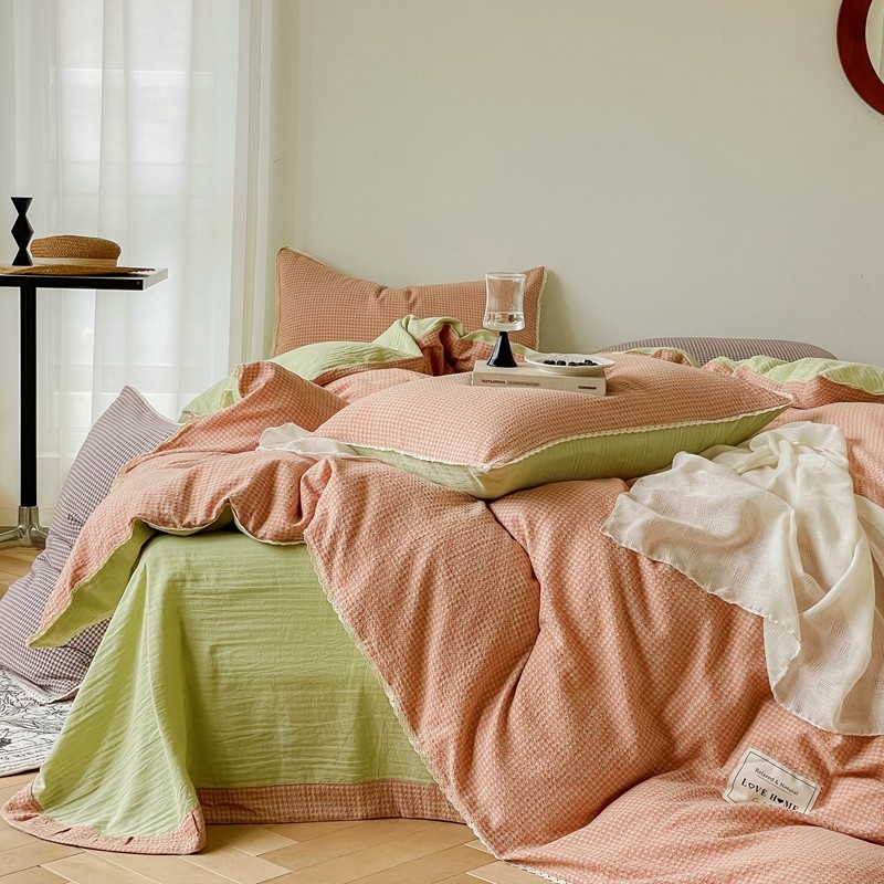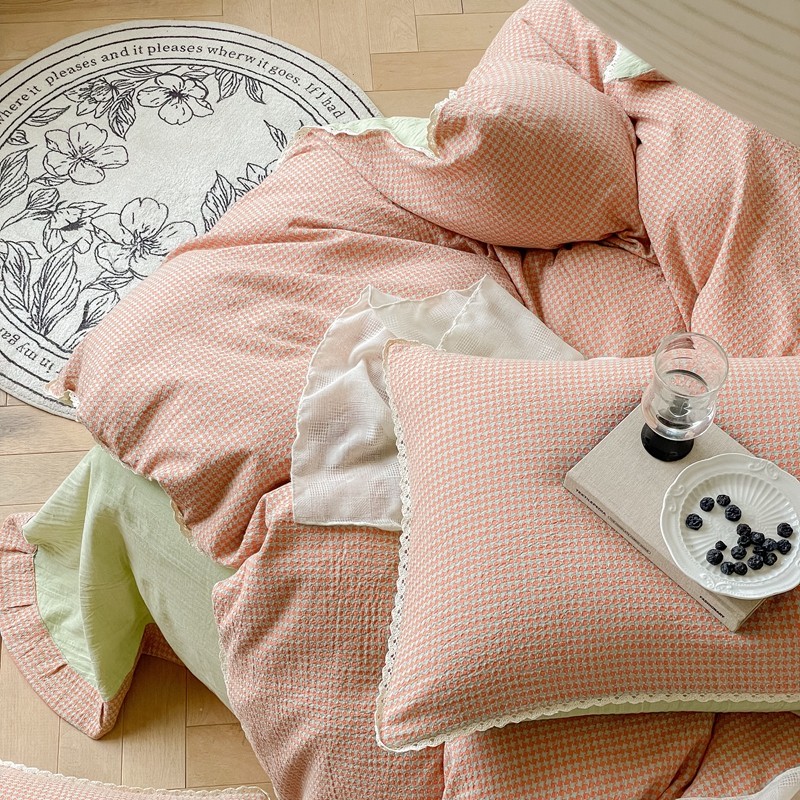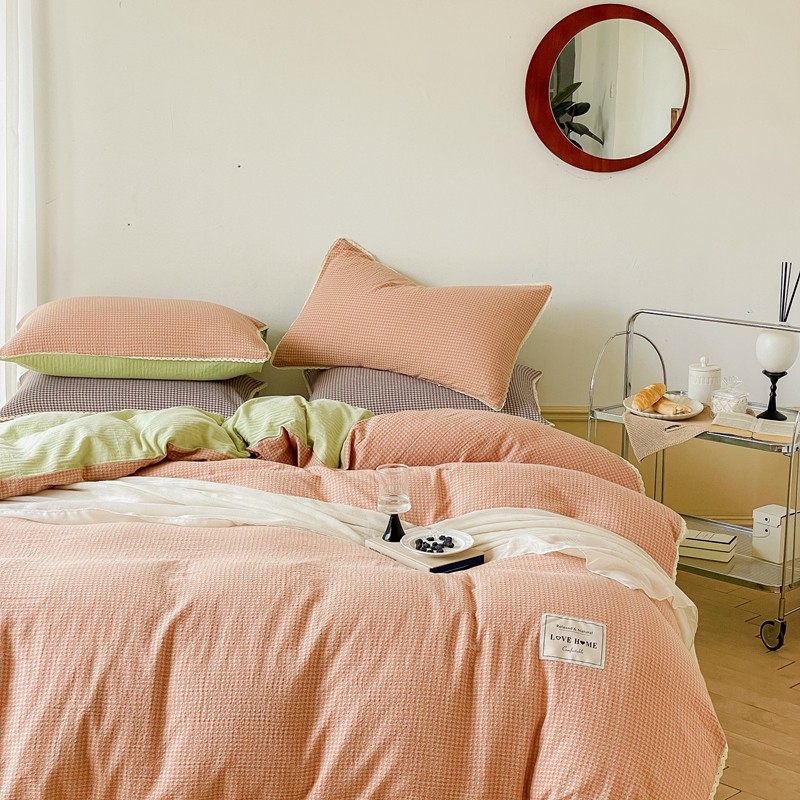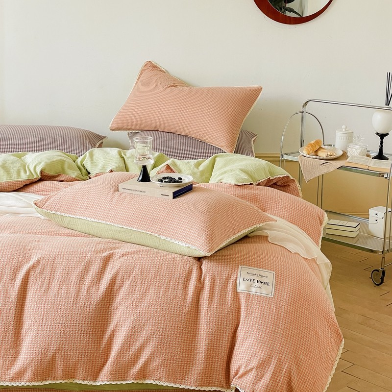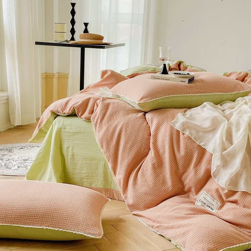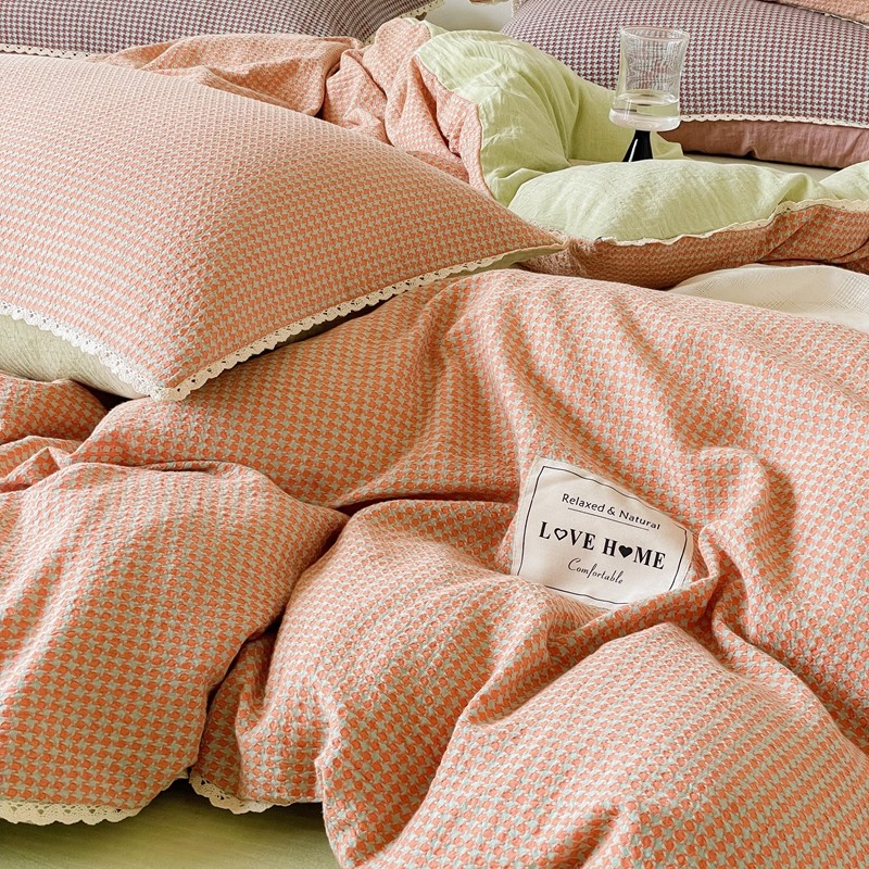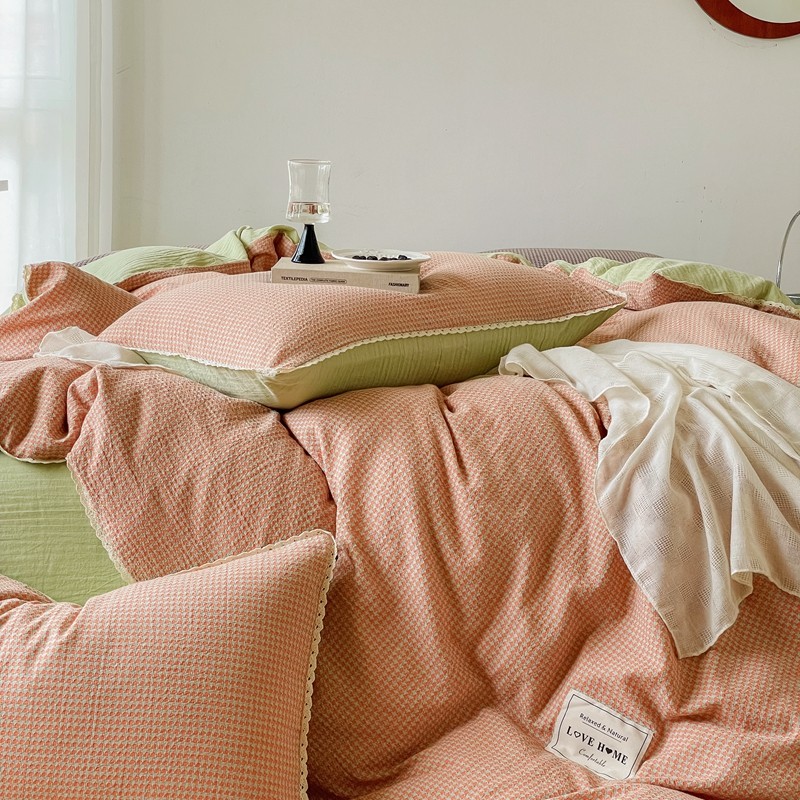 商品名称:圆岛 2022新款色织小提花花边款全棉水洗棉四件套 橘粉拼绿