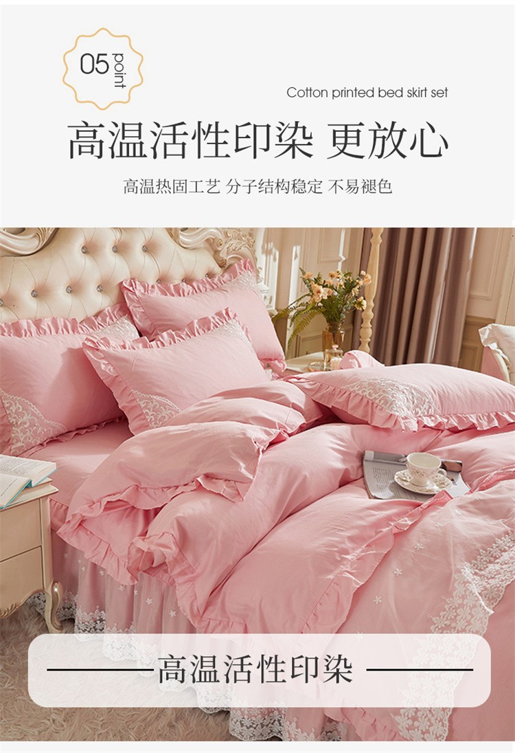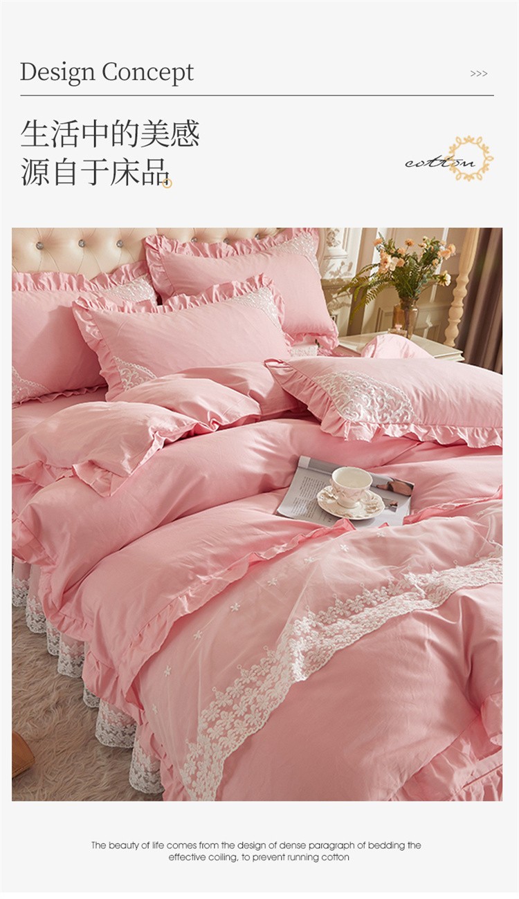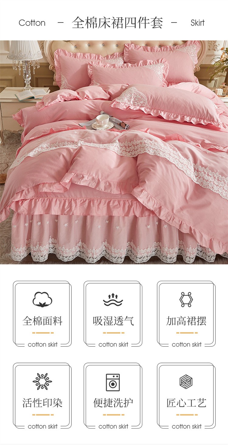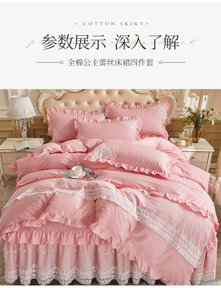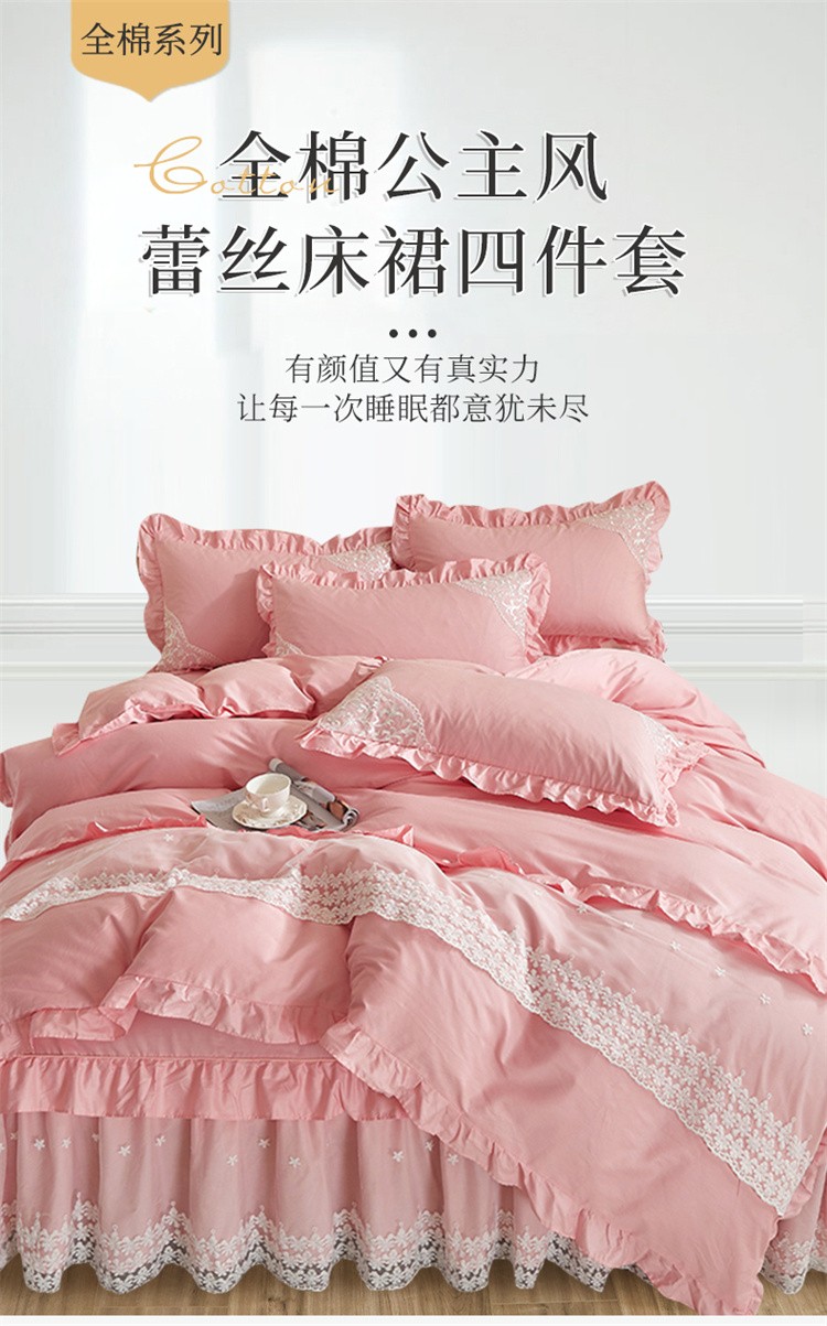 当前位置: 91家纺网 > 商品网购 > 床品套件 > 四件套 > 全棉普通四件套 > 十个点 2022新款纯色全棉公主风蕾丝花边床裙四件套 玉粉色
