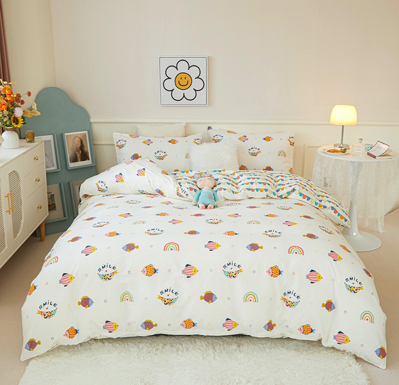 (总)一米阳光 2024新款小清新AB版全棉四件套,贝尔兰,饼干熊,粉黛,简约,卡通甜甜圈,萌萌宠,沁园-灰,沁园-卡其,沁园-紫,水果点点,月半点点