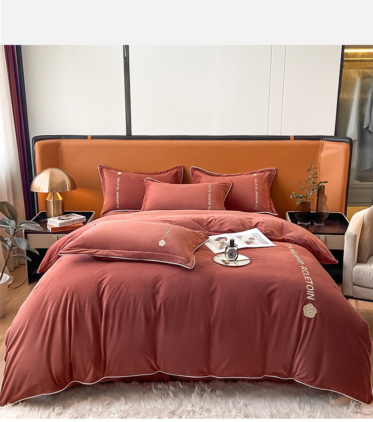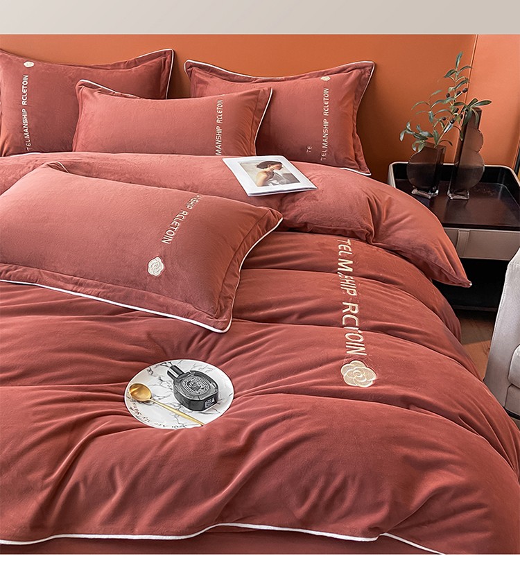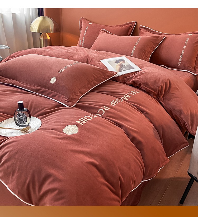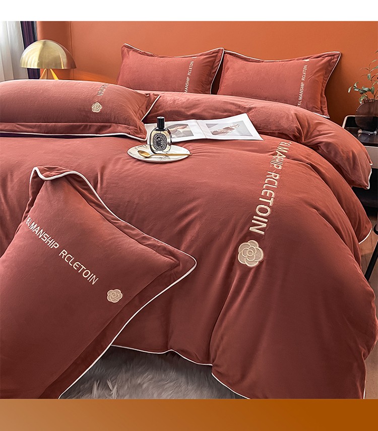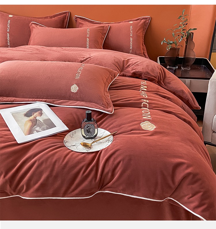 嗯呢 2023新款A类高克重轻奢刺绣婴儿绒四件套 暗红