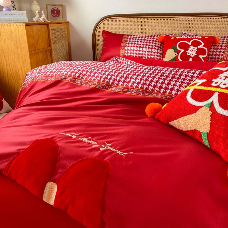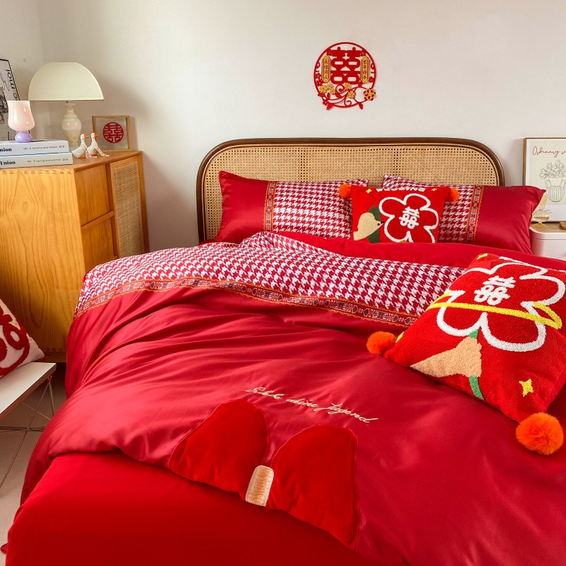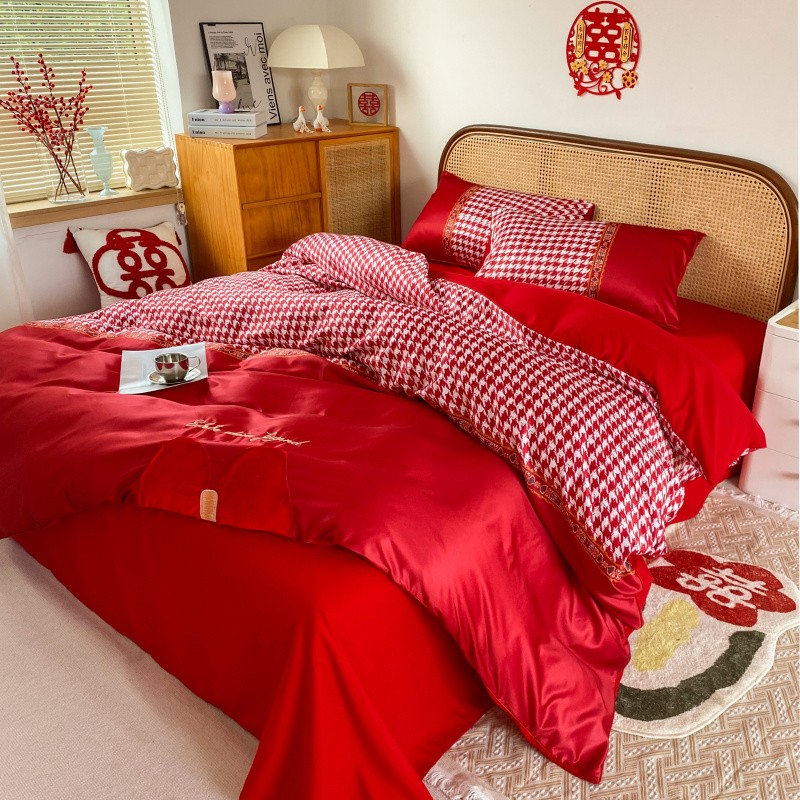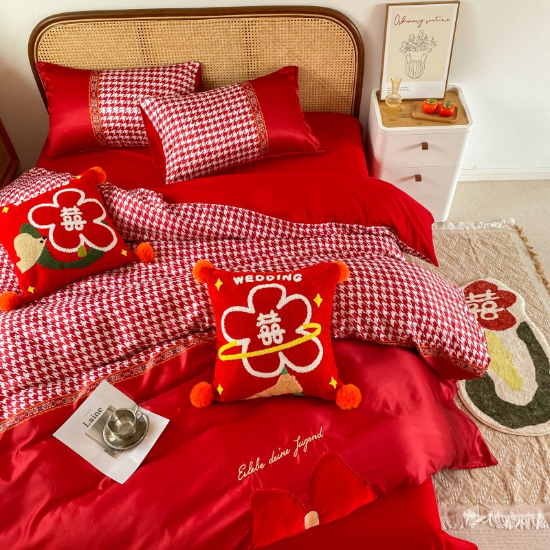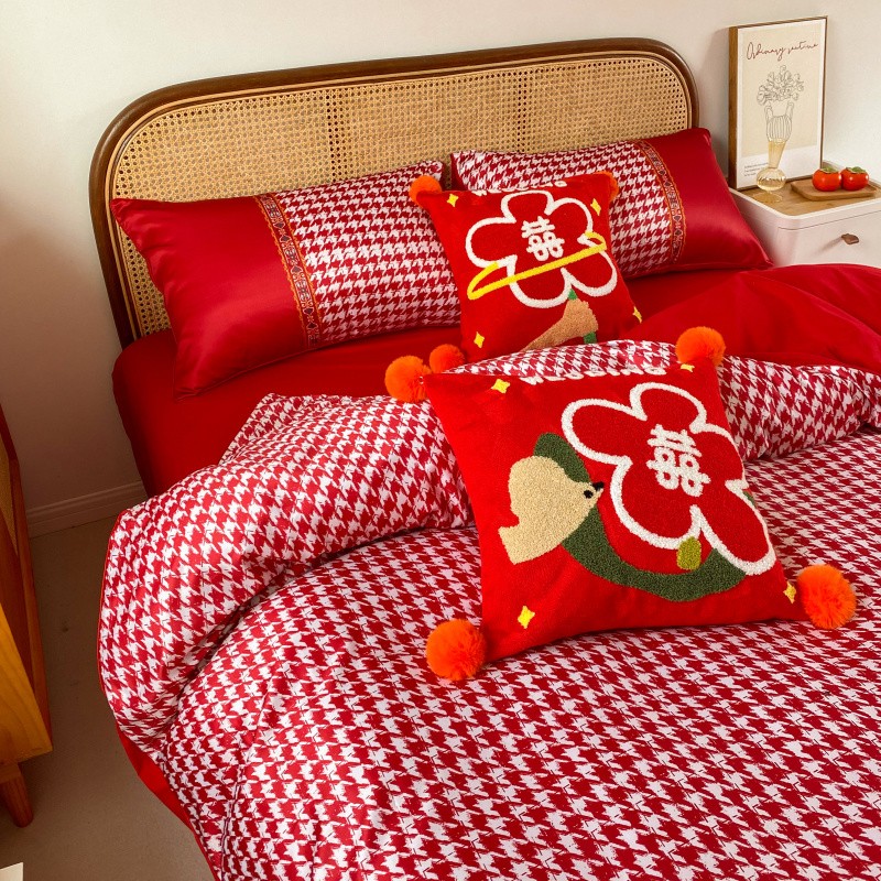 用心2022新款高端数码印花刺绣款婚庆四件套系列2 千鸟格红