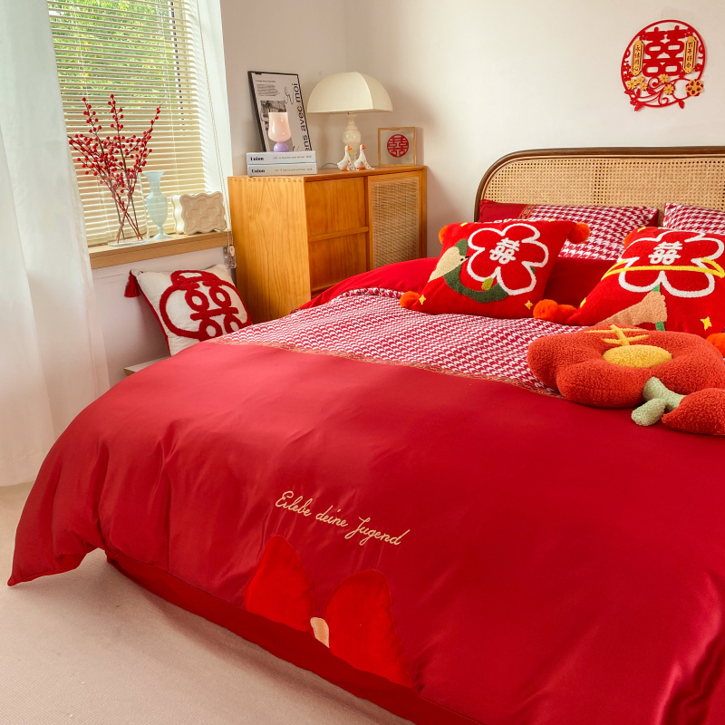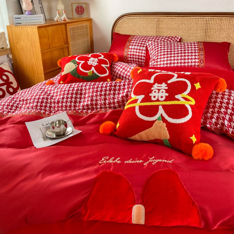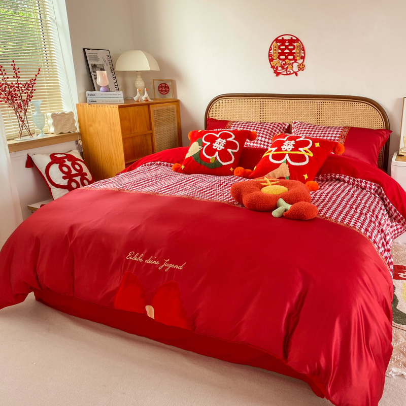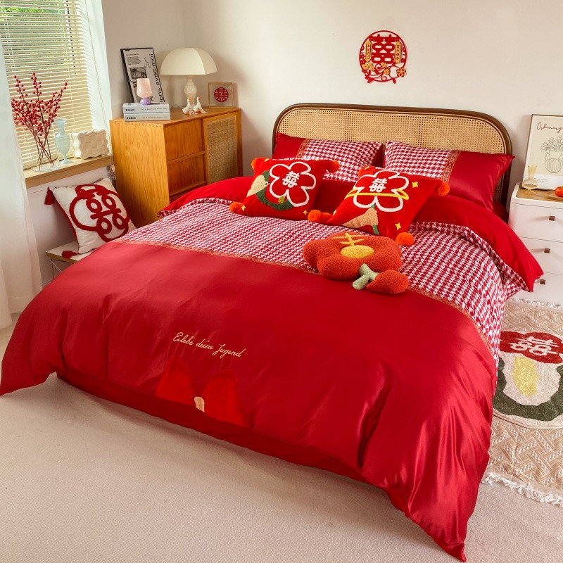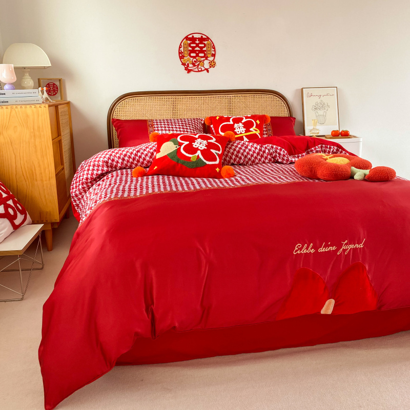 用心2022新款高端数码印花刺绣款婚庆四件套系列2 千鸟格红