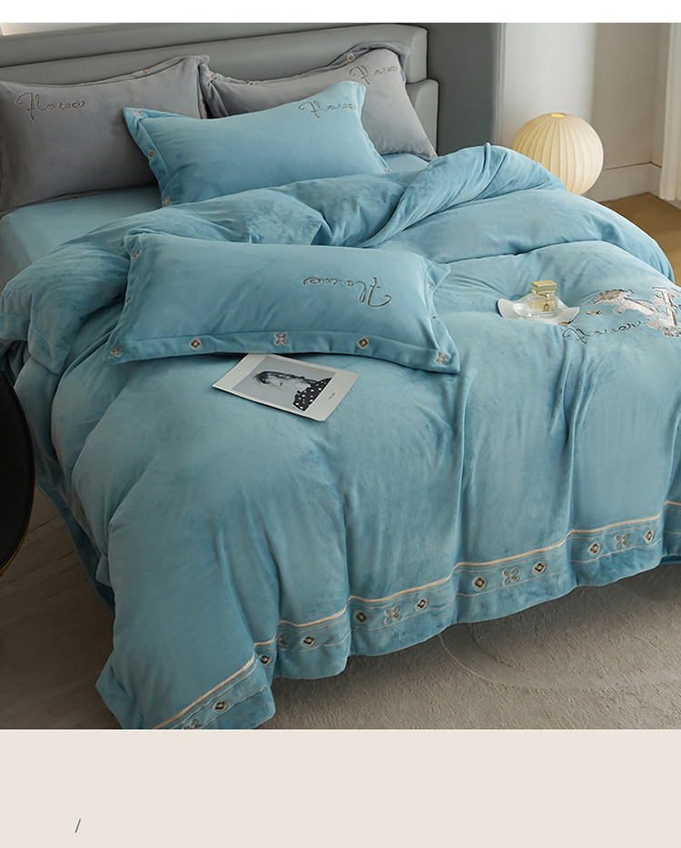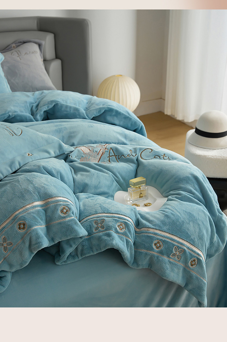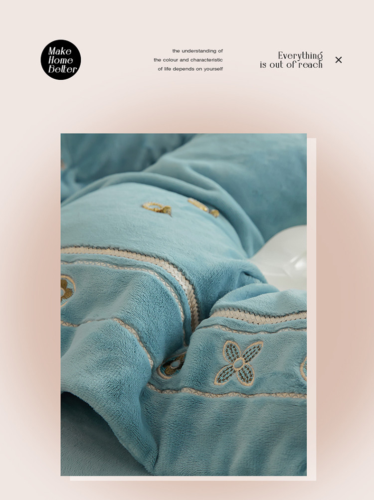 名品优仓 2022新款朵朵情缘系列牛奶绒刺绣宽边系列四件套 朵朵情缘-天空蓝