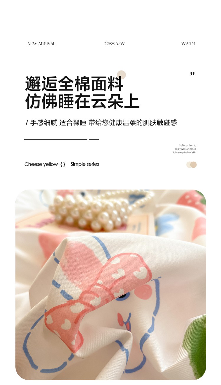 (总)雅居纺家纺 2022新款13070全棉印花四件套,草莓蝴蝶结,俄罗斯方块,黑白蝴蝶结,很嗨兔,可爱小兔,快乐花海,牛奶纹,胖胖鸭,棋盘格,日月争辉,西部恐龙,小情调,小桃桃