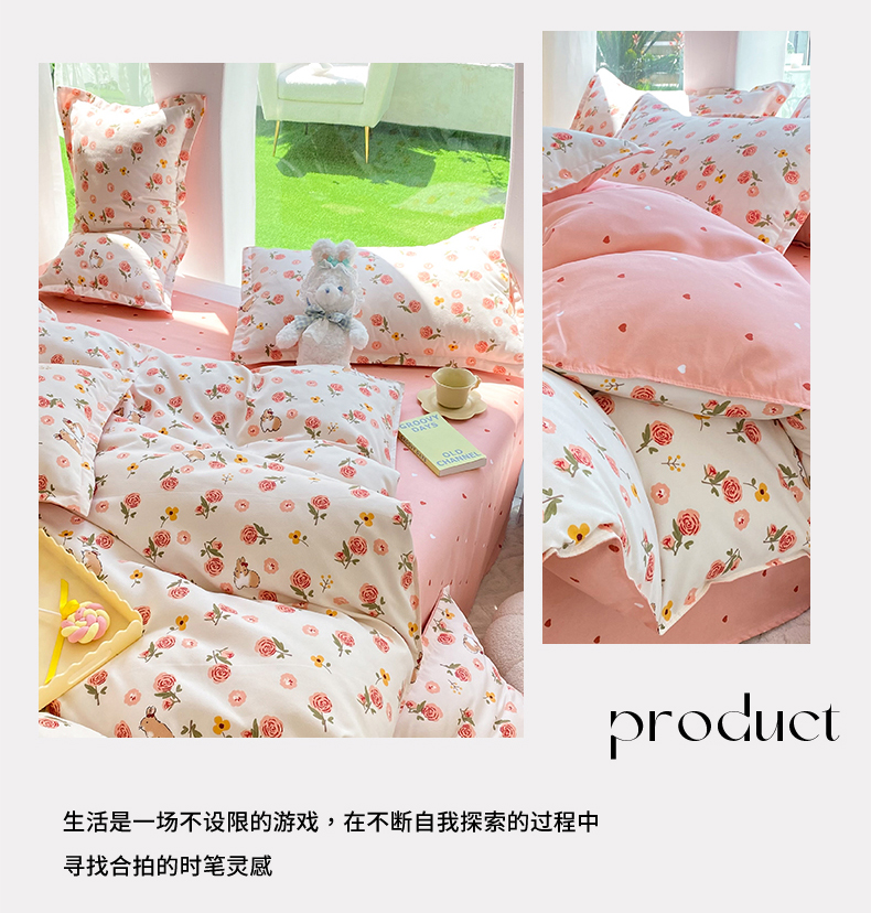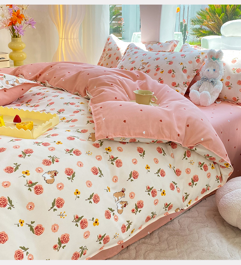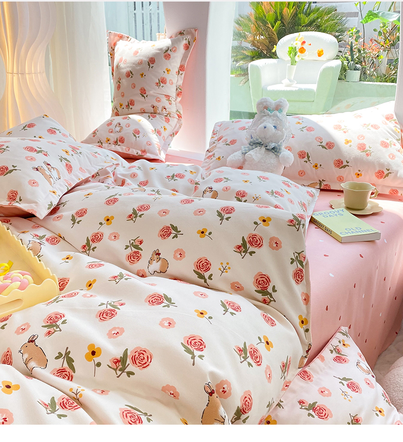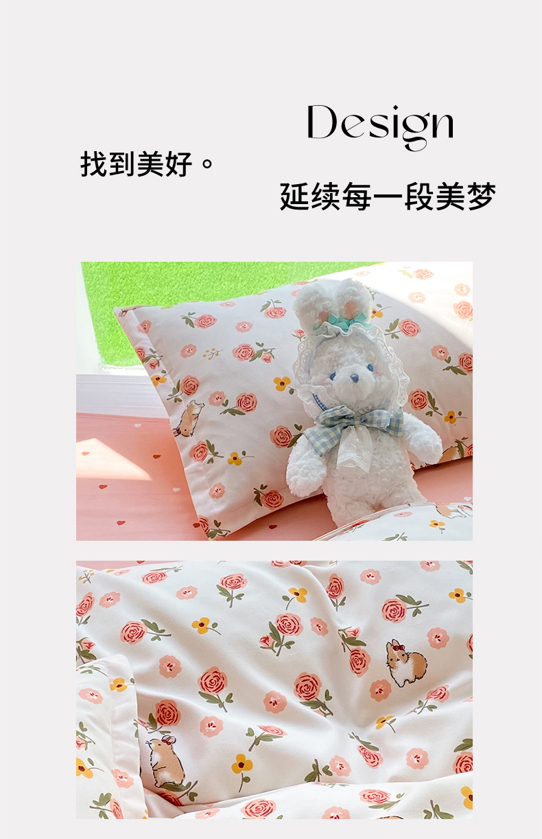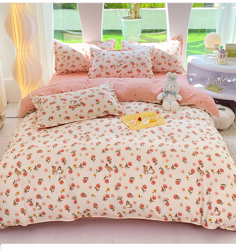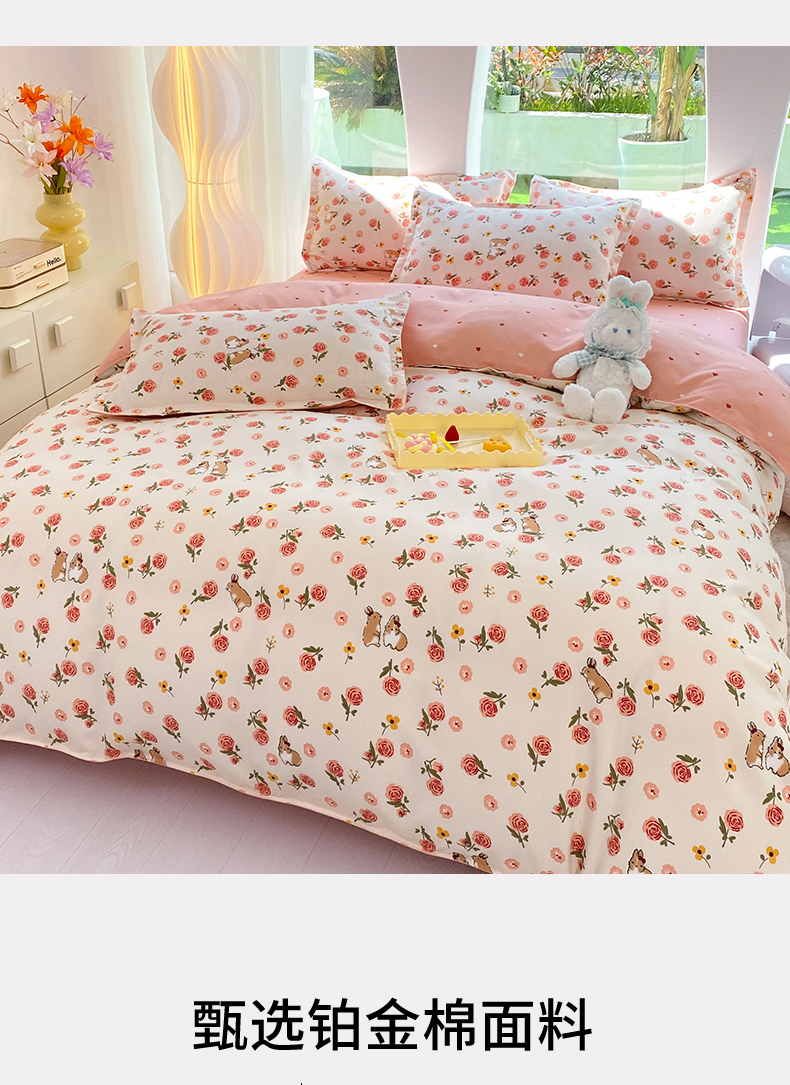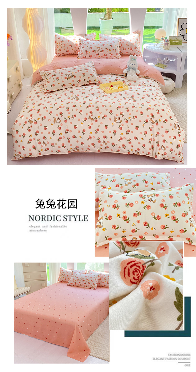 商品名称:妖妖家纺 2023铂金高克重植物羊绒130克斜纹印花四件套 兔兔花园