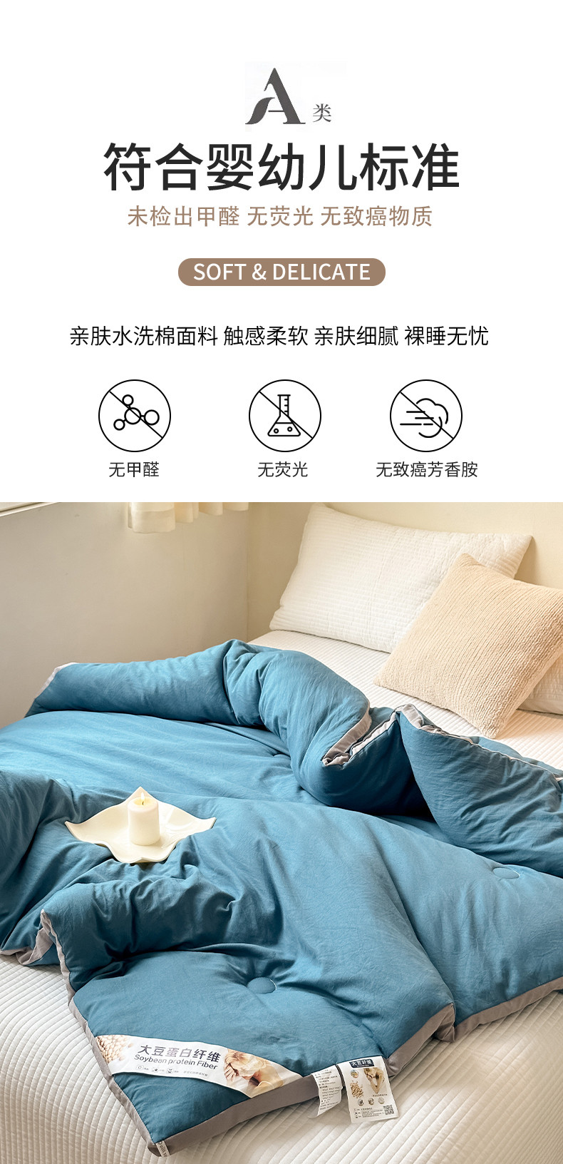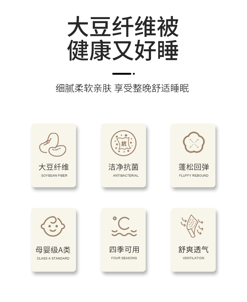 • 填充纤维种类: 大豆蛋白改性聚酯纤维