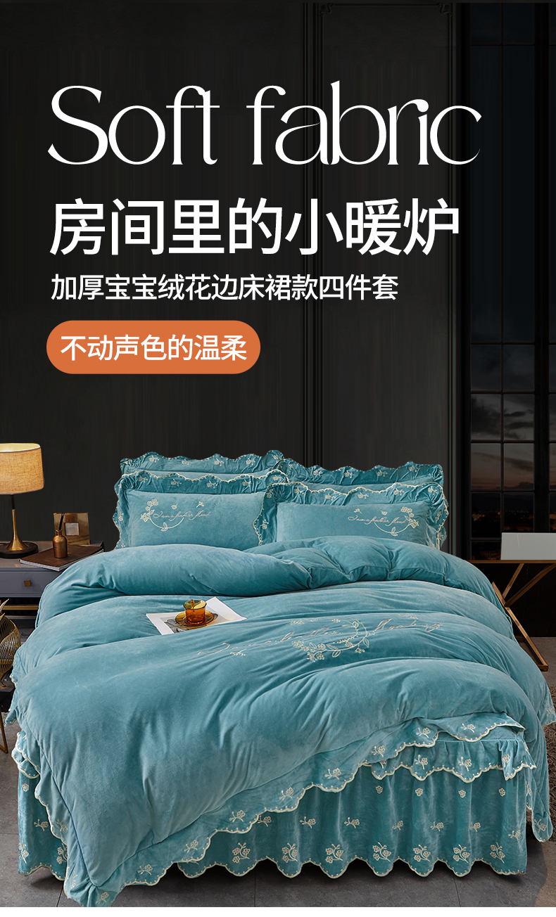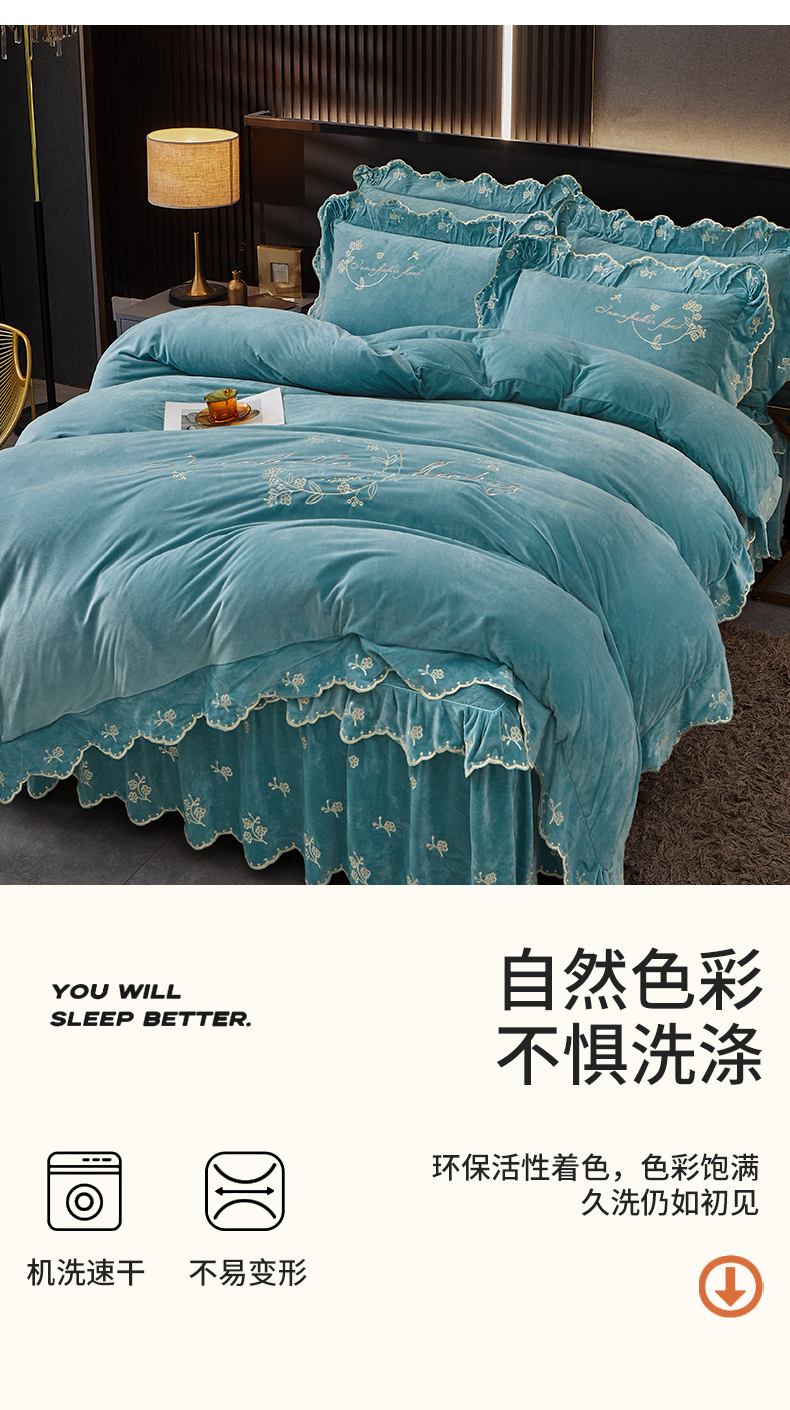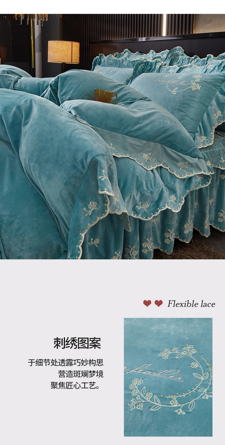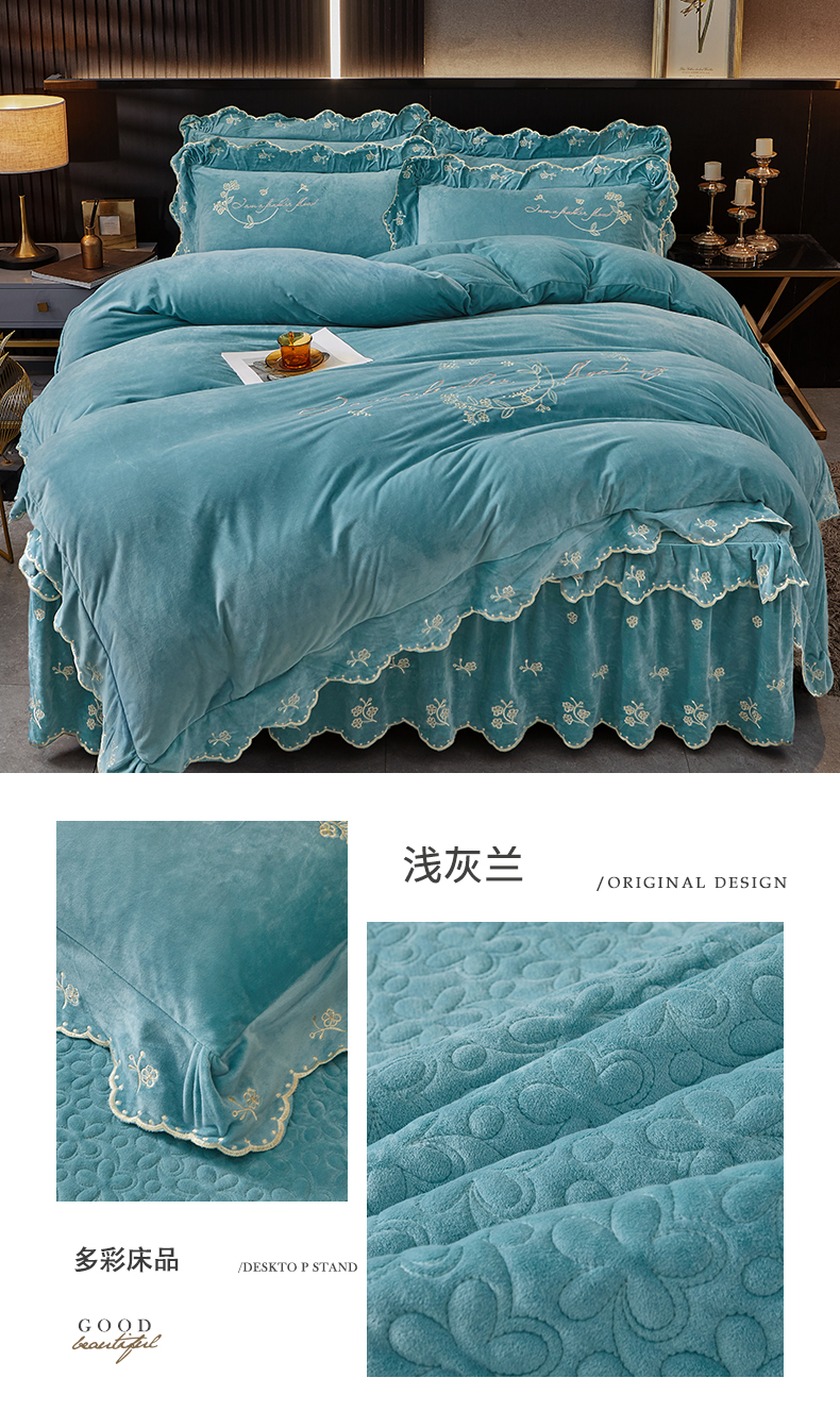 当前位置: 91家纺网 > 商品网购 > 床品套件 > 四件套 > 宝宝绒四件套 > 2023 恒爱家纺 花好月圆宝宝绒床裙四件套 浅灰兰