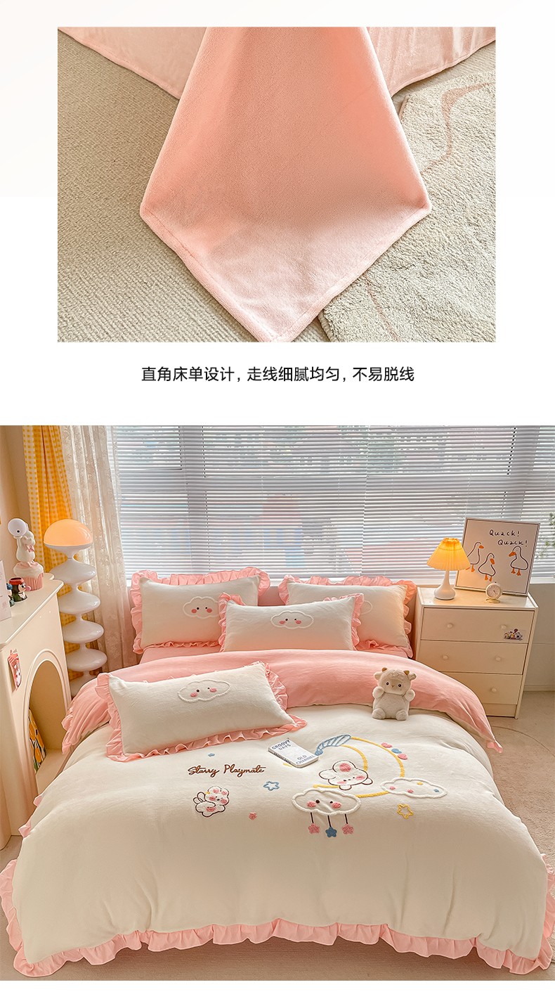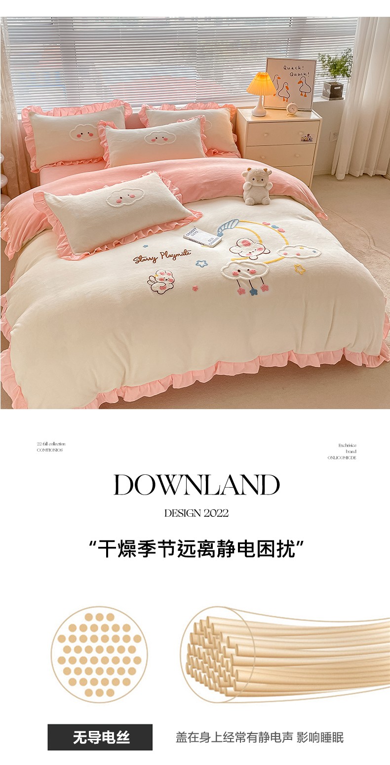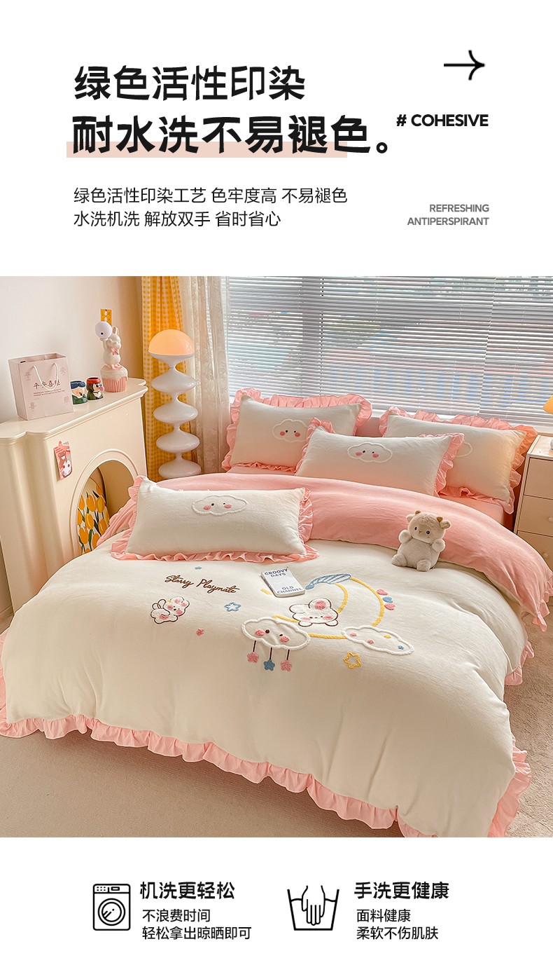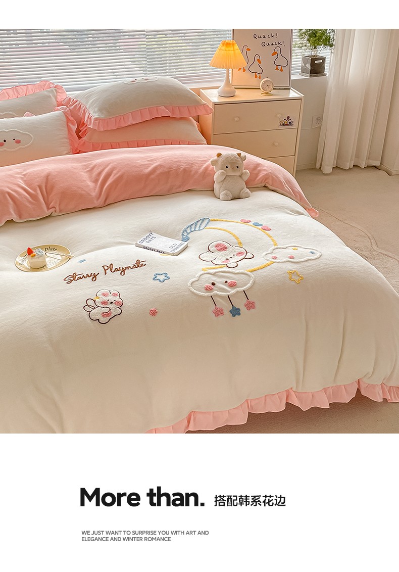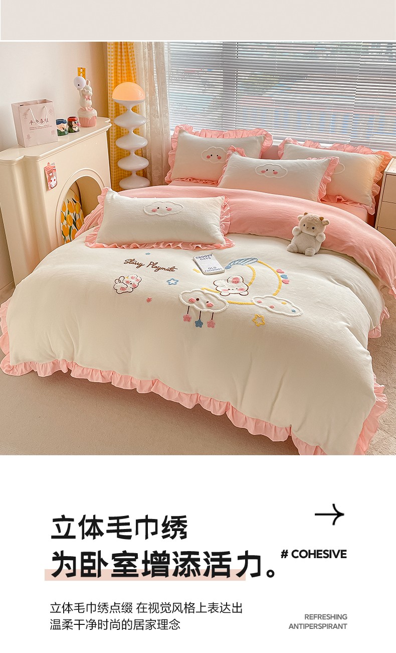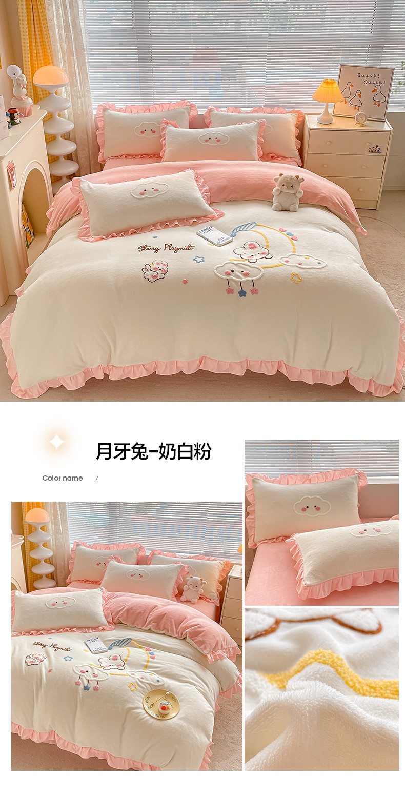 当前位置: 91家纺网 > 商品网购 > 床品套件 > 四件套 > 牛奶绒四件套 > 易禾 2024新款牛奶绒毛巾绣兔绒花边四件套-月牙 月牙兔-奶白粉