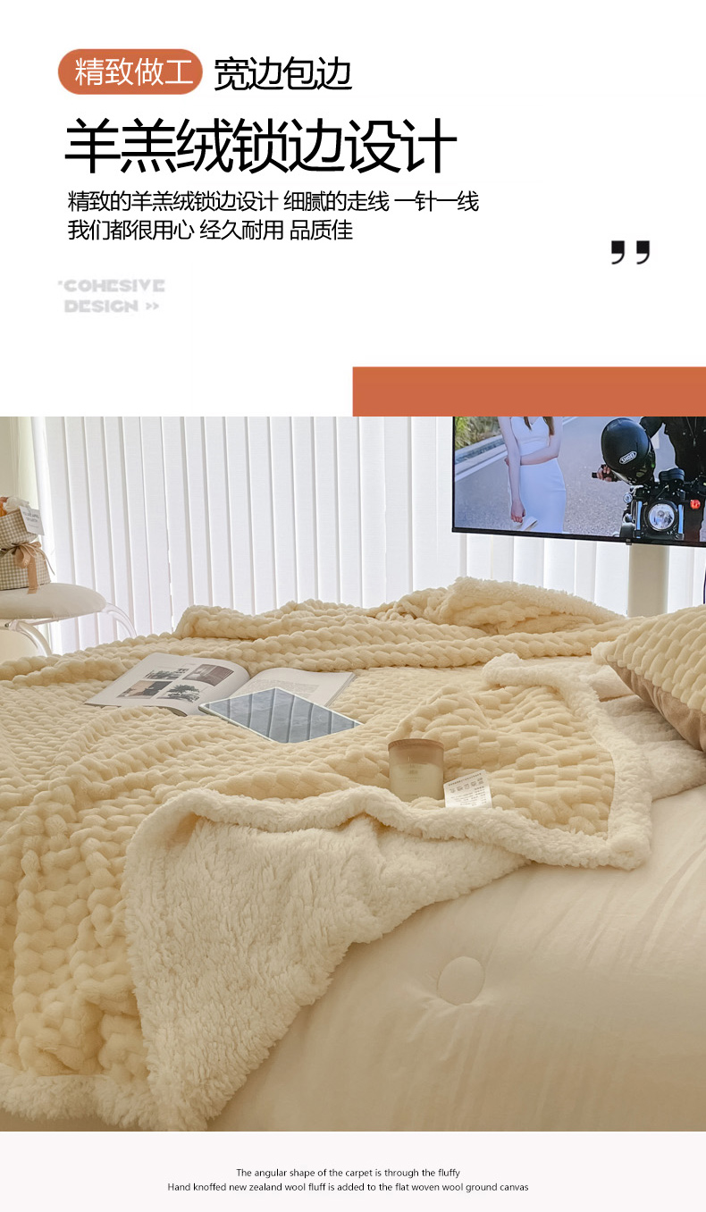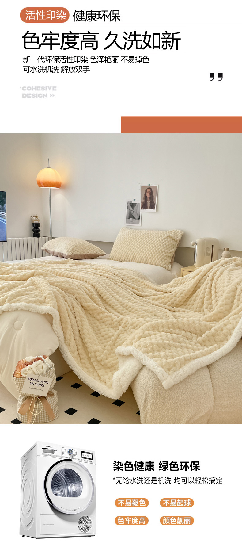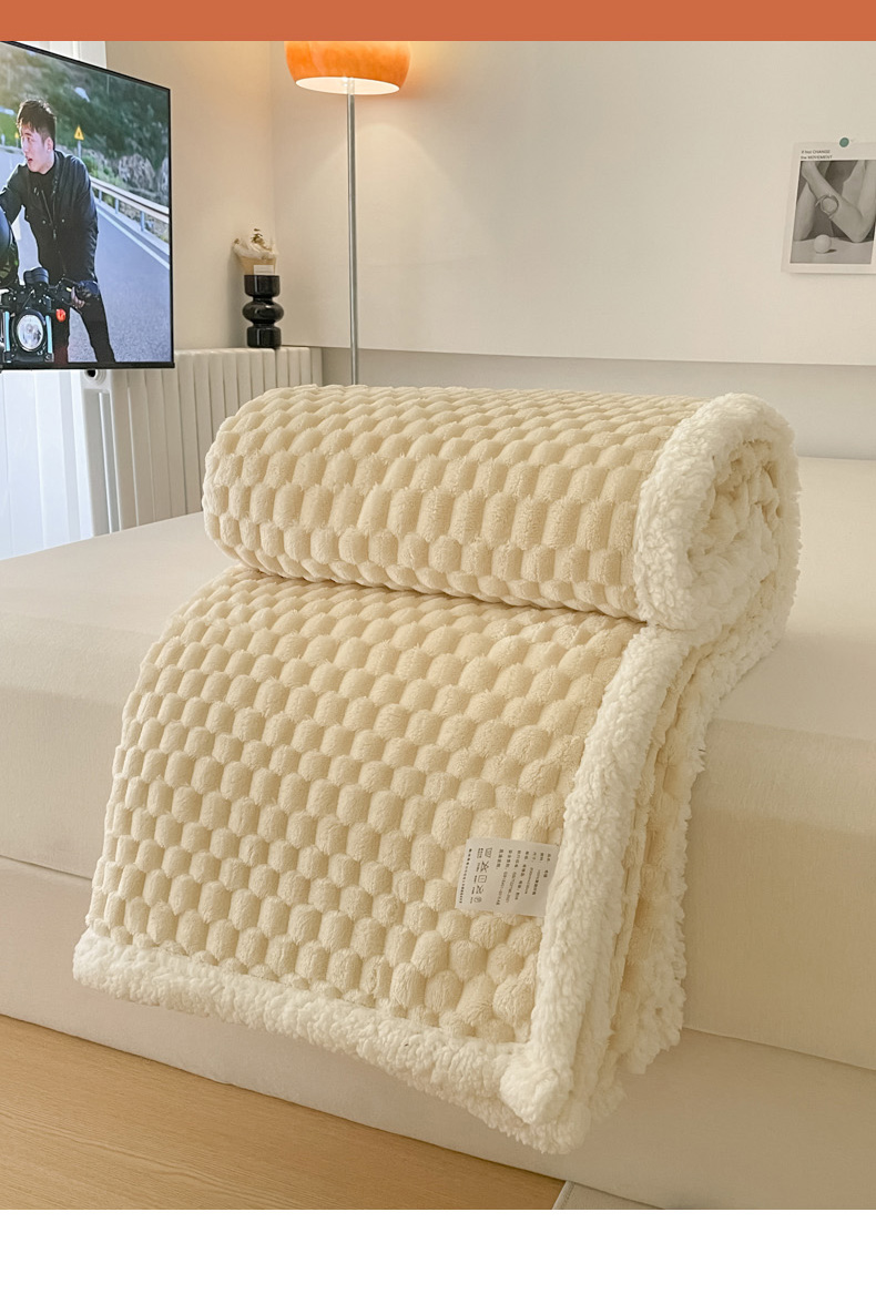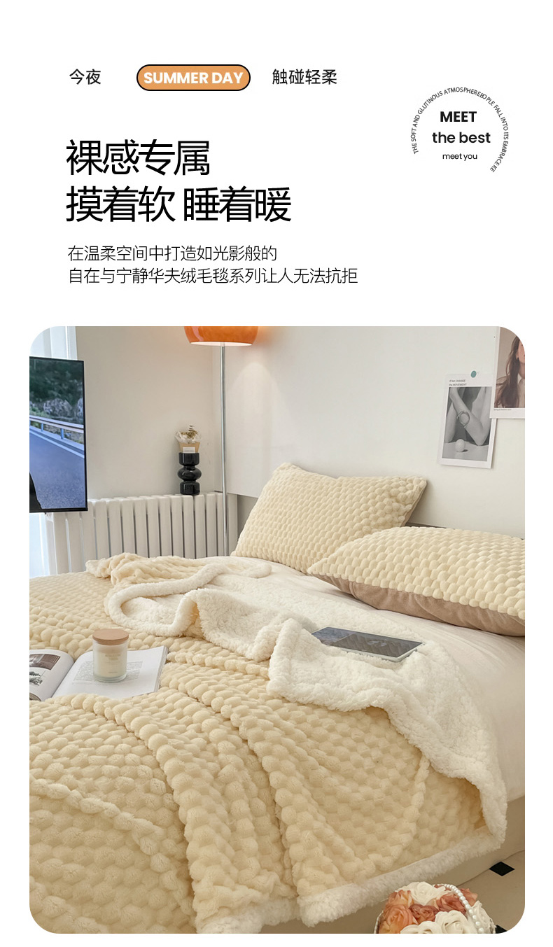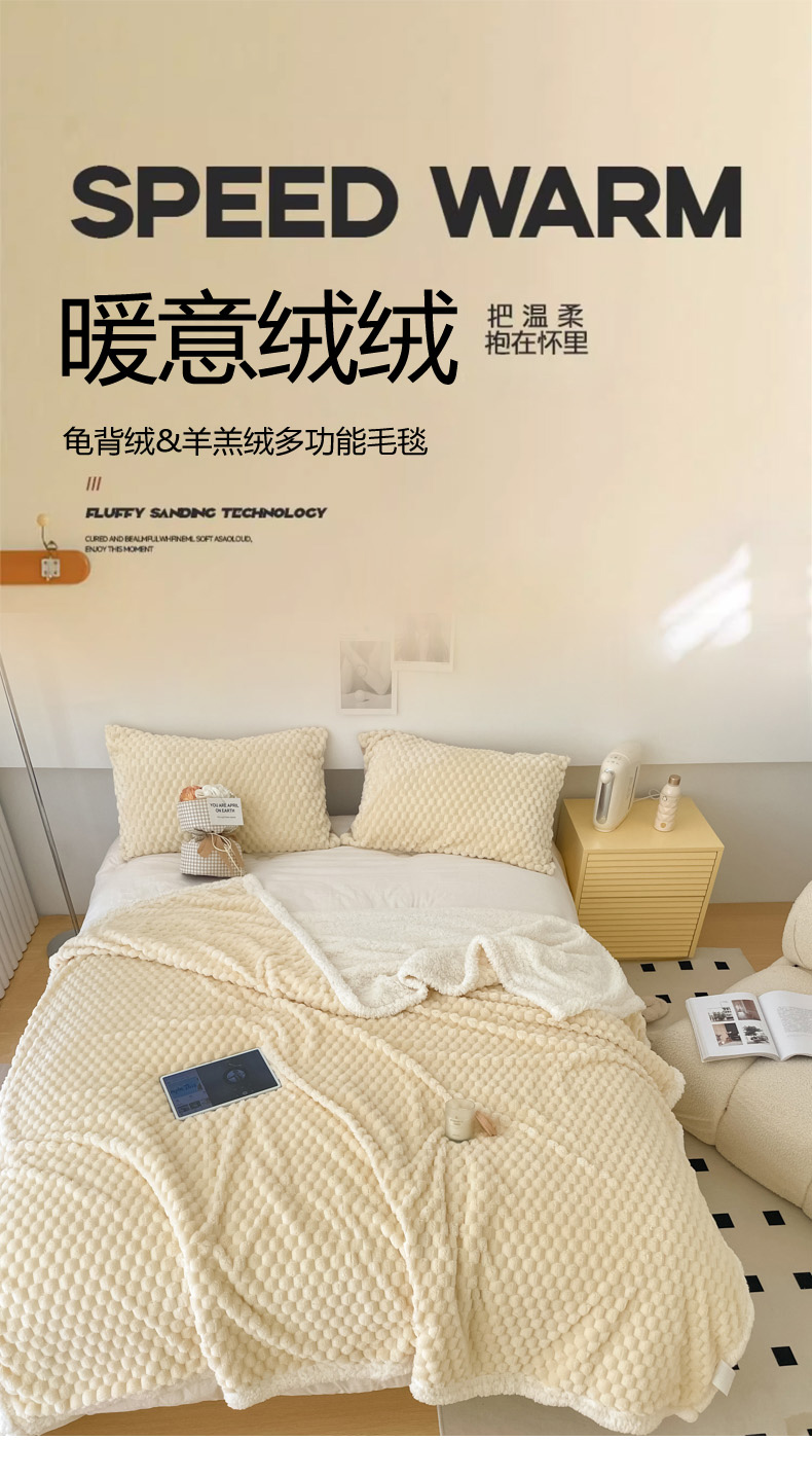 商品名称:沐慕 2023新款纯色简约龟背绒拼羊羔绒毛毯 米白