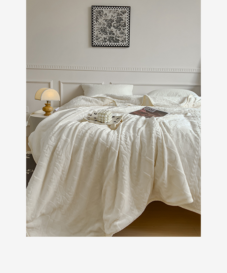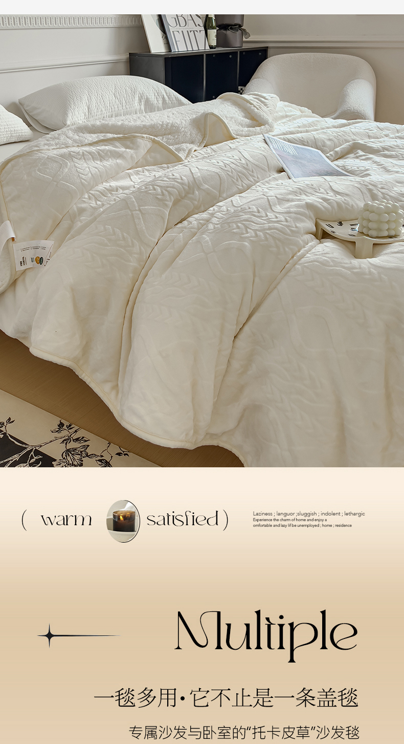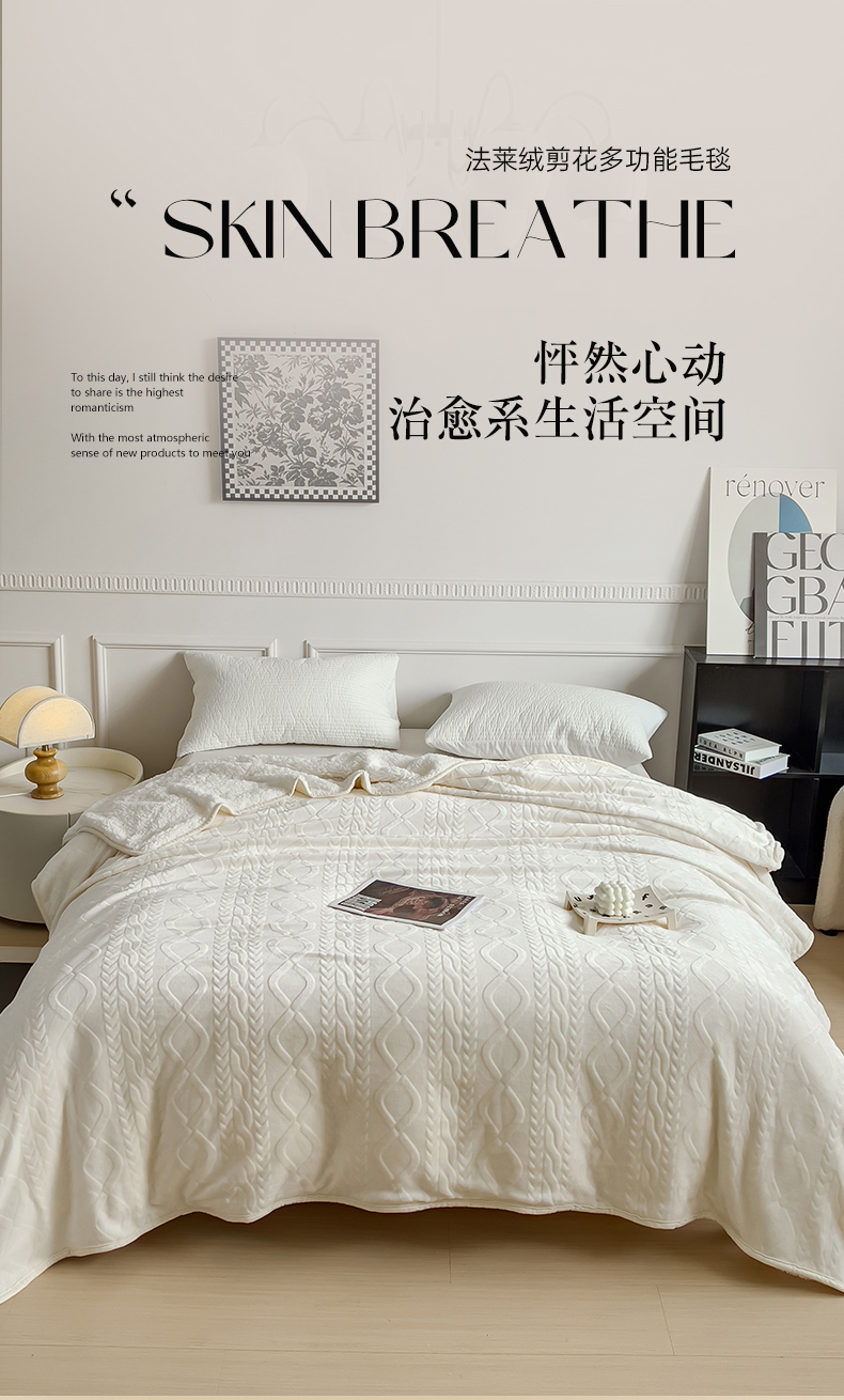 宜家坊 新款秋冬高克重法莱绒羊羔绒立体剪花纯色多功能毛毯 奶油白