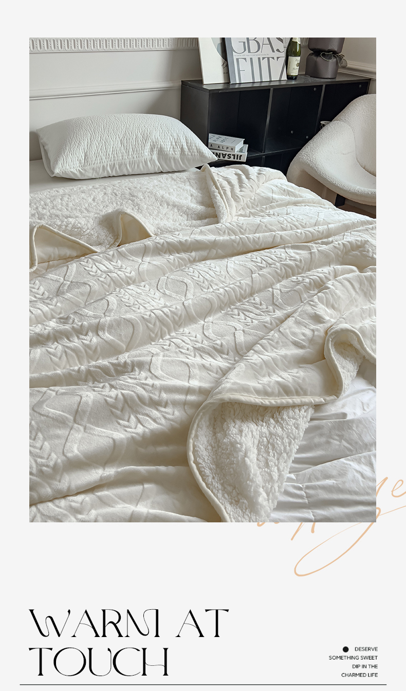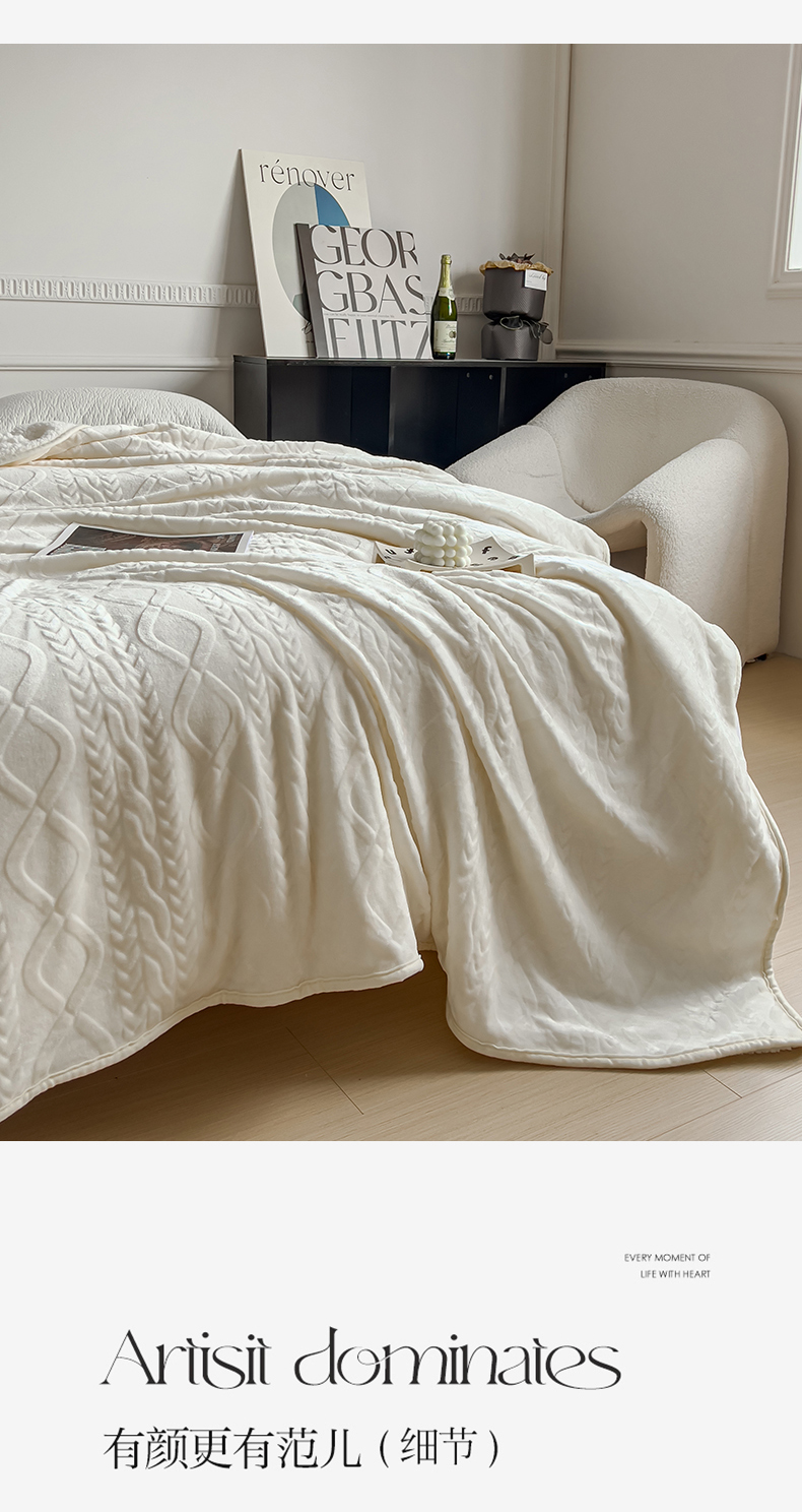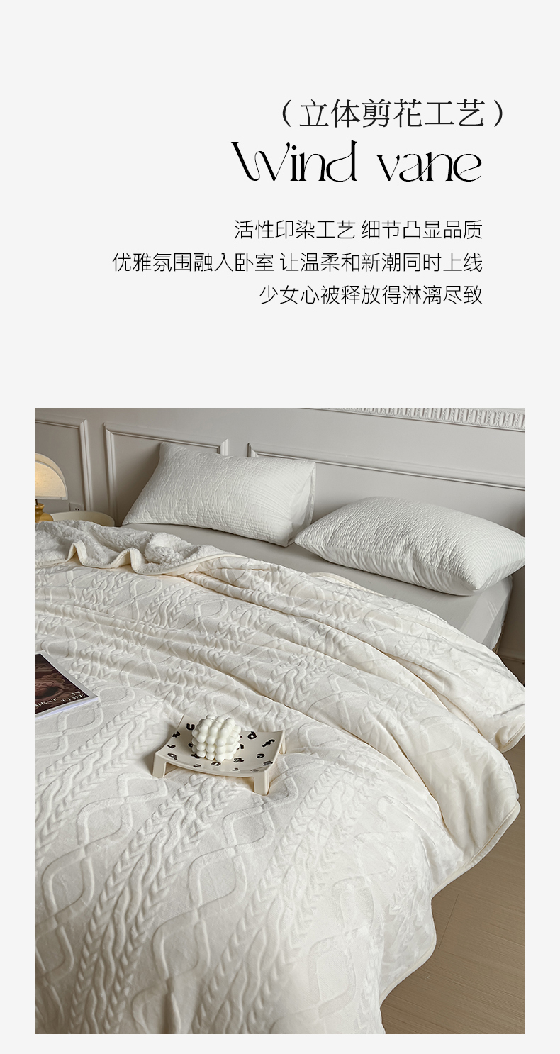 宜家坊 新款秋冬高克重法莱绒羊羔绒立体剪花纯色多功能毛毯 奶油白