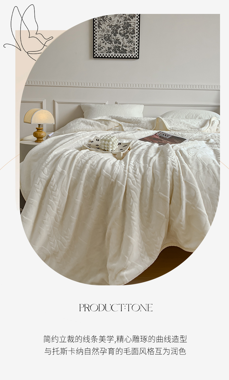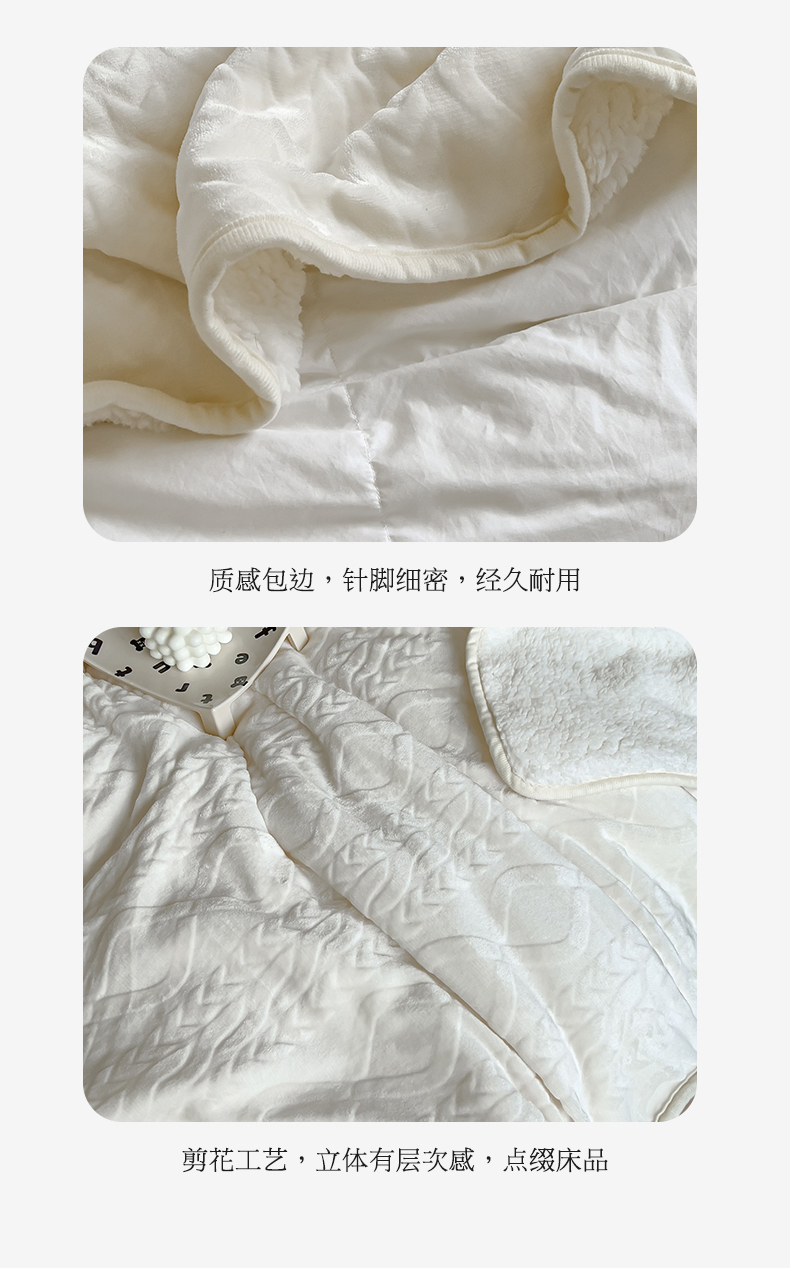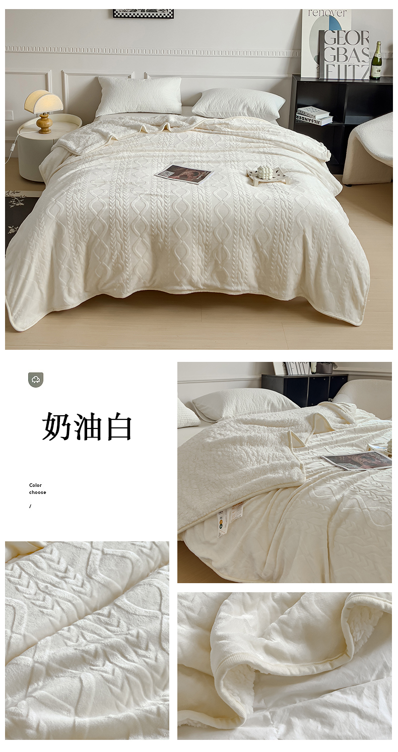 商品名称:宜家坊 新款秋冬高克重法莱绒羊羔绒立体剪花纯色多功能毛毯 奶油白