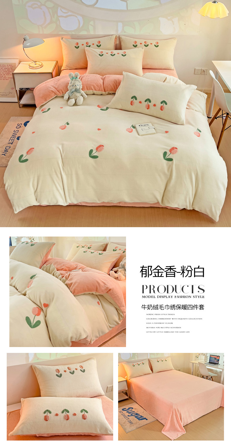 寐居家纺 2023毛巾绣牛奶绒四件套 郁金香-粉白