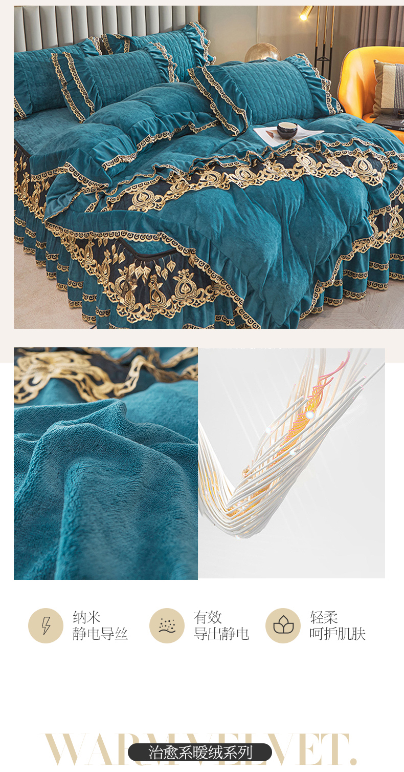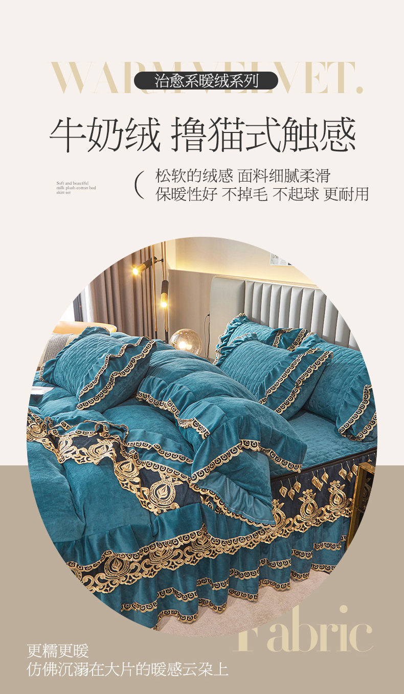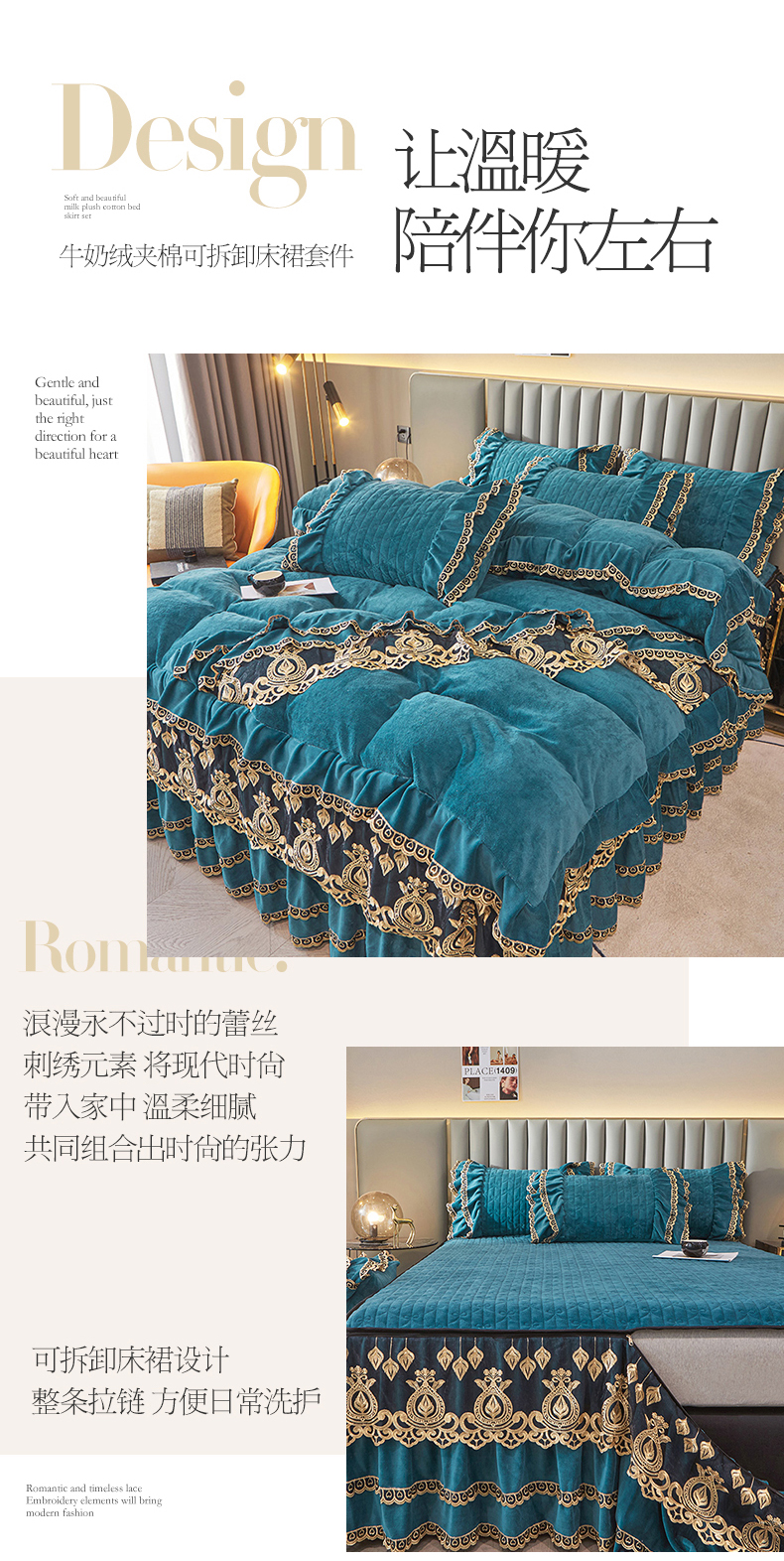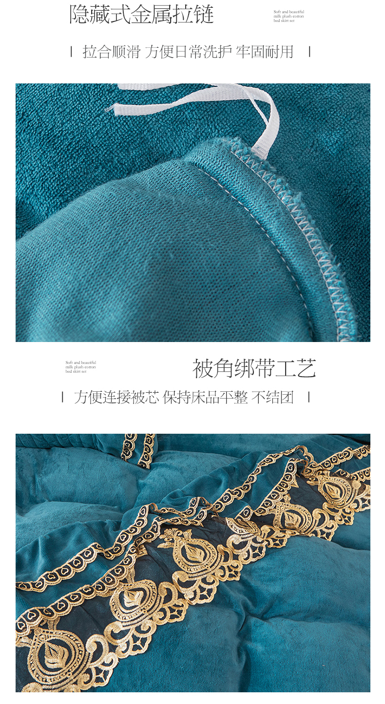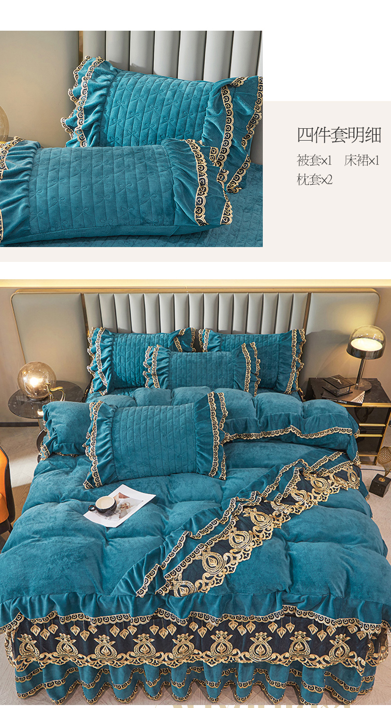 • 91家纺网 家纺一手货源 找家纺 虹星家纺 2023新款牛奶绒夹棉蕾丝可拆卸床裙系列四件套 梦幻巴黎 海兰