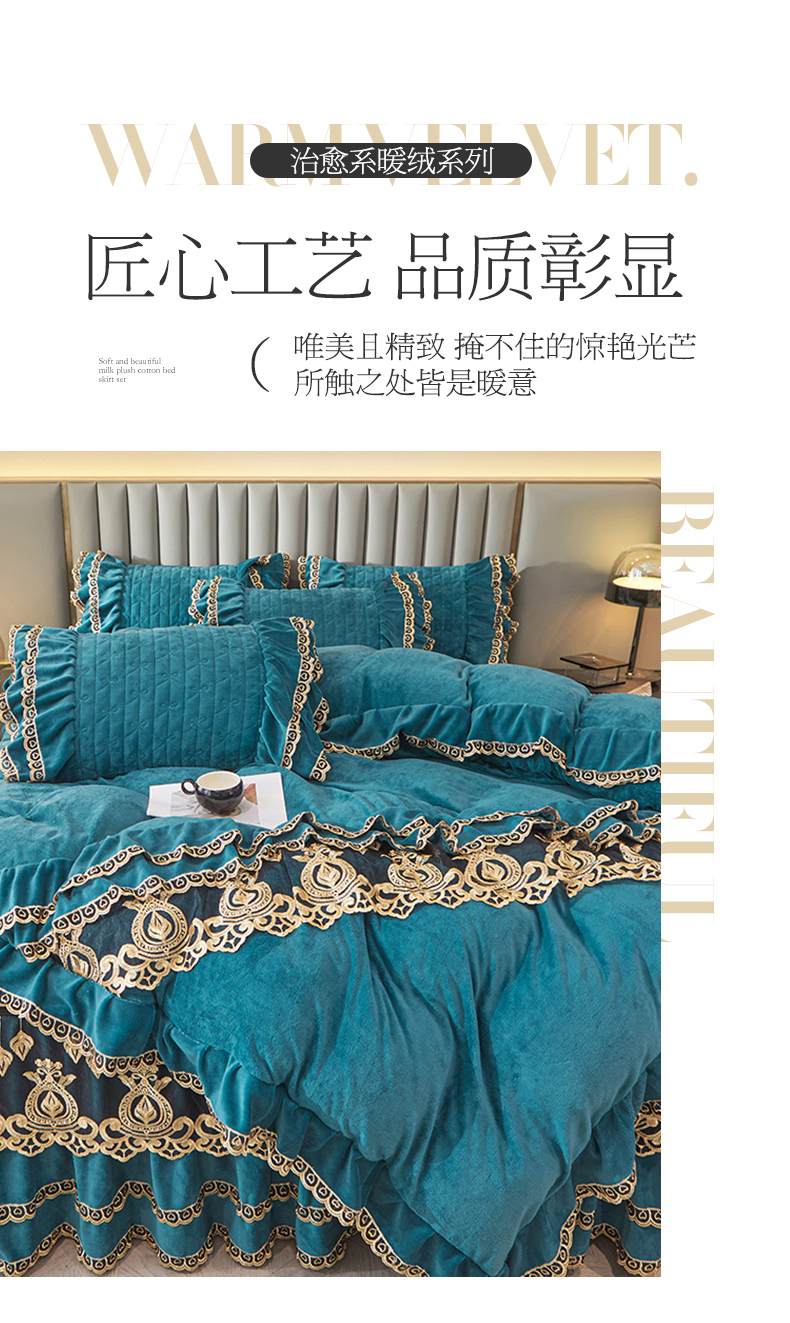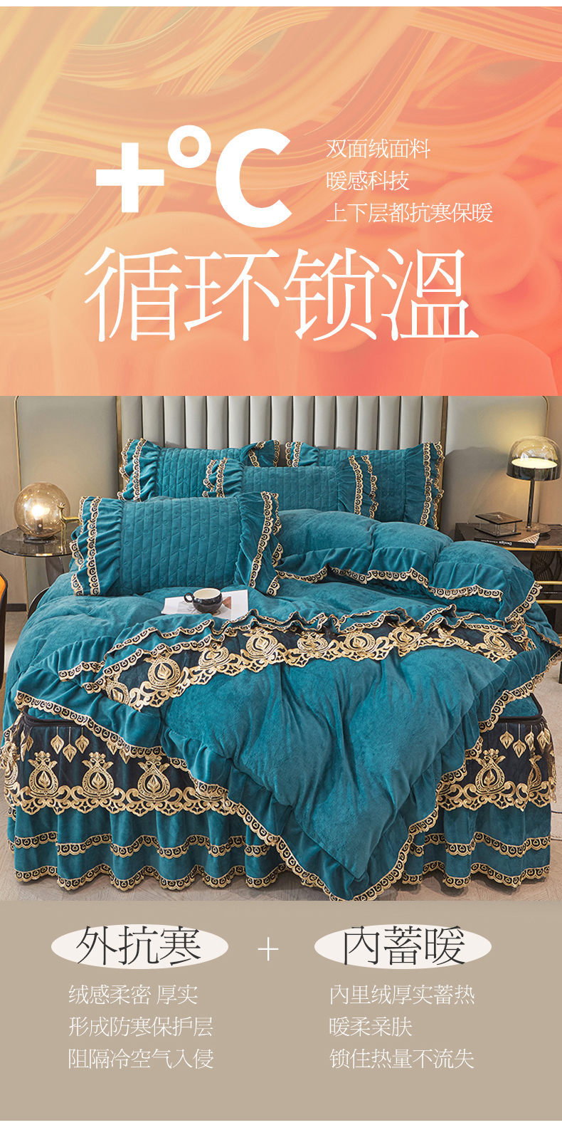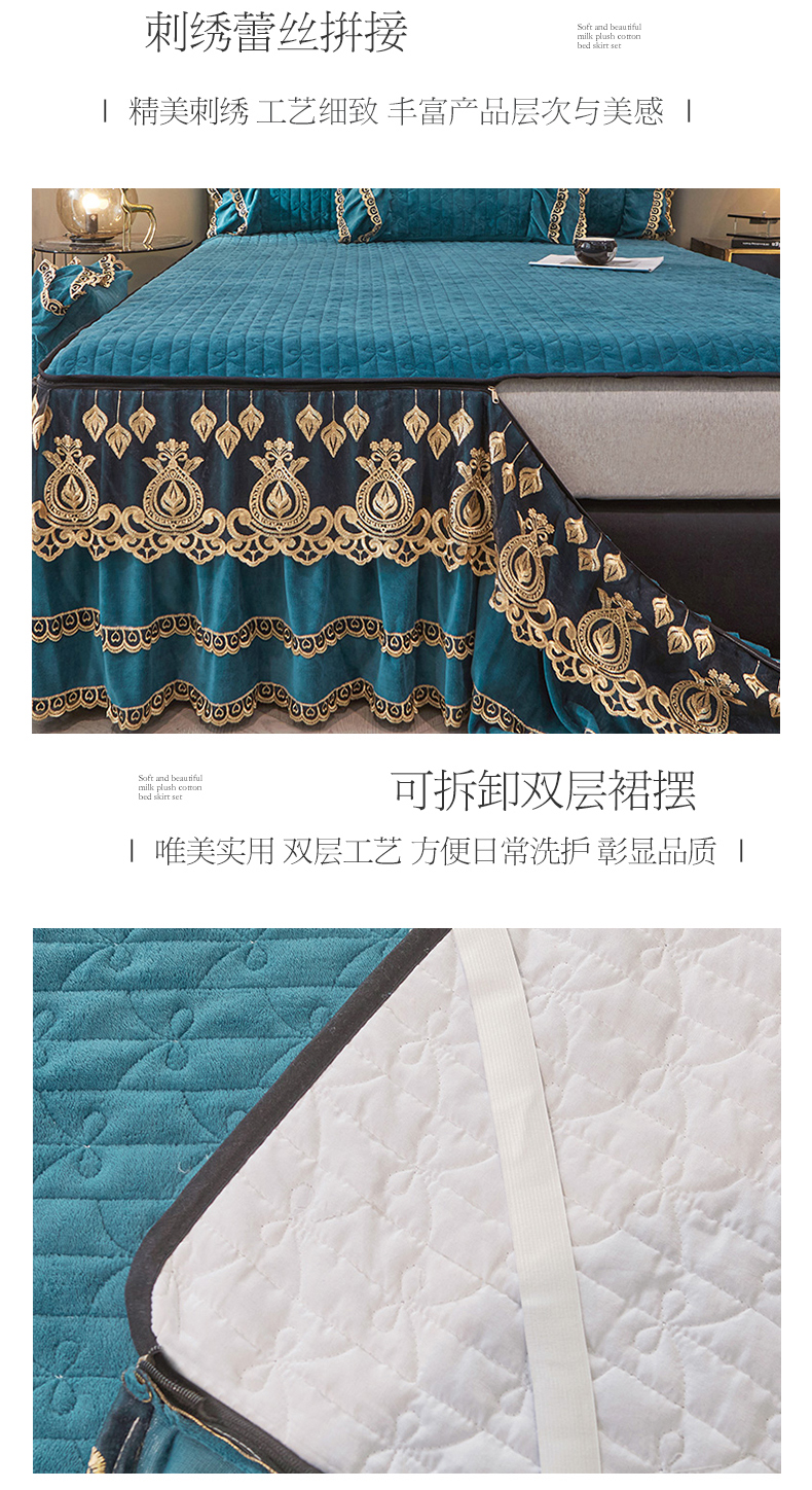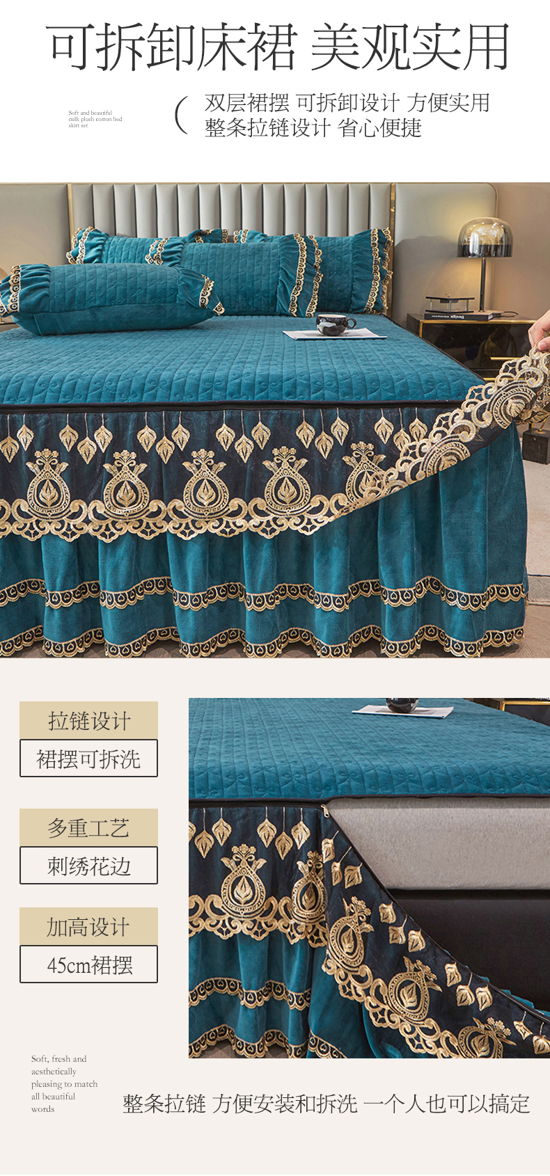 • 91家纺网 家纺一手货源 找家纺 虹星家纺 2023新款牛奶绒夹棉蕾丝可拆卸床裙系列四件套 梦幻巴黎 海兰