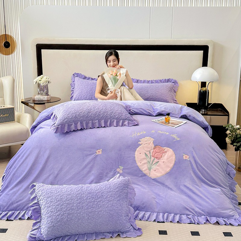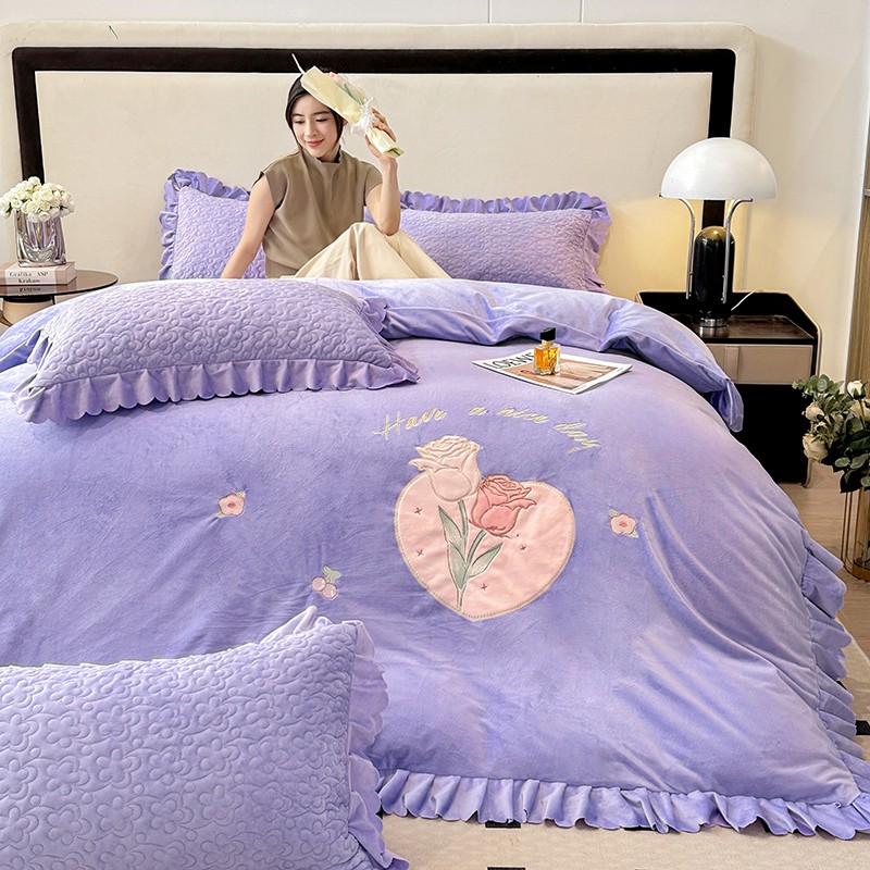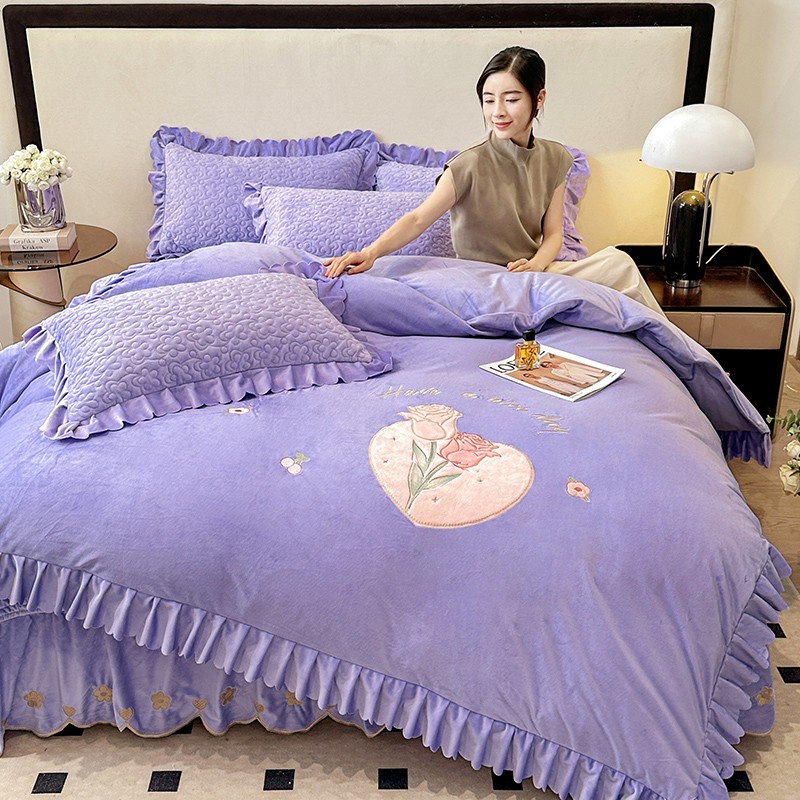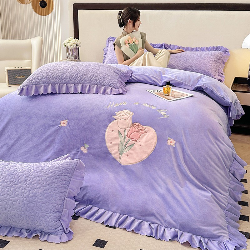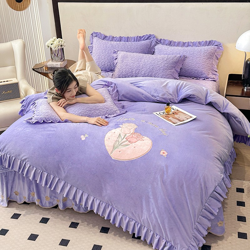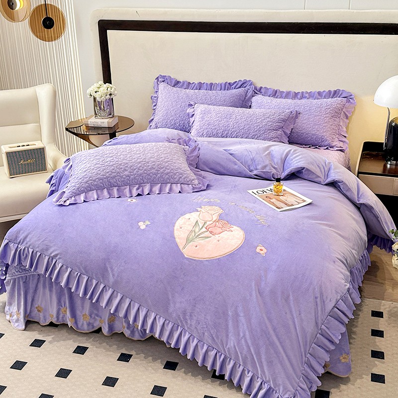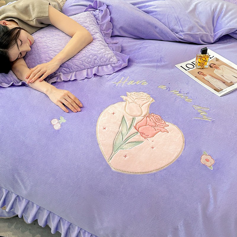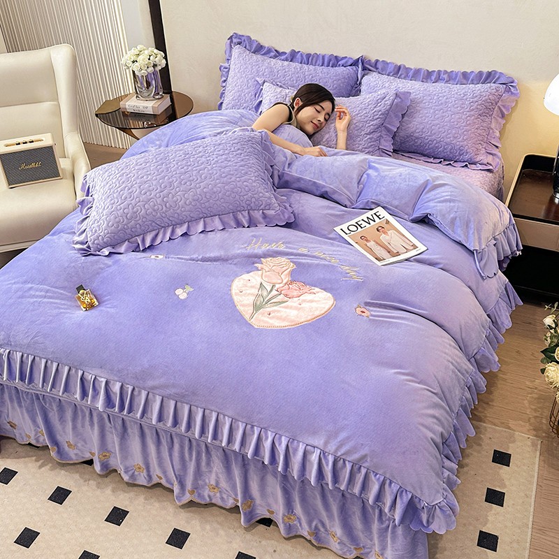 漫布云2025秋冬新款11斤230g全消光牛奶绒夹棉床盖款四件套纯色蕾丝花边刺绣床裙款床盖,蝶恋花-梦幻紫, 蝶恋花-嫩黄, 蝶恋花-新芽绿 ,蝶恋花-婴儿蓝 ,蝶恋花-樱花粉