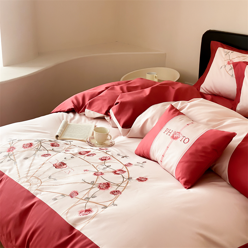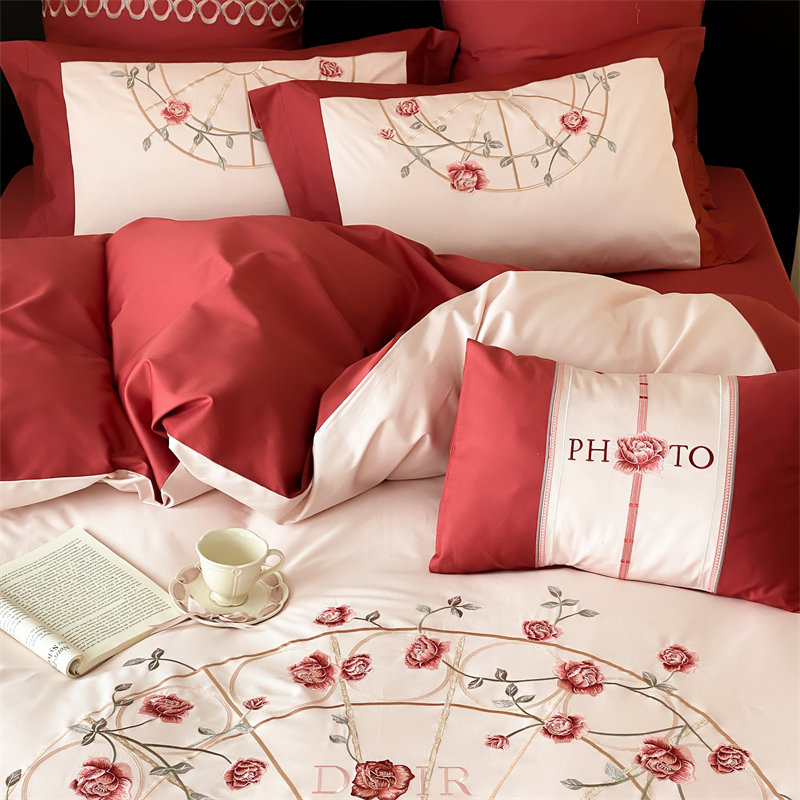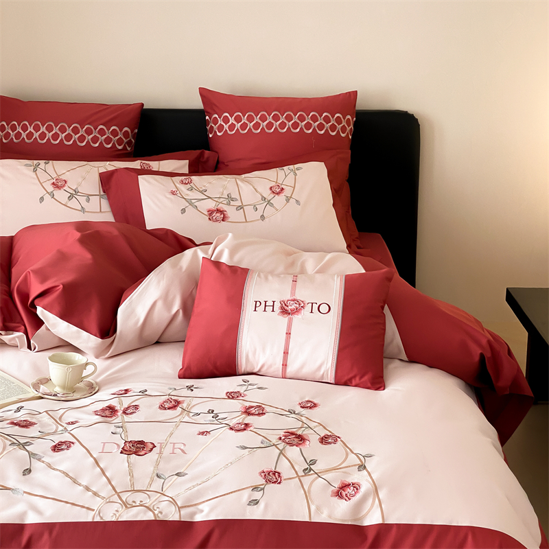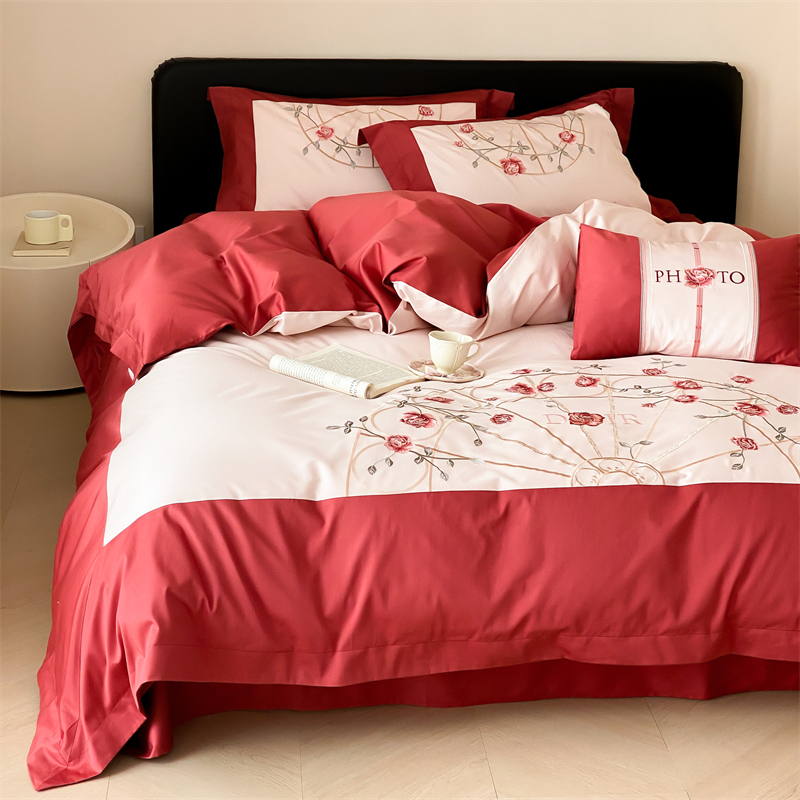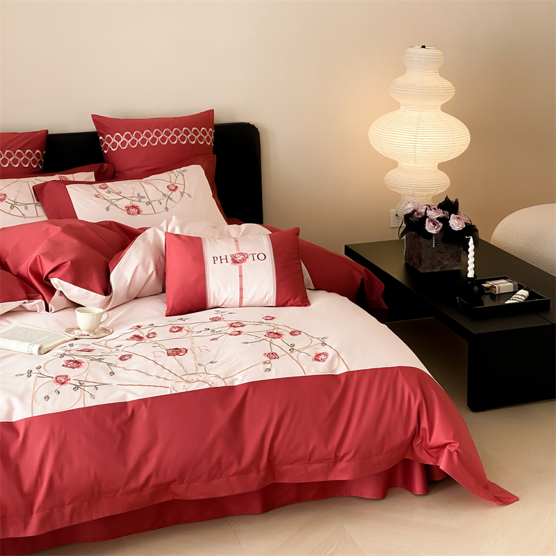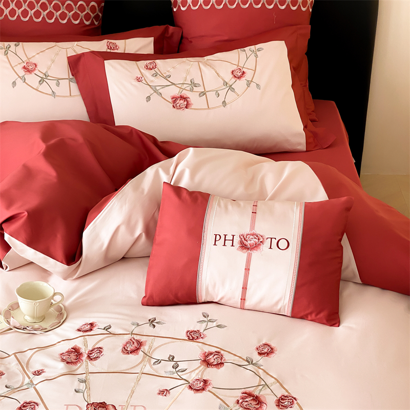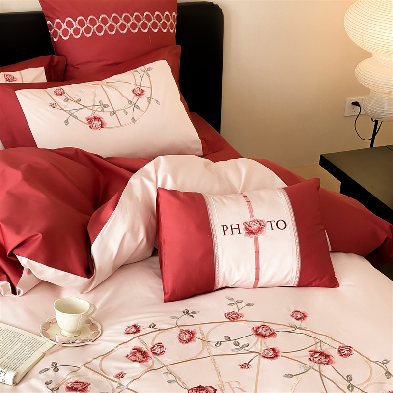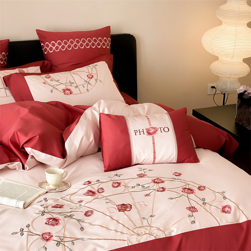 商品名称:曼布缇 2025春夏新品100S澳棉长绒棉绣花四件套-香榭庄园 香榭庄园-红