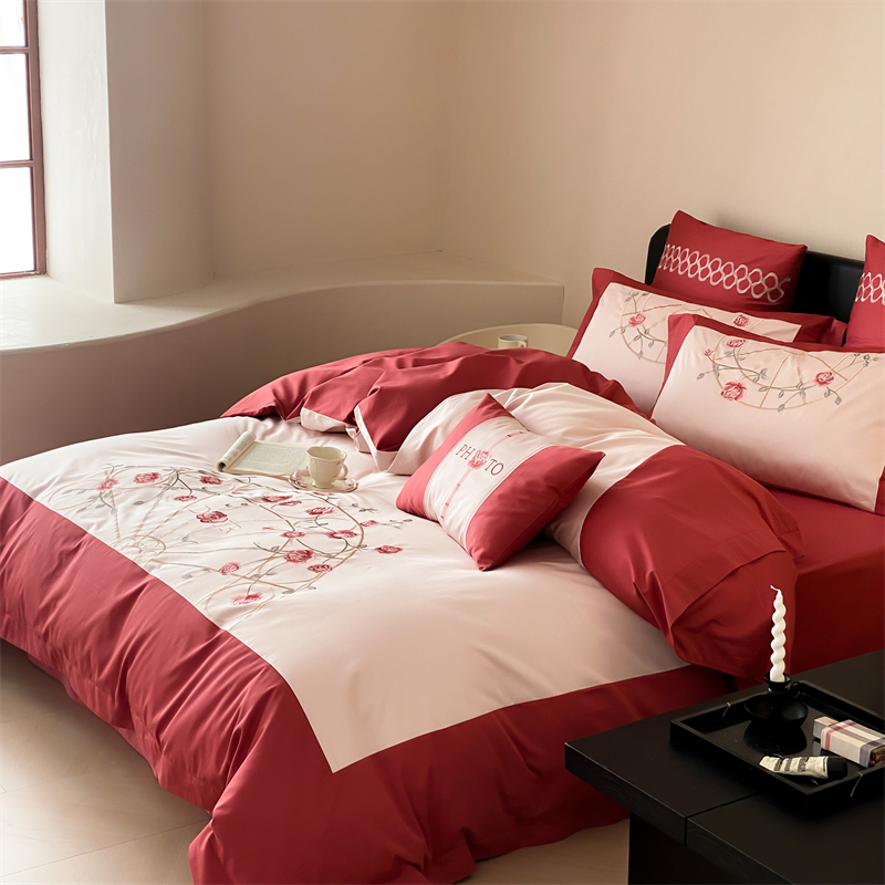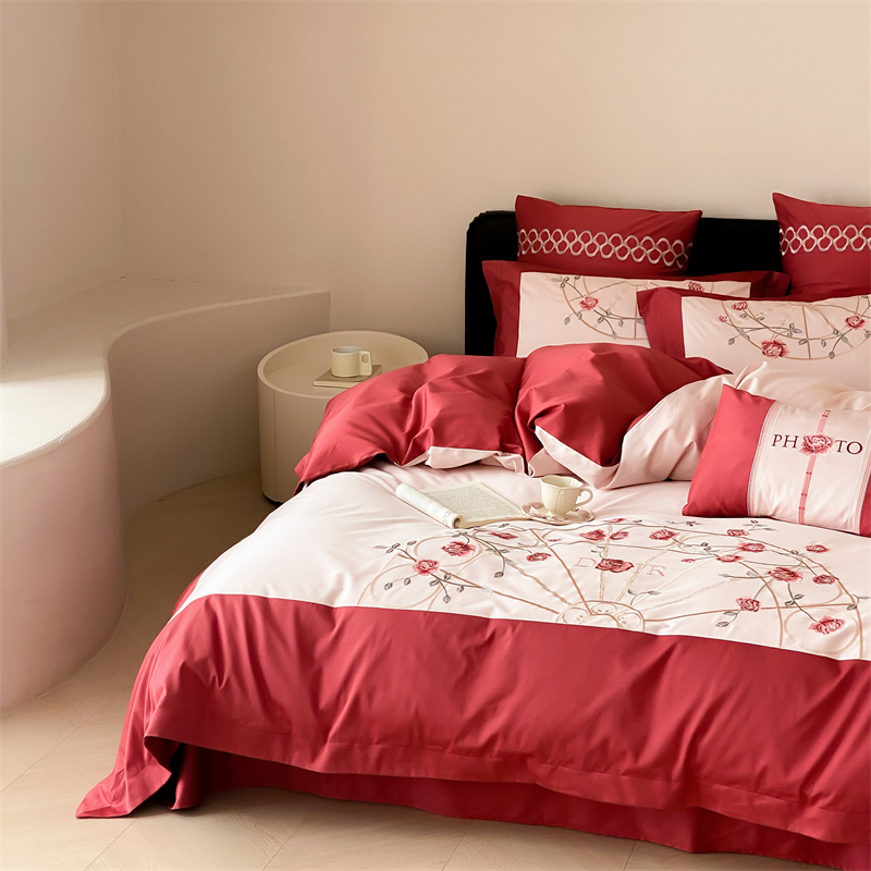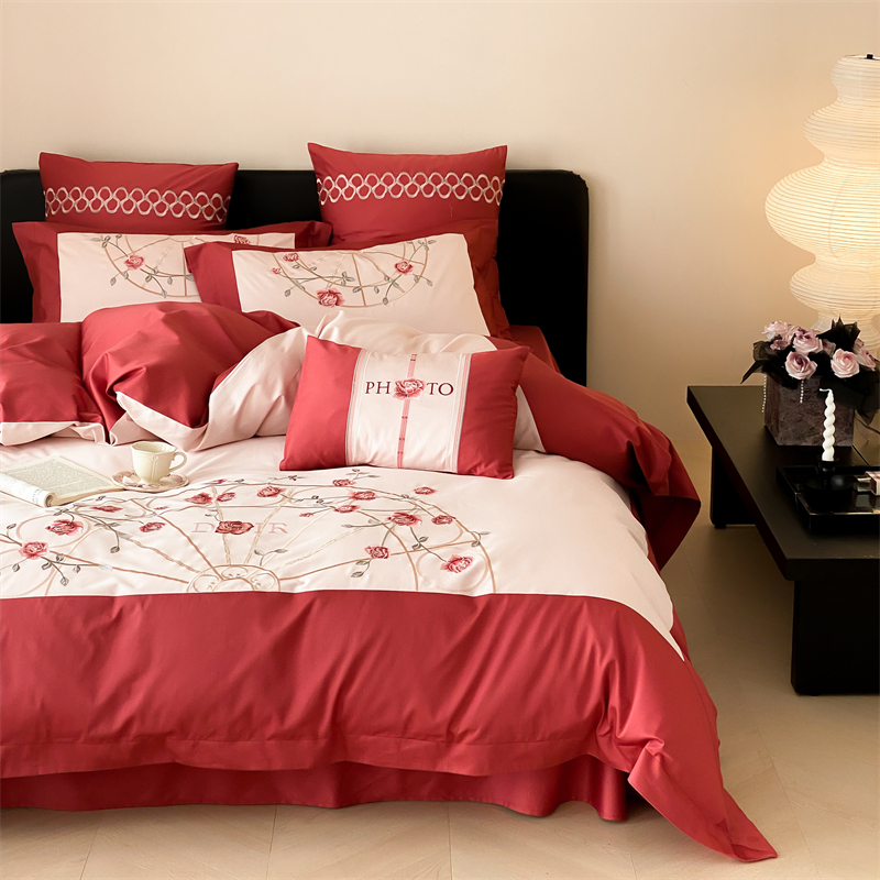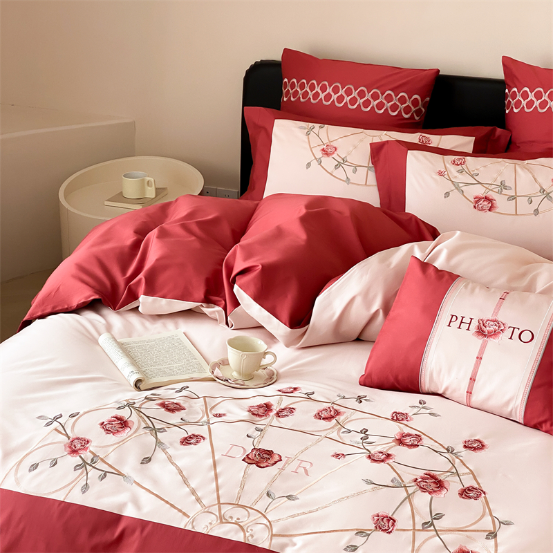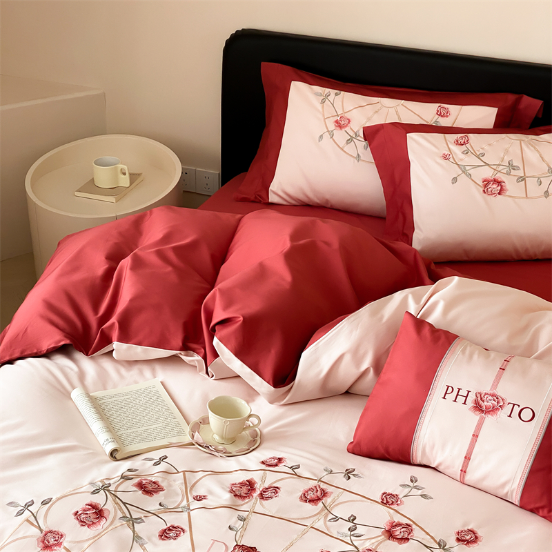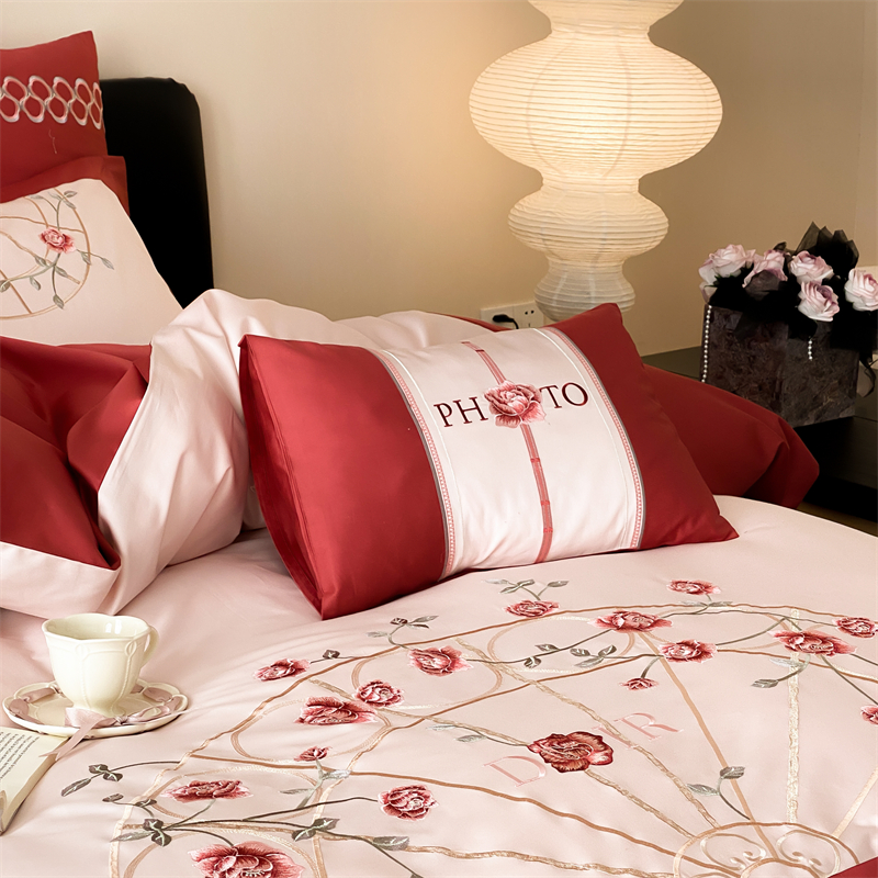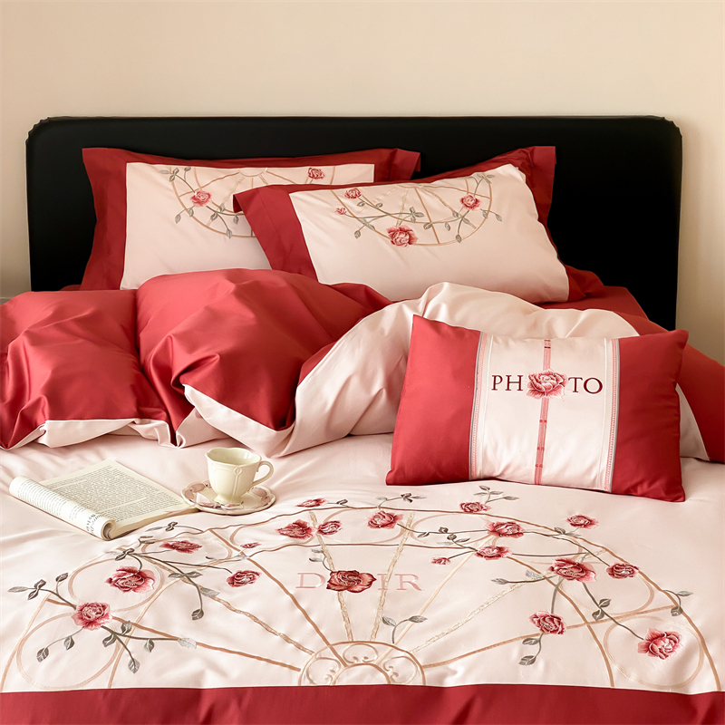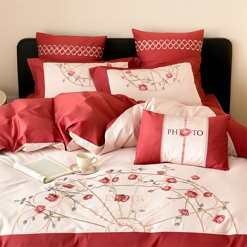 商品名称:曼布缇 2025春夏新品100S澳棉长绒棉绣花四件套-香榭庄园 香榭庄园-红