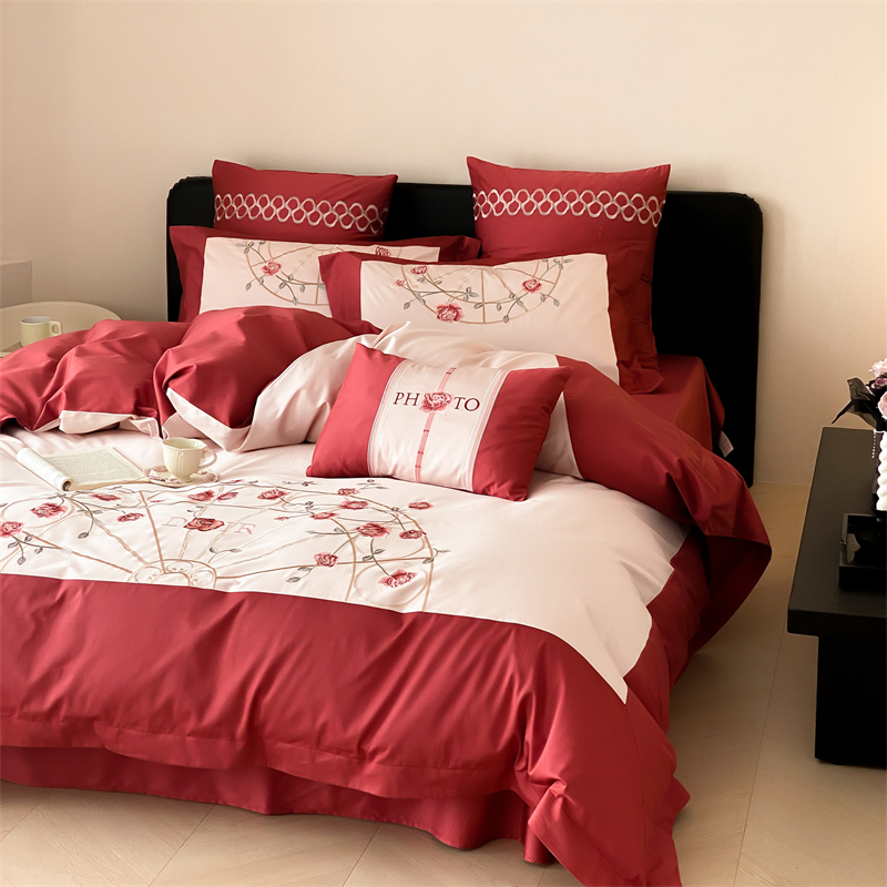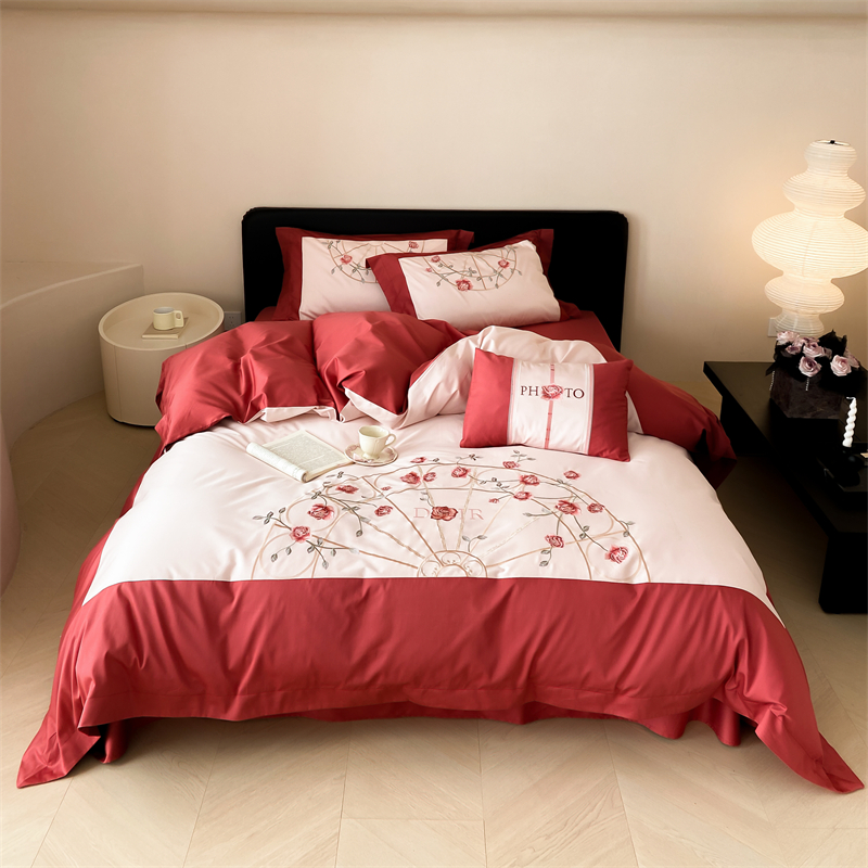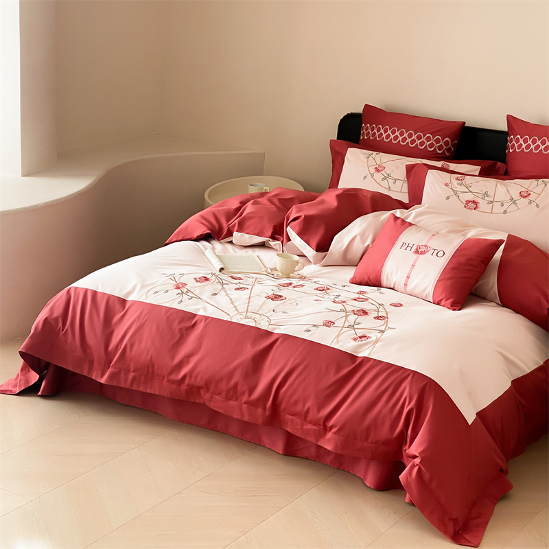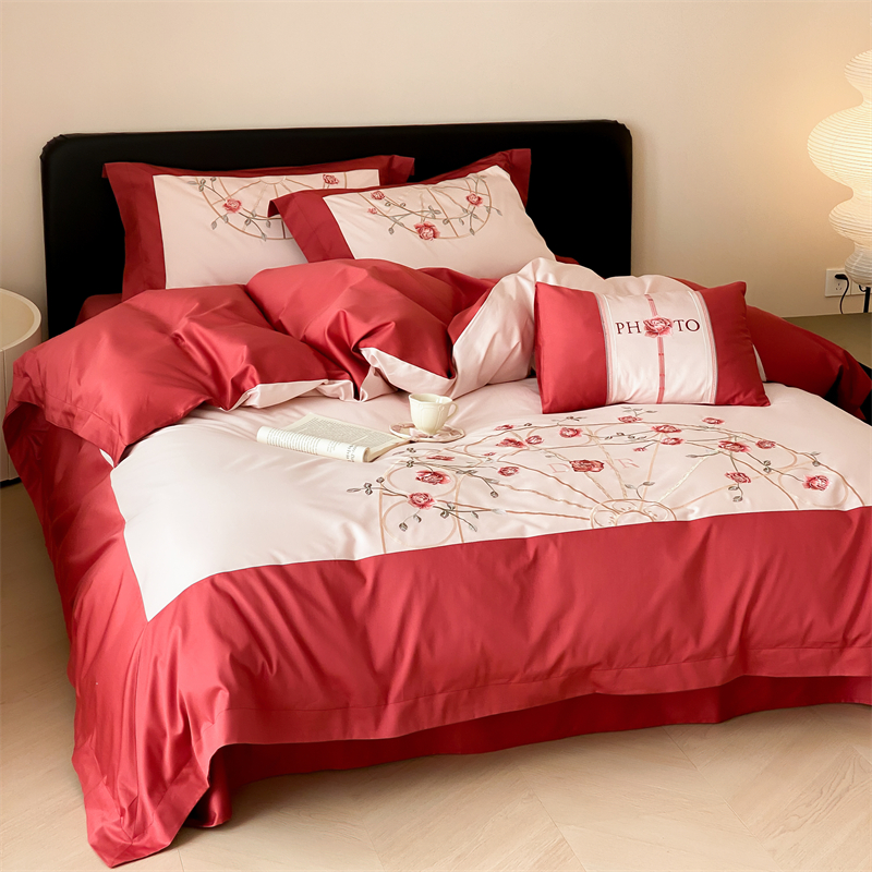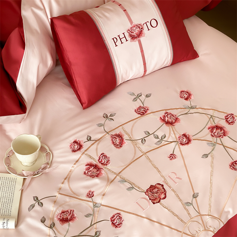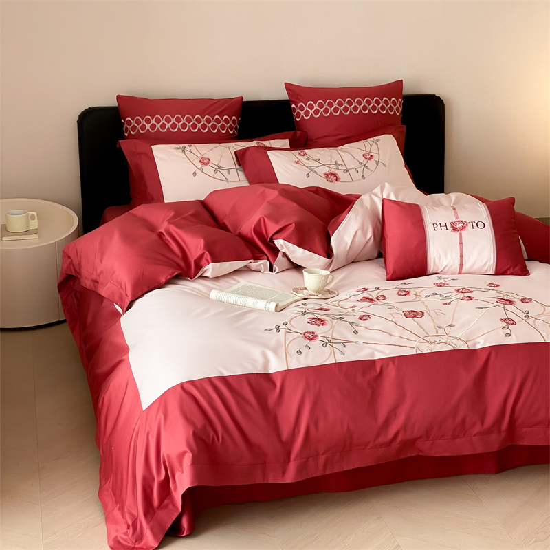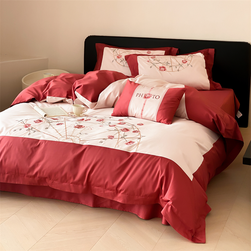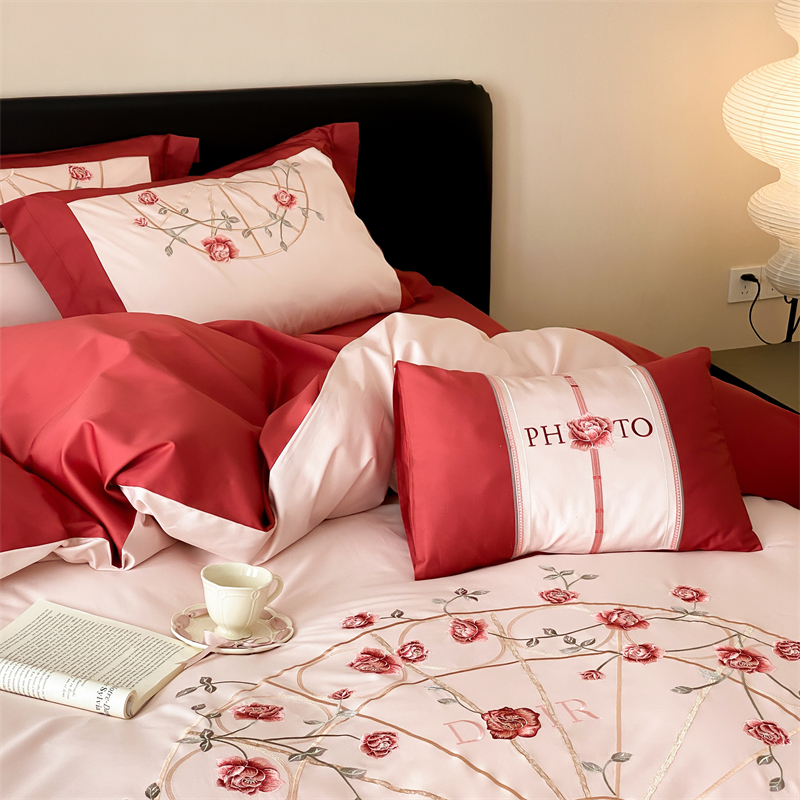 商品名称:曼布缇 2025春夏新品100S澳棉长绒棉绣花四件套-香榭庄园 香榭庄园-红