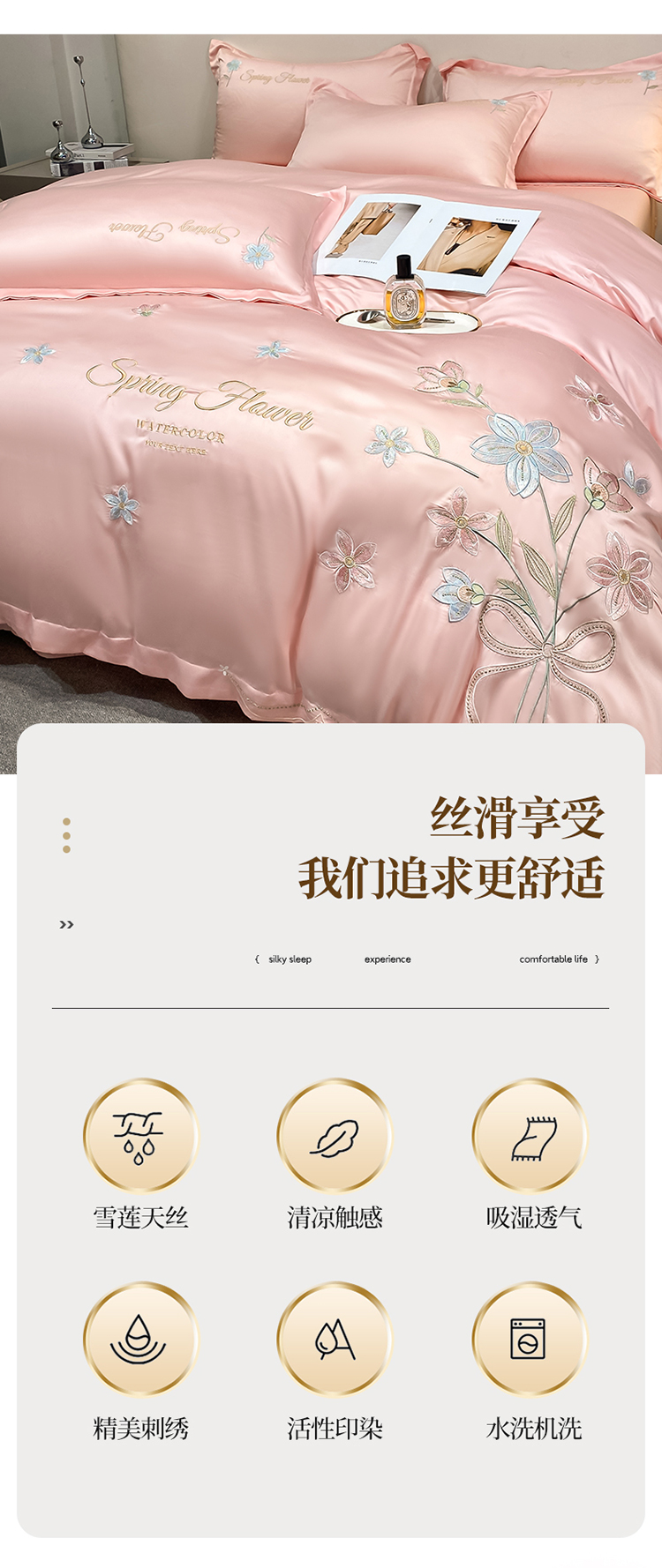 商品名称:(总)爱家 2025新款雪莲天丝刺绣四件套-春日恋曲(床盖加20)
