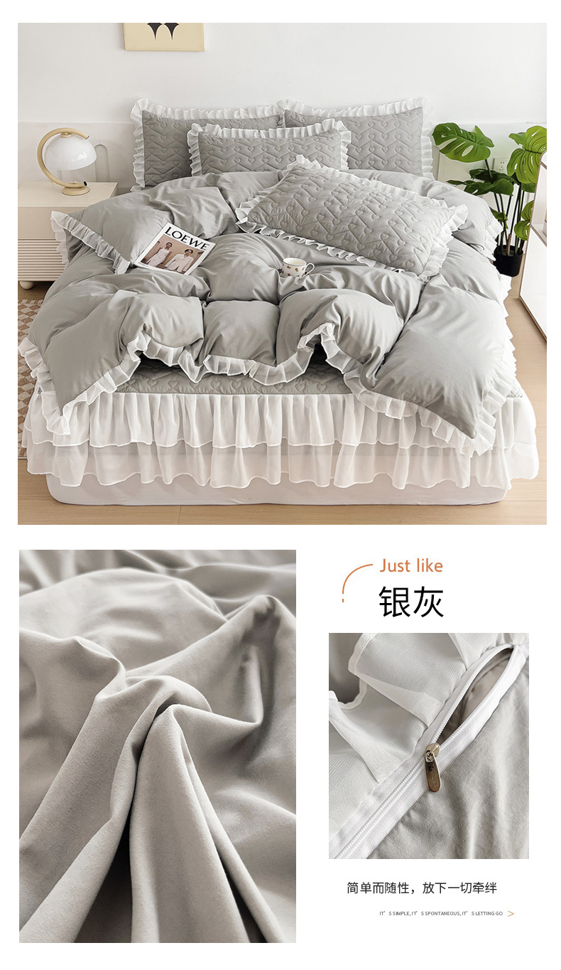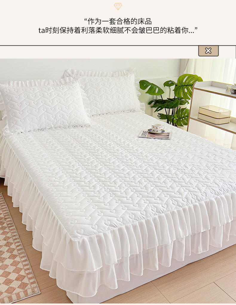 (总)屹成家纺2025新款水晶绒夹棉绗缝蕾丝床裙三件套(塞纳河畔)床裙单件起售价不低于105元,大红,豆沙,翡翠绿,粉玉,橄榄绿,蔚蓝,银灰