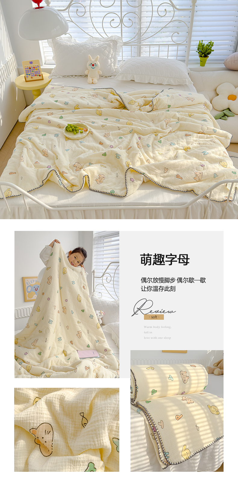 商品名称:芯恋 2025新款母婴级全棉皱皱纱儿童被双层纱夏被 萌趣字母