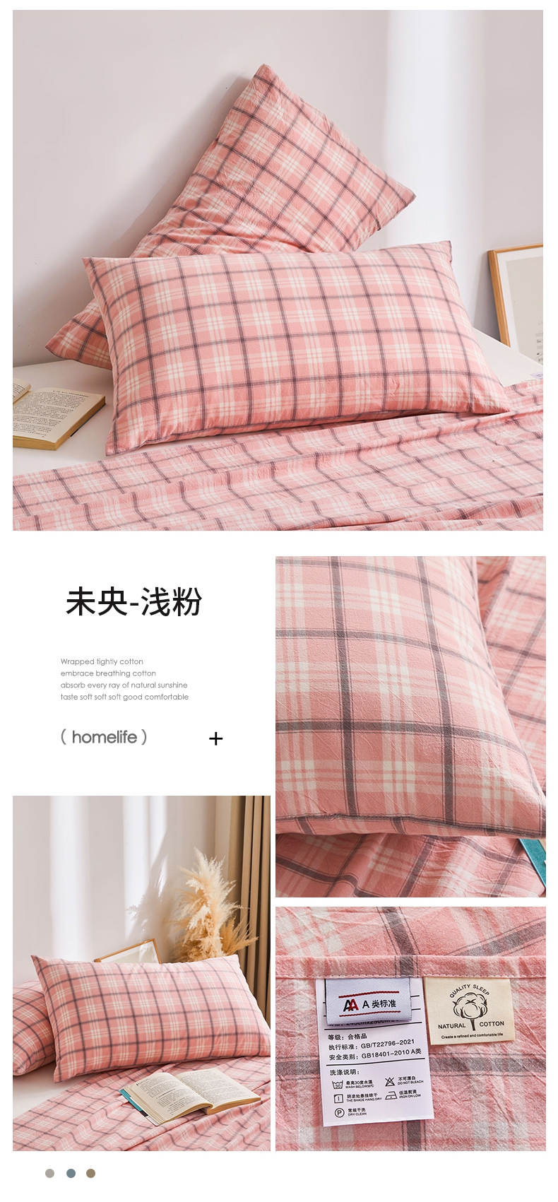 商品名称:雅萱家纺 2024新款A类色织全棉水洗棉单枕套 未央-浅粉