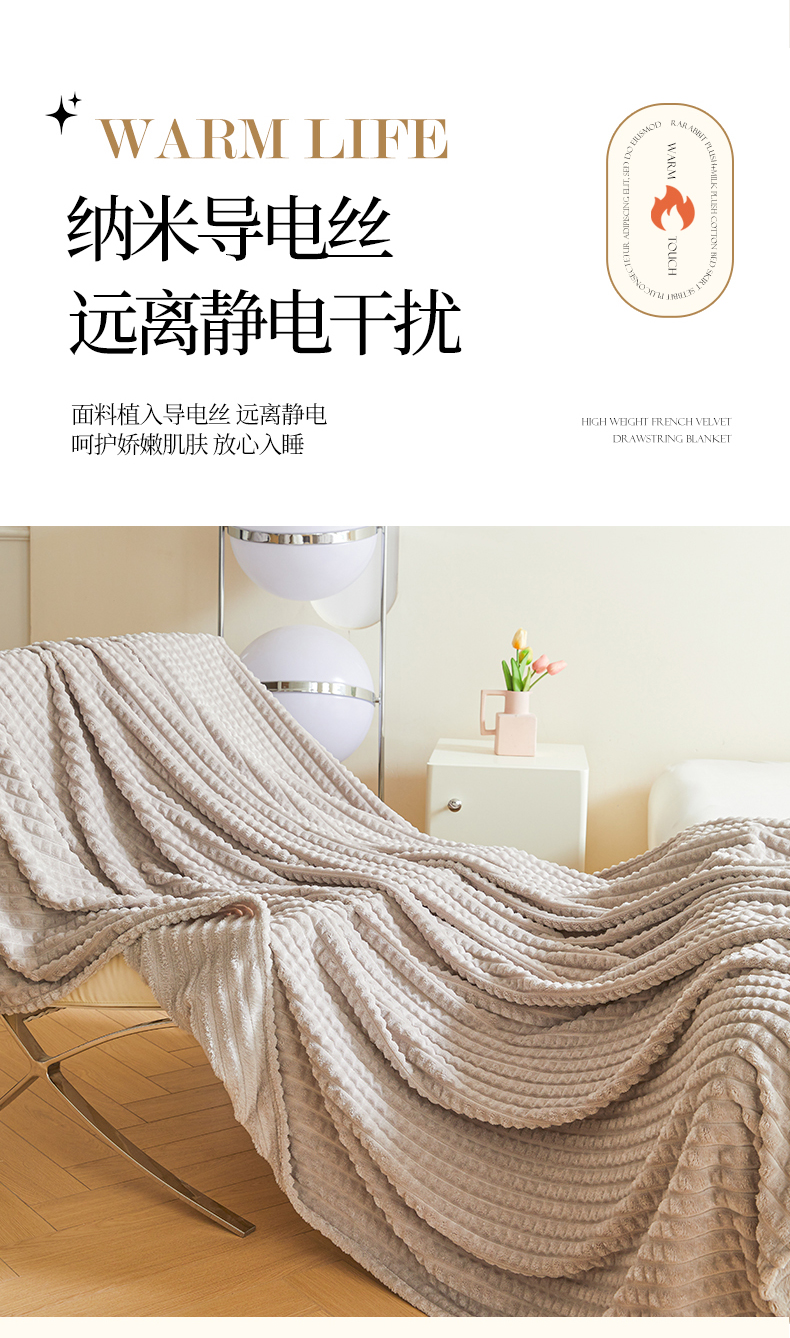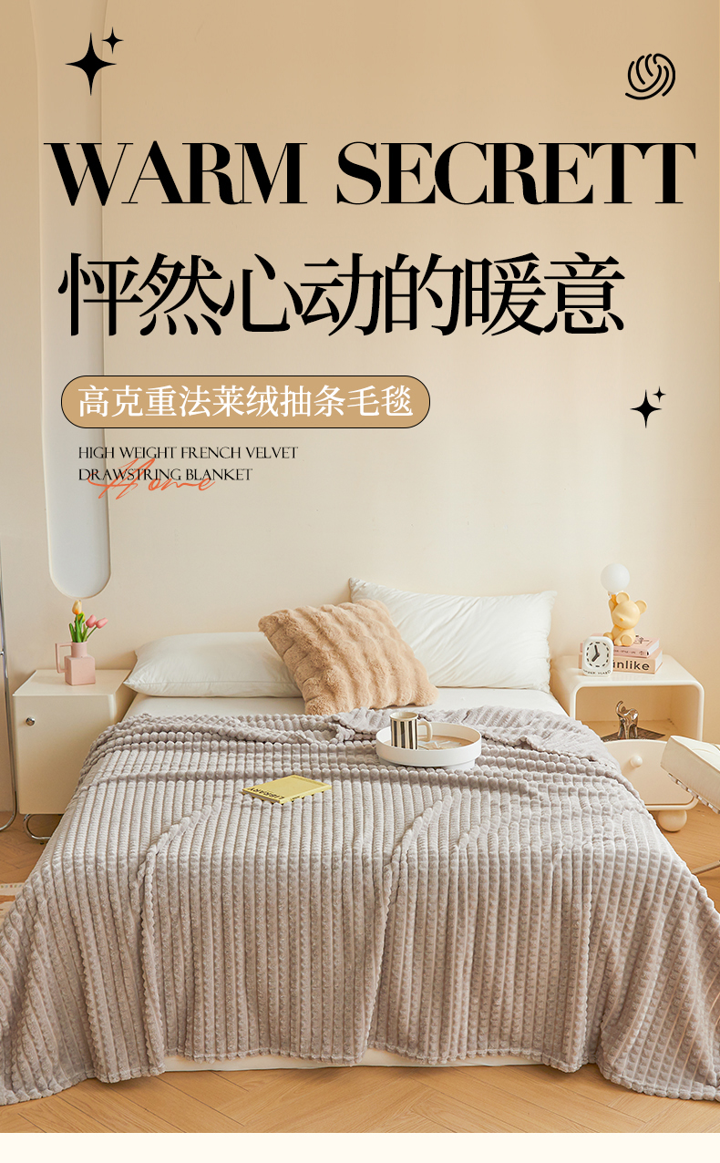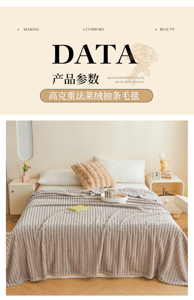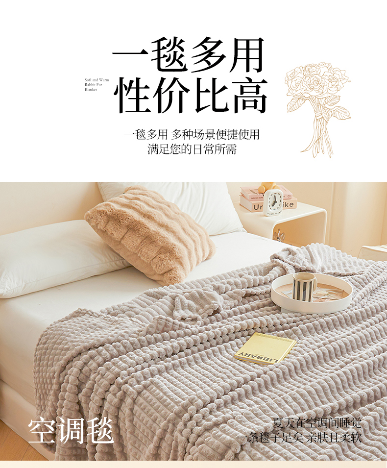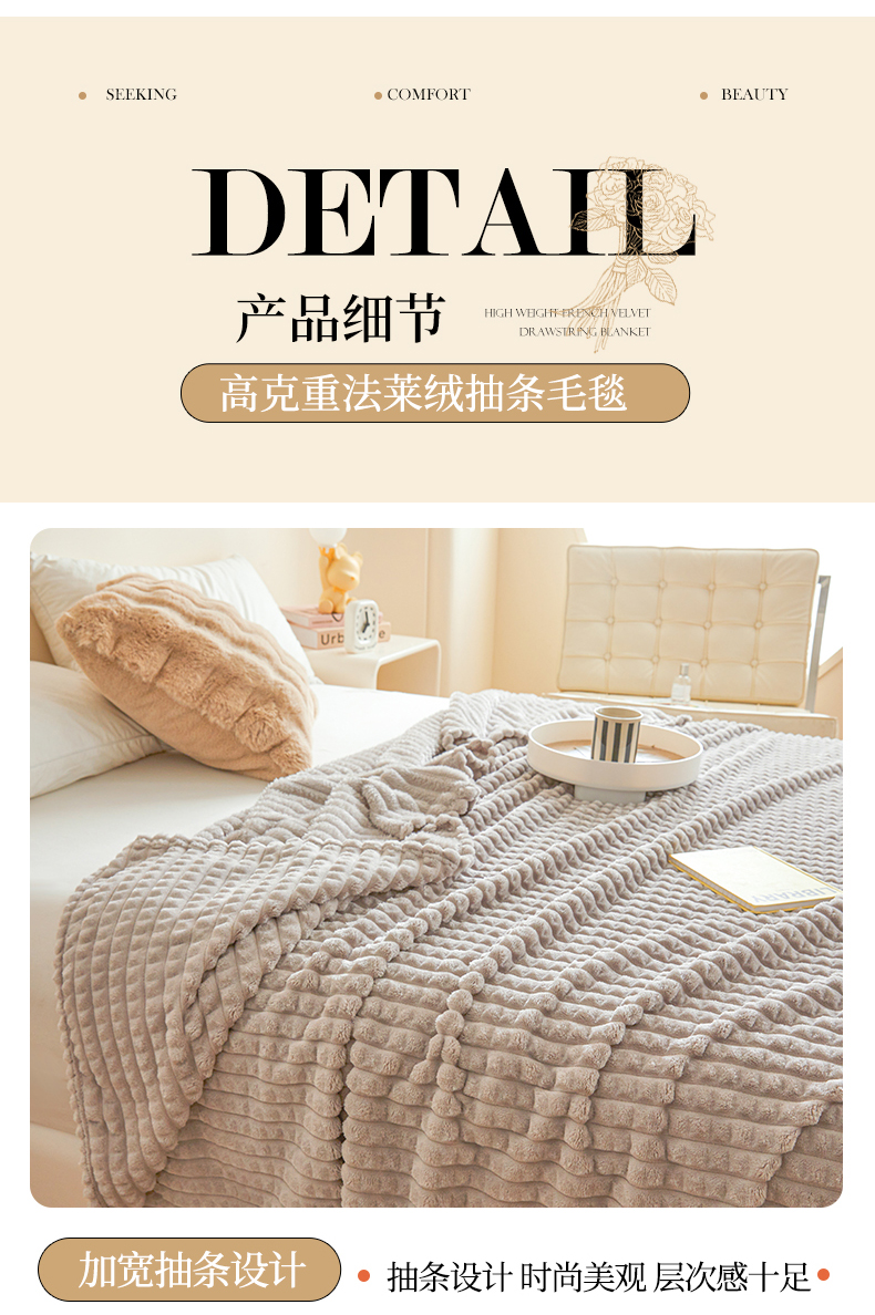 商品名称:予梦家纺 2024新款加厚纯色宽抽条剪花仿兔毛绒牛奶绒法兰绒盖毯(可供跨境) 浅灰格