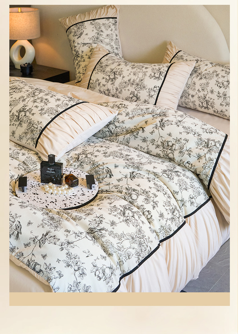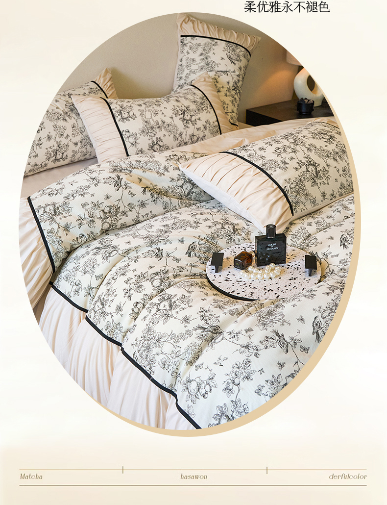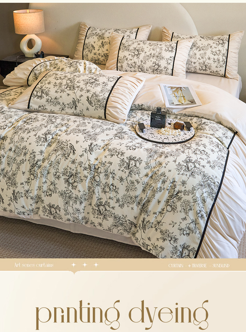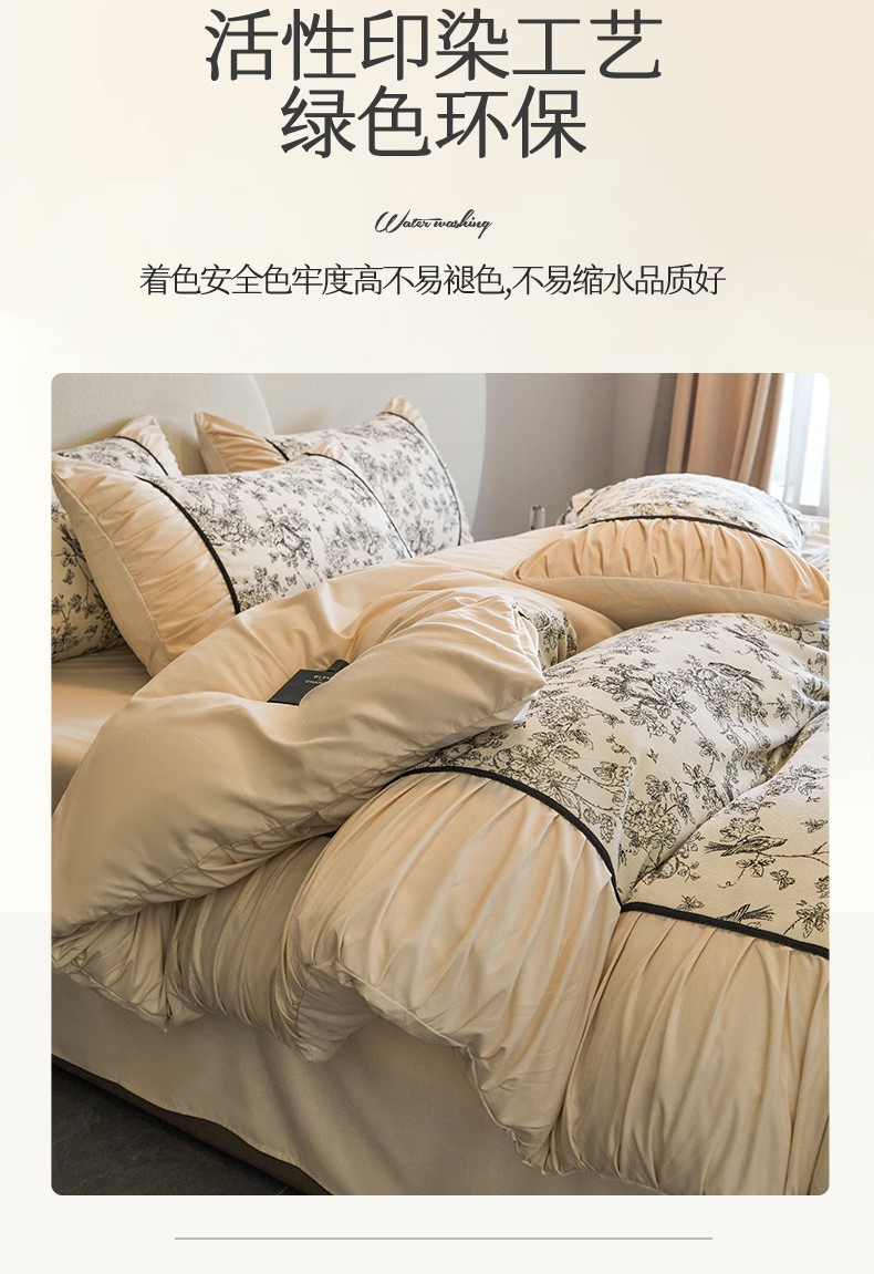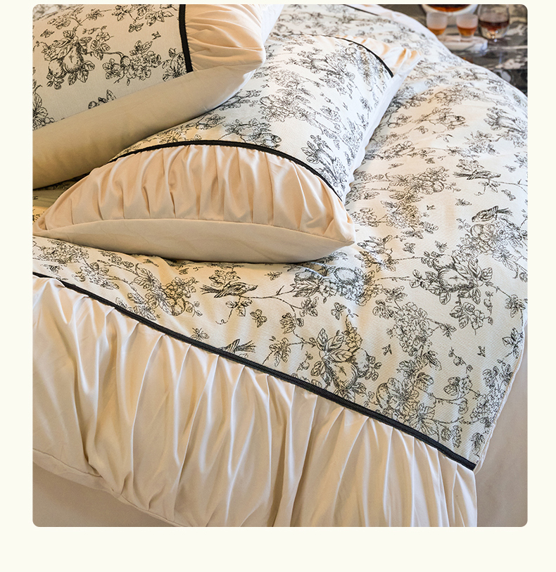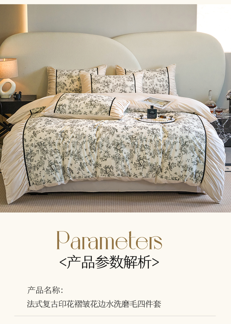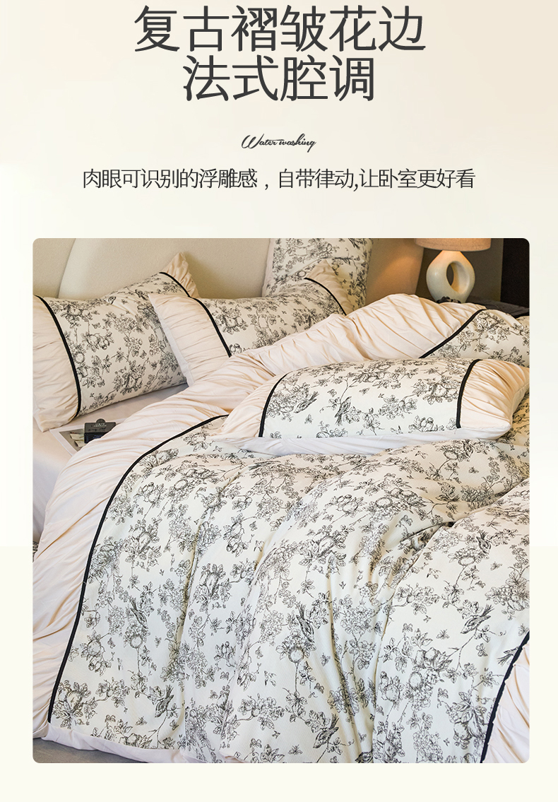 一左一右 2024秋冬新款法式复古印花褶皱花边水洗磨毛四件套-场景二(提供买家秀) 奶油白