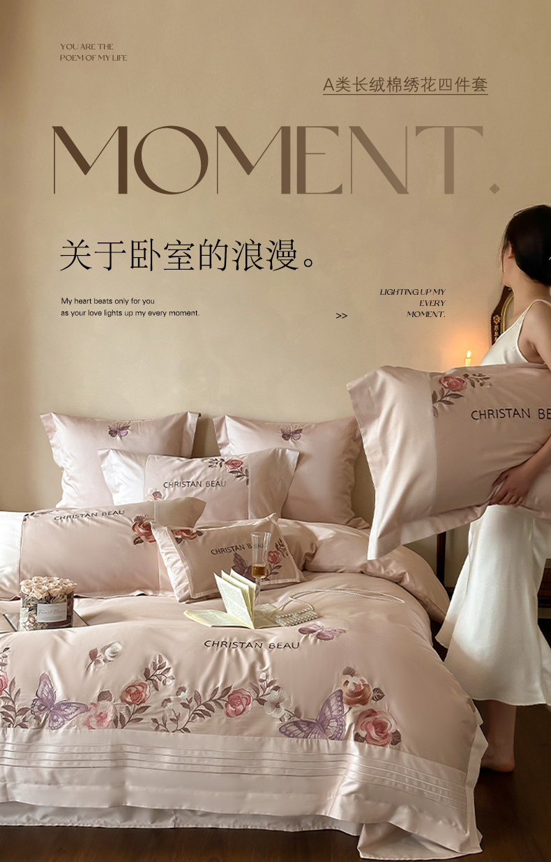 (总)云栖家居 2025秋冬新款50支纯色双拼加厚全棉磨毛被套刺绣100S纯棉四件套-小蝴蝶系列,粉灰,粉紫,蓝灰,米玉,月光黄